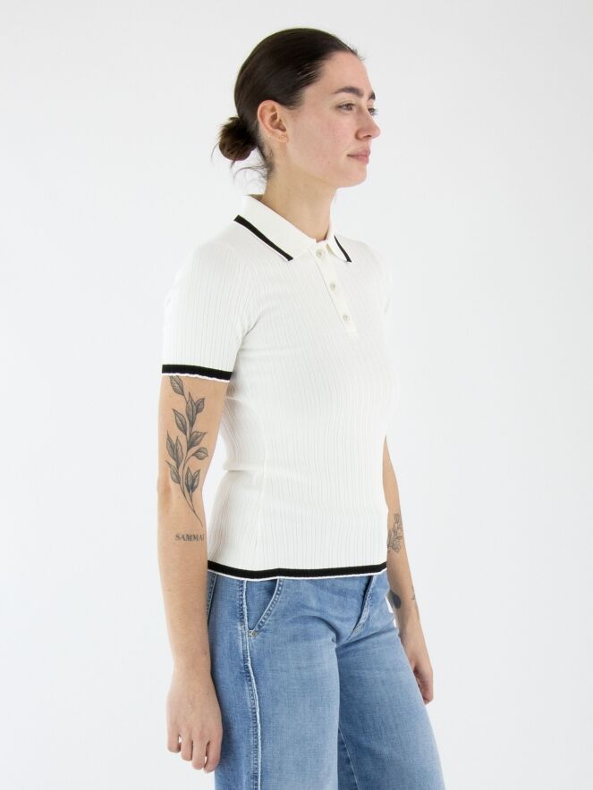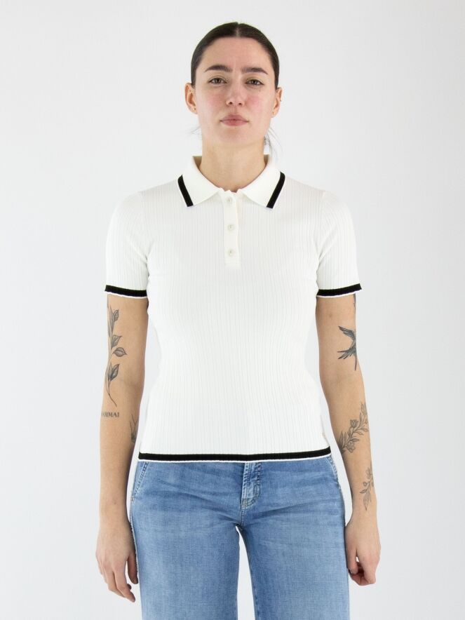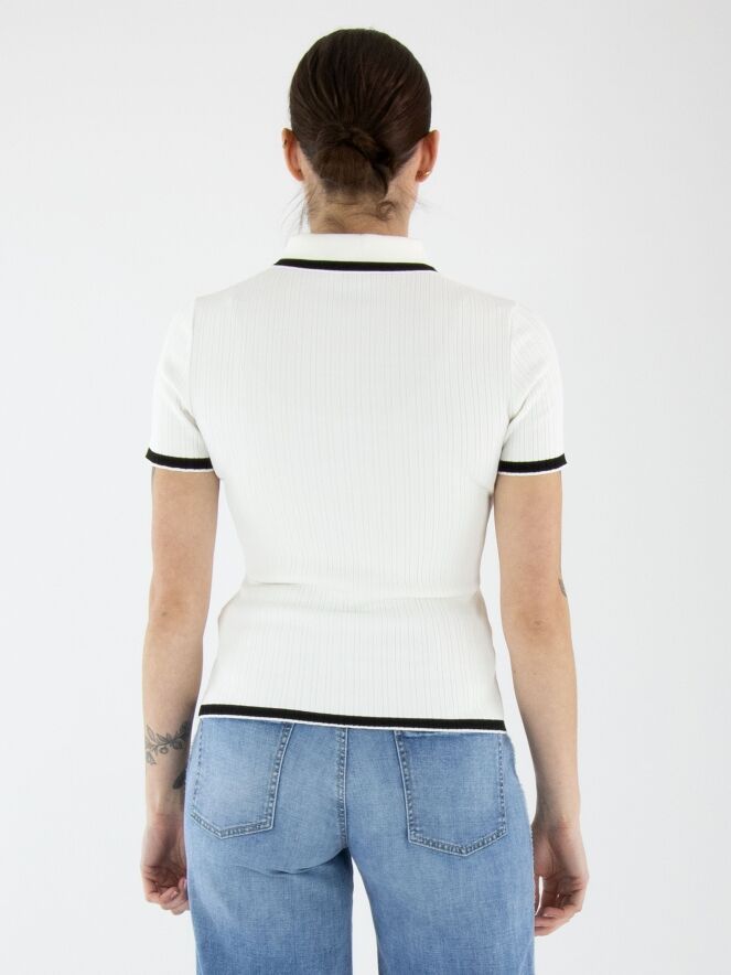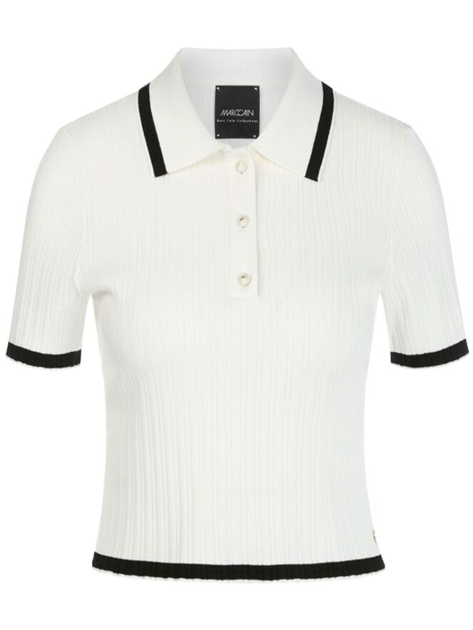 Ein Polo-Shirt von Marc Cain in Cremeweiß. Der Stoff ist gerippt. Das Polo hat einen fein gerippten Strickkragen mit einem schwarzen Streifen entlang des Randes. Dieser Streifen wiederholt sich an den Abschlüssen der kurzen Ärmel und am unteren Saum des Shirts. Dieses Shirt kann bei 30 Grad gewaschen werden.