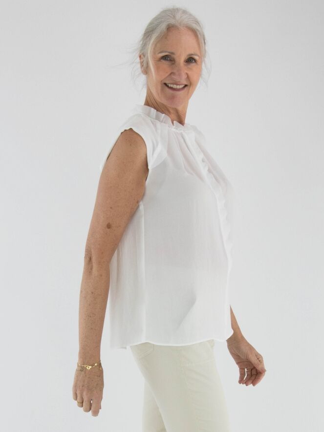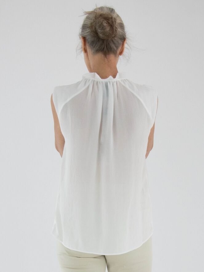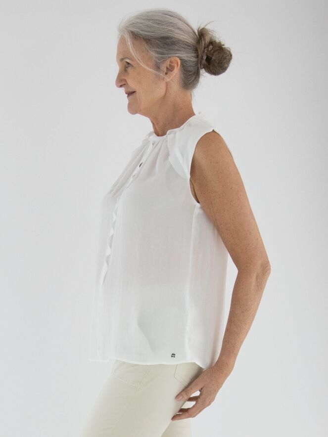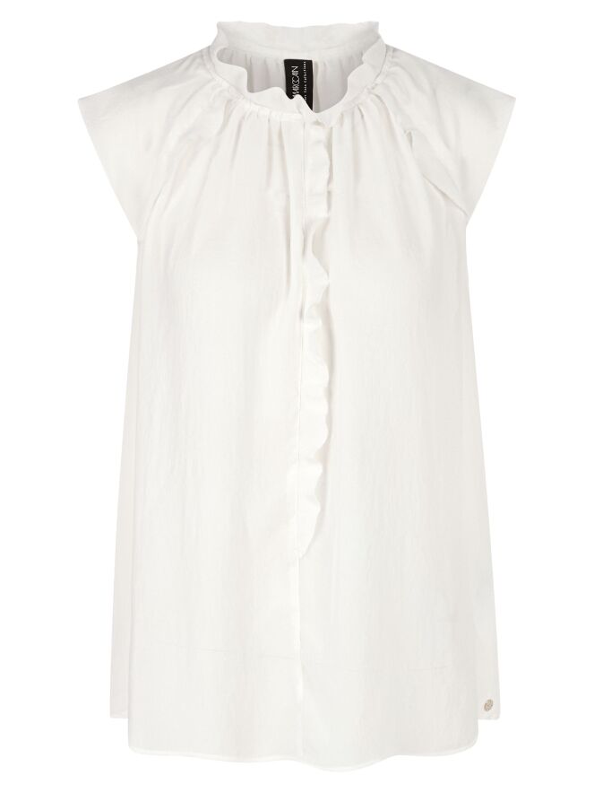 Ein leicht transparenter Top von Marc Cain in Weiß. Entlang des runden Halsausschnitts und der Schulternähte verläuft eine Voile-Biese. In der Mitte der Vorderseite fällt ein Voile-Volant vom Ausschnitt herab. Der Top hat eine leichte A-Linie und kann bei 30 Grad gewaschen werden.