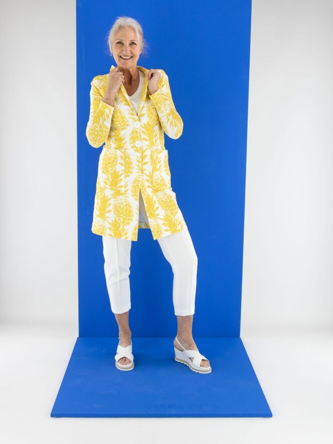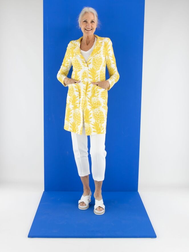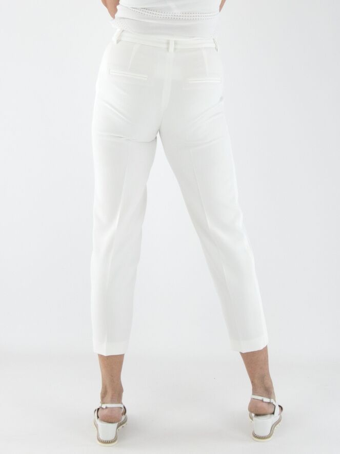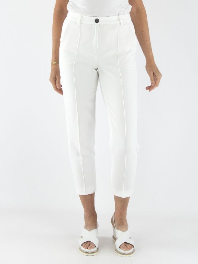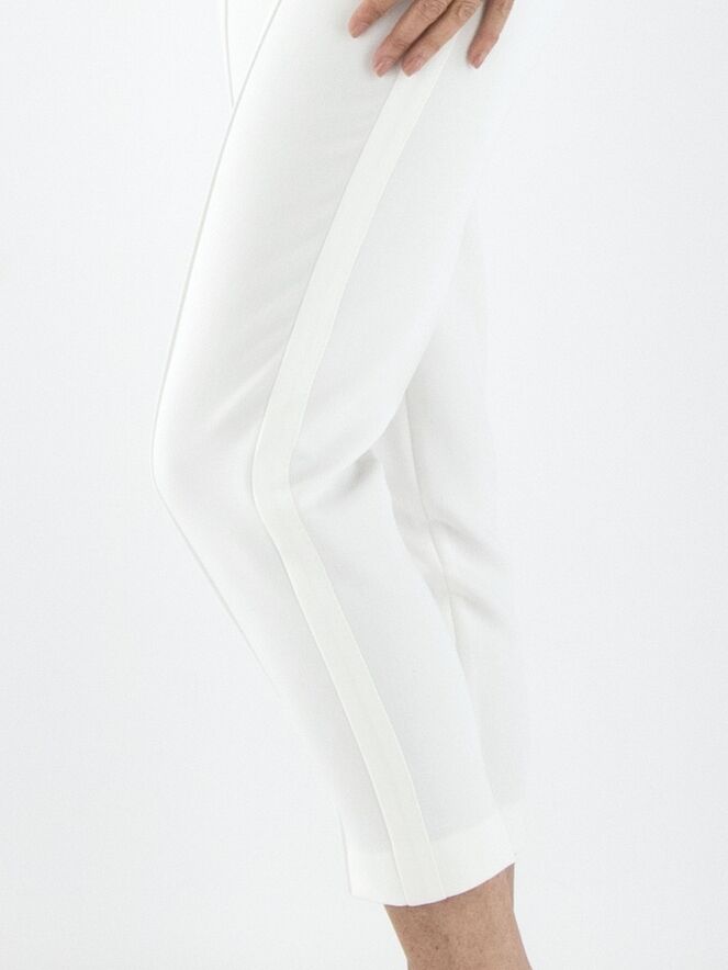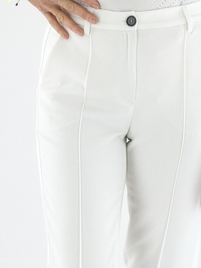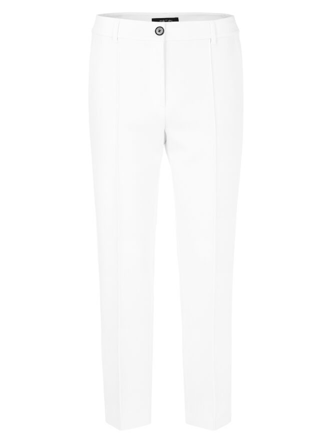 Eine Hose von Marc Cain in Weiß. Entlang der Seiten verläuft eine dekorative Naht. In der Mitte der Hosenbeine befindet sich eine umgekehrte Naht. Die Hose hat Seitentaschen und kann bei 30 Grad gewaschen werden.