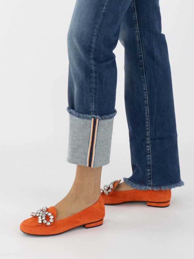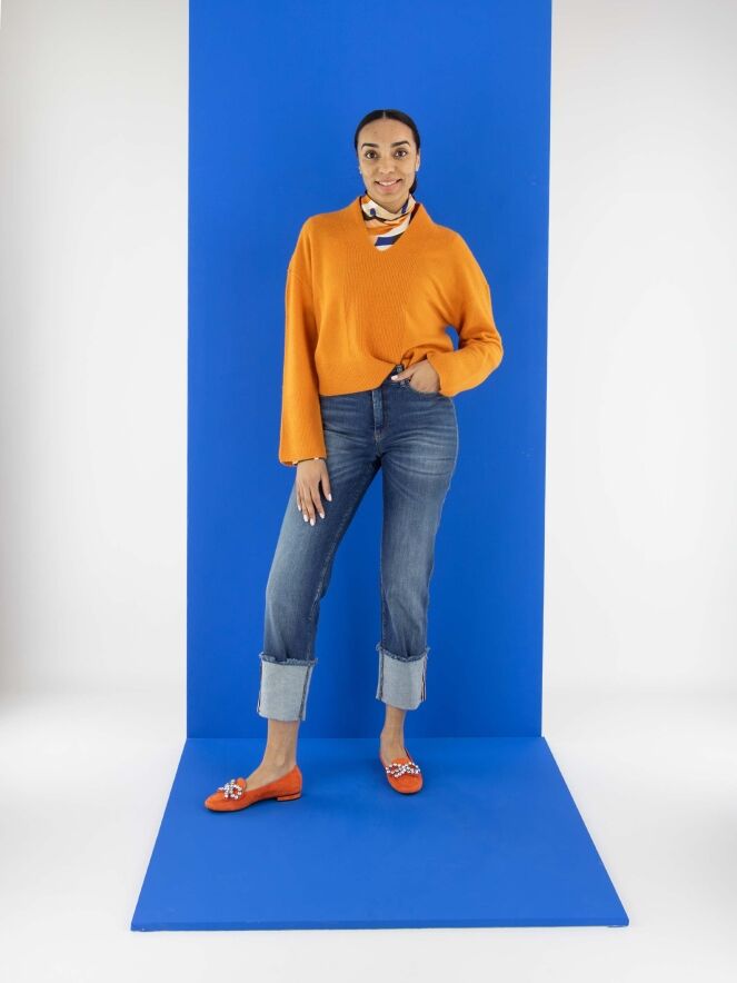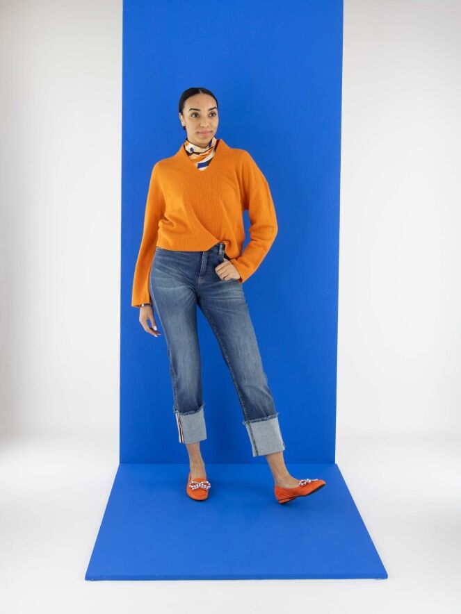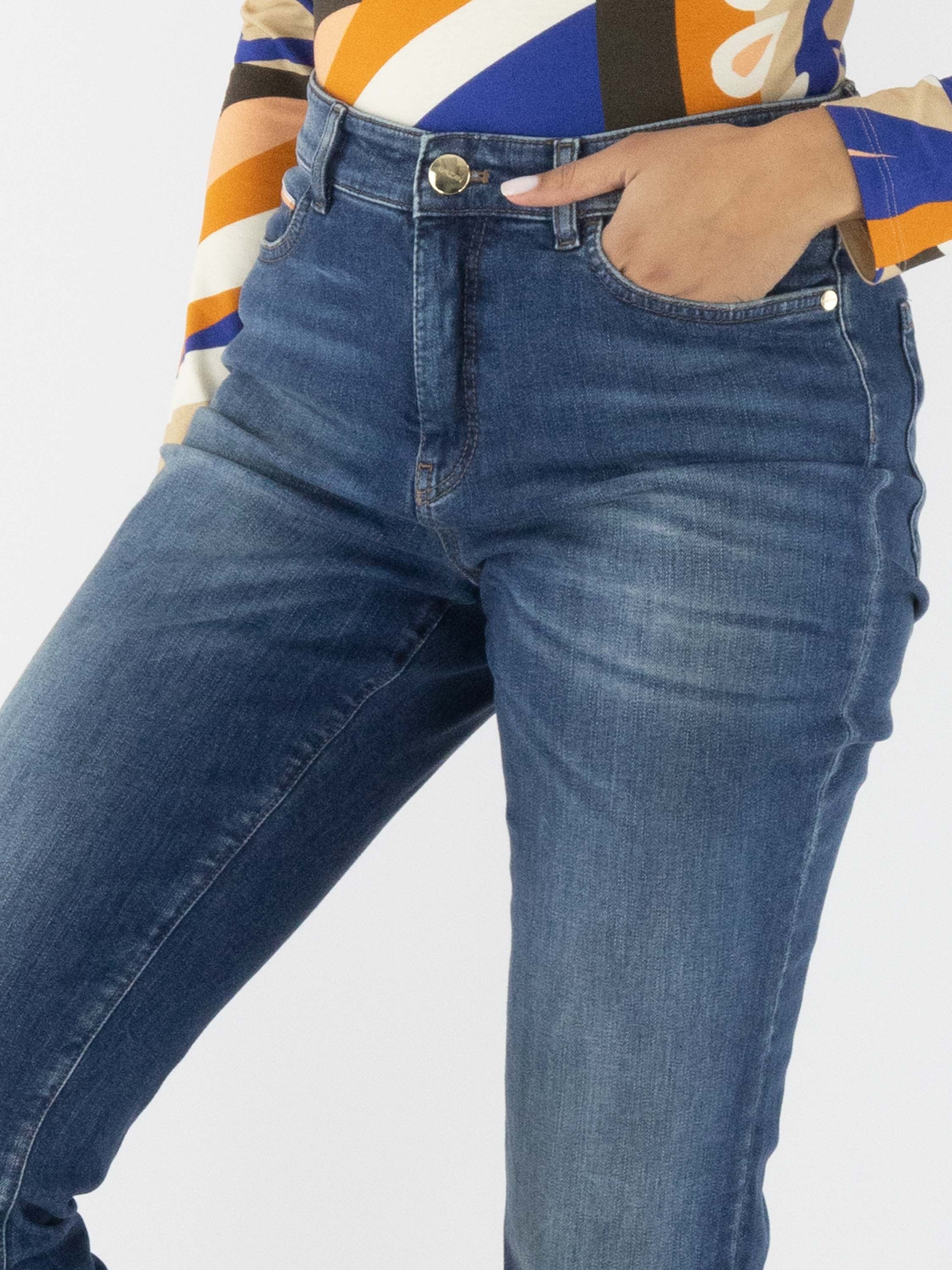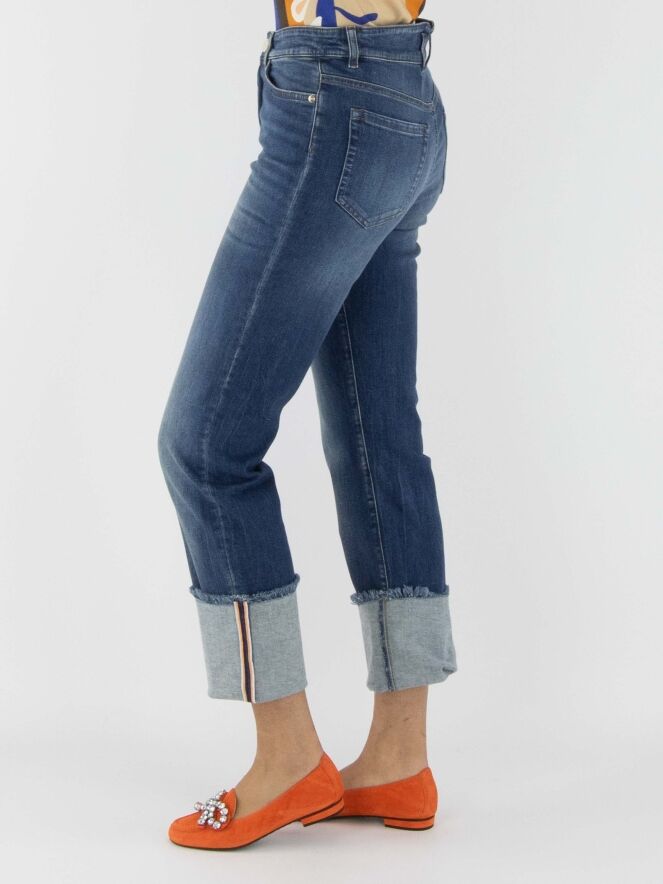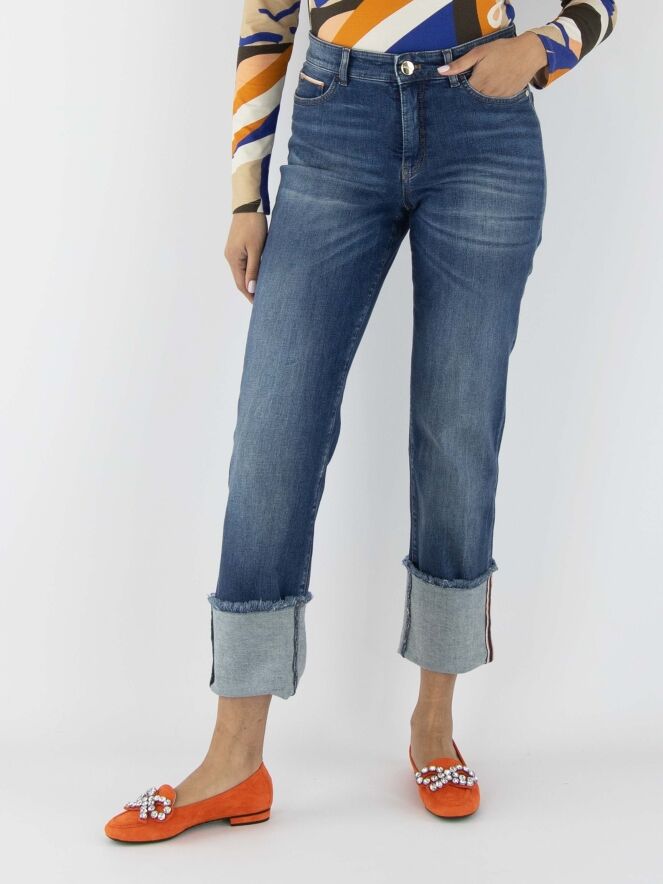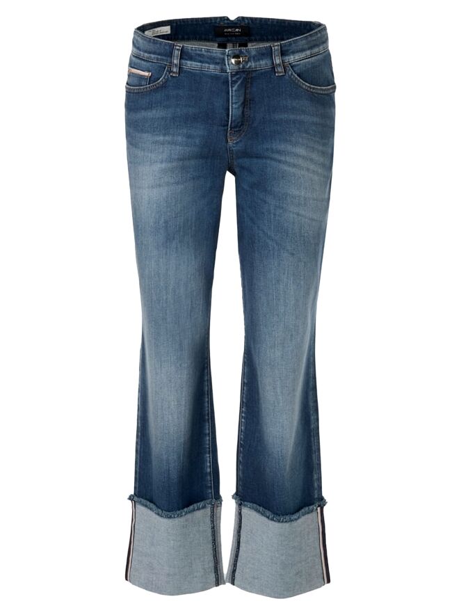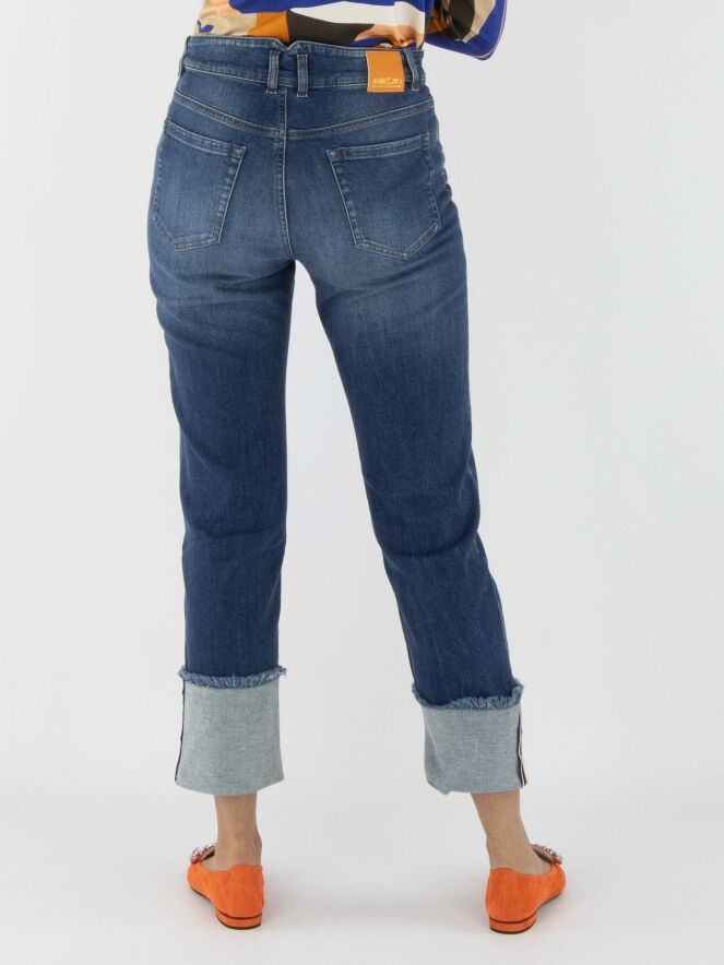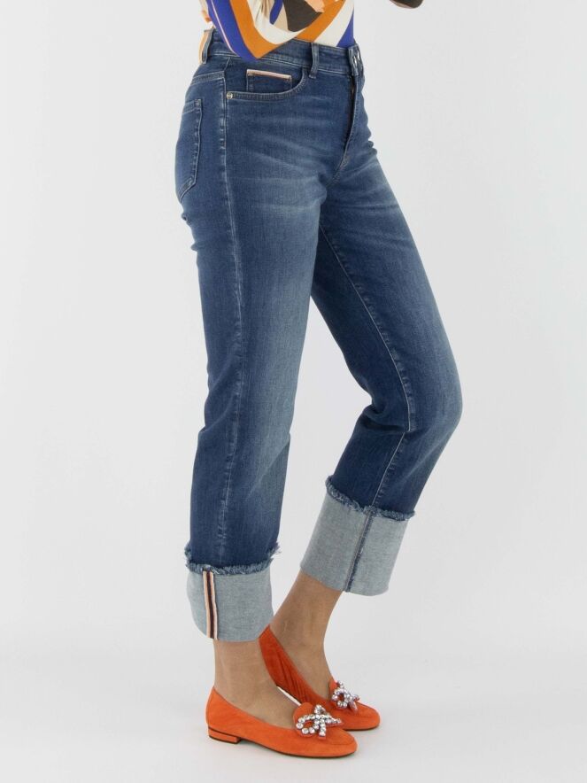 Eine Jeans von Marc Cain in einer kräftigen klassischen Jeansfarbe. Die Jeans hat ein 5-Pocket-Design. Am unteren Ende der Hosenbeine befindet sich ein sehr breiter Umschlag von 15 cm mit fein ausgefranster Kante. Diese Jeans kann bei 30 Grad gewaschen werden.