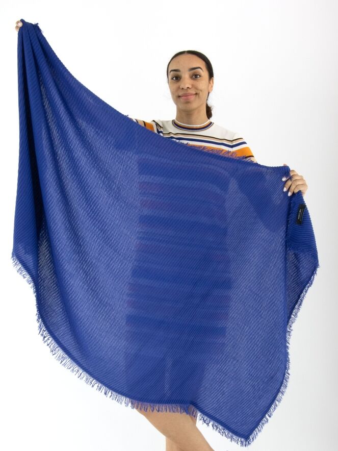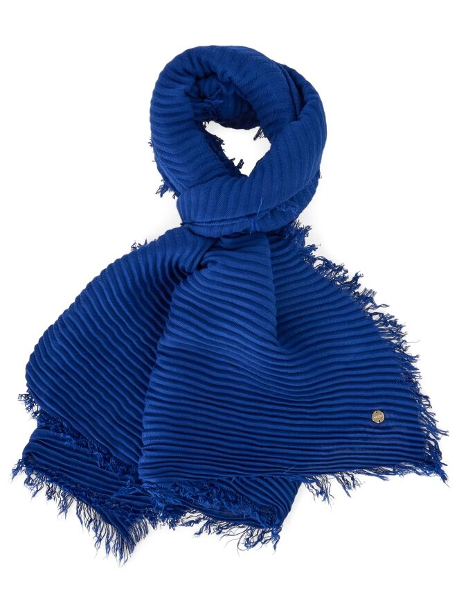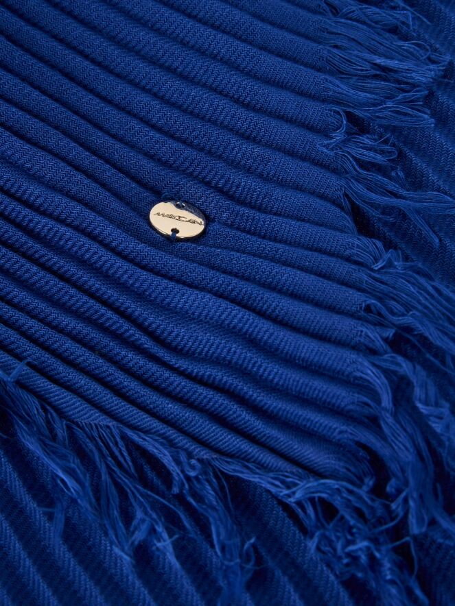 Ein gerippter Schal von Marc Cain in Kobaltblau. Die Enden des Schals sind fein ausgefranst. Dieser Schal sollte von Hand gewaschen werden.