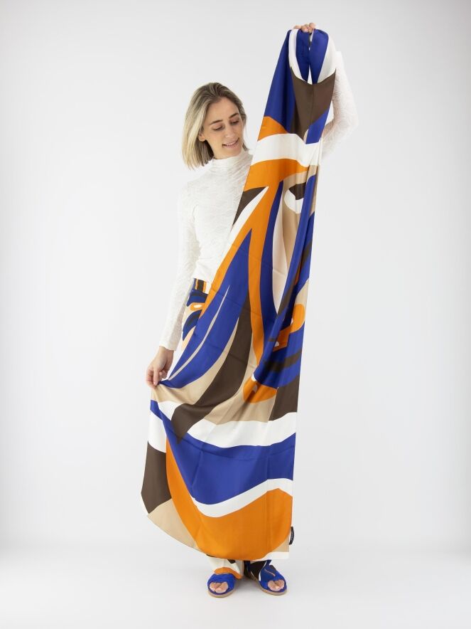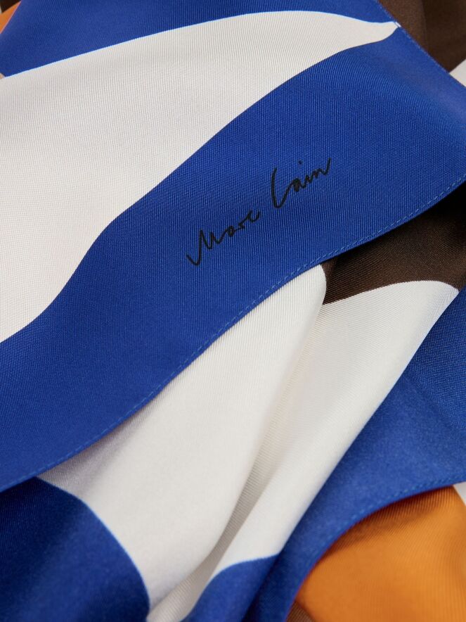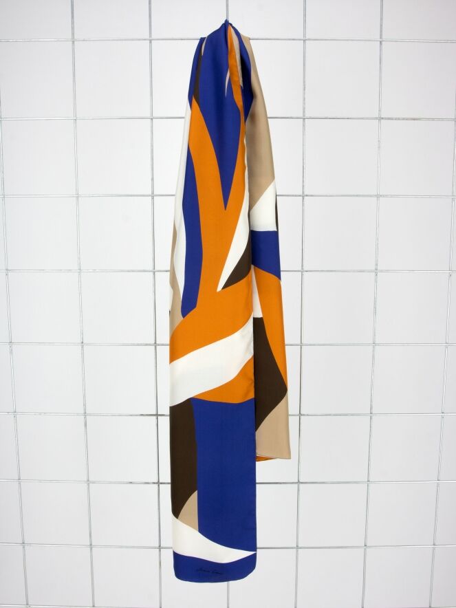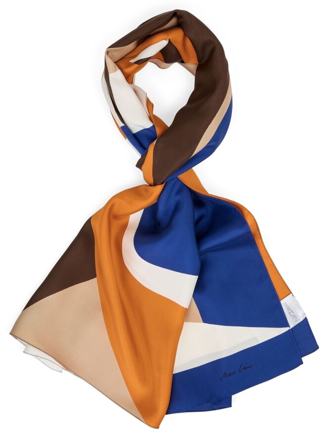Ein Schal von Marc Cain mit einem grafischen Muster in Orange, Kobaltblau, Cremeweiß, Camel und Mokkabraun. Dieser Schal sollte von Hand gewaschen werden.