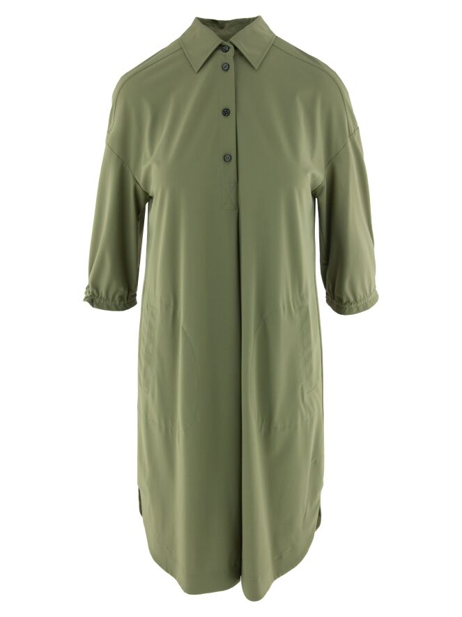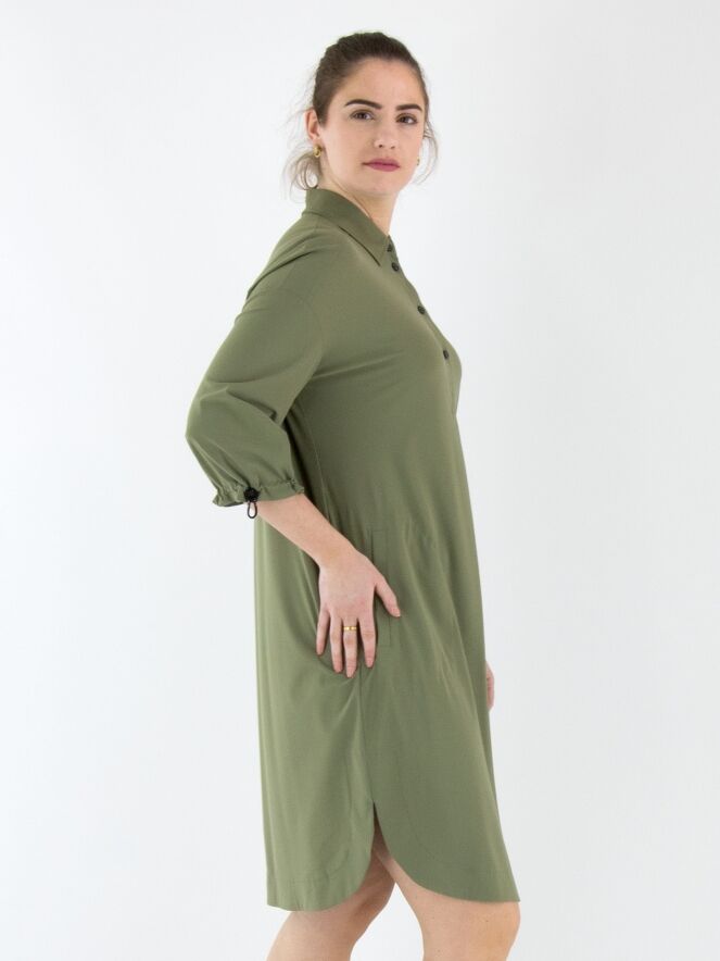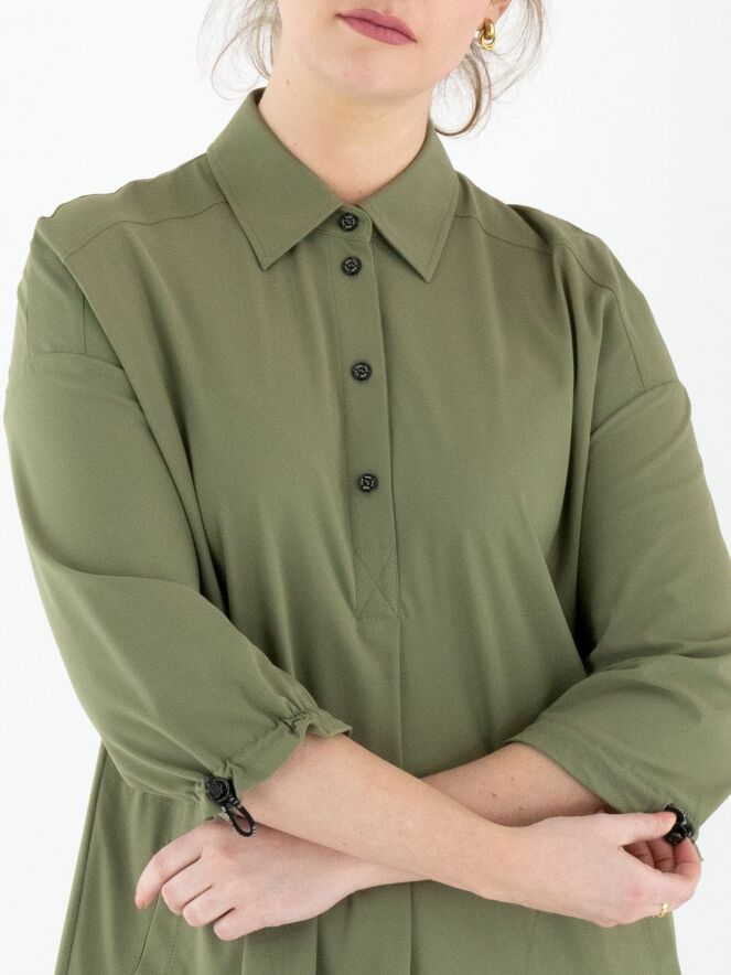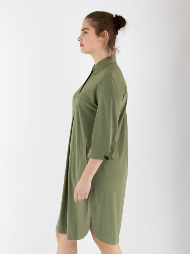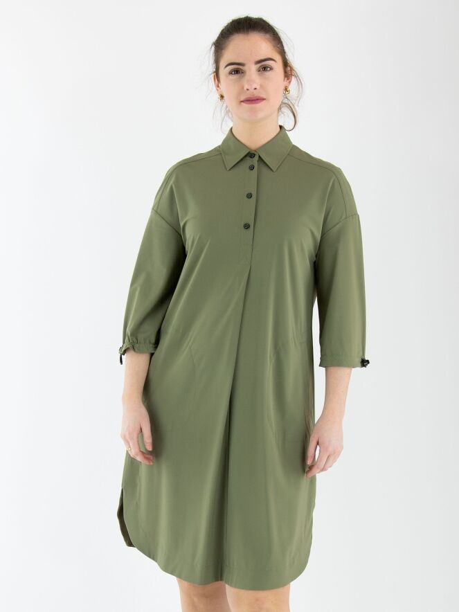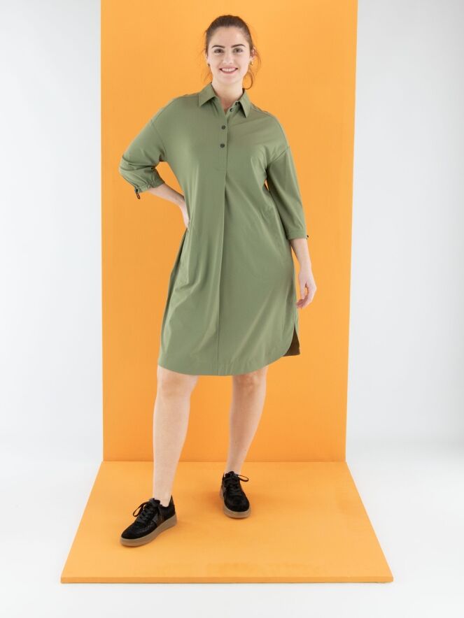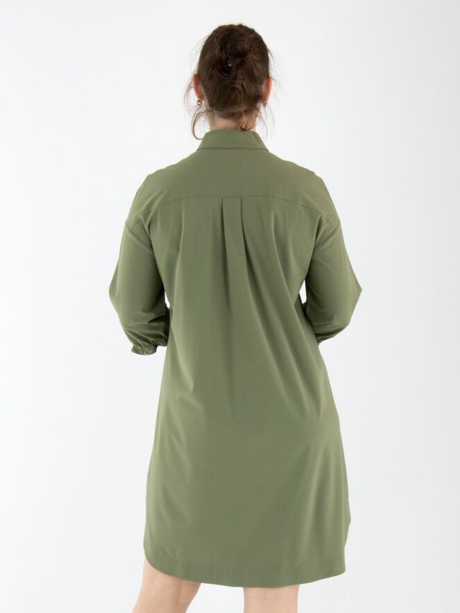 Ein Kleid von Marc Cain in Olivgrün. Eine mittige Falte verläuft von der Knopfleiste bis unter die Brust. Seitentaschen befinden sich auf Taillenhöhe. Der Saum ist abgerundet. Auf der Rückseite beginnen zwei Falten an der Naht auf Höhe der Schulterblätter. Am Ende der langen Ärmel befindet sich ein elastischer Kordelzug in einer Tunnelverarbeitung, mit dem ein Raffeffekt erzeugt werden kann. Dieses Kleid kann bei 30 Grad gewaschen werden.