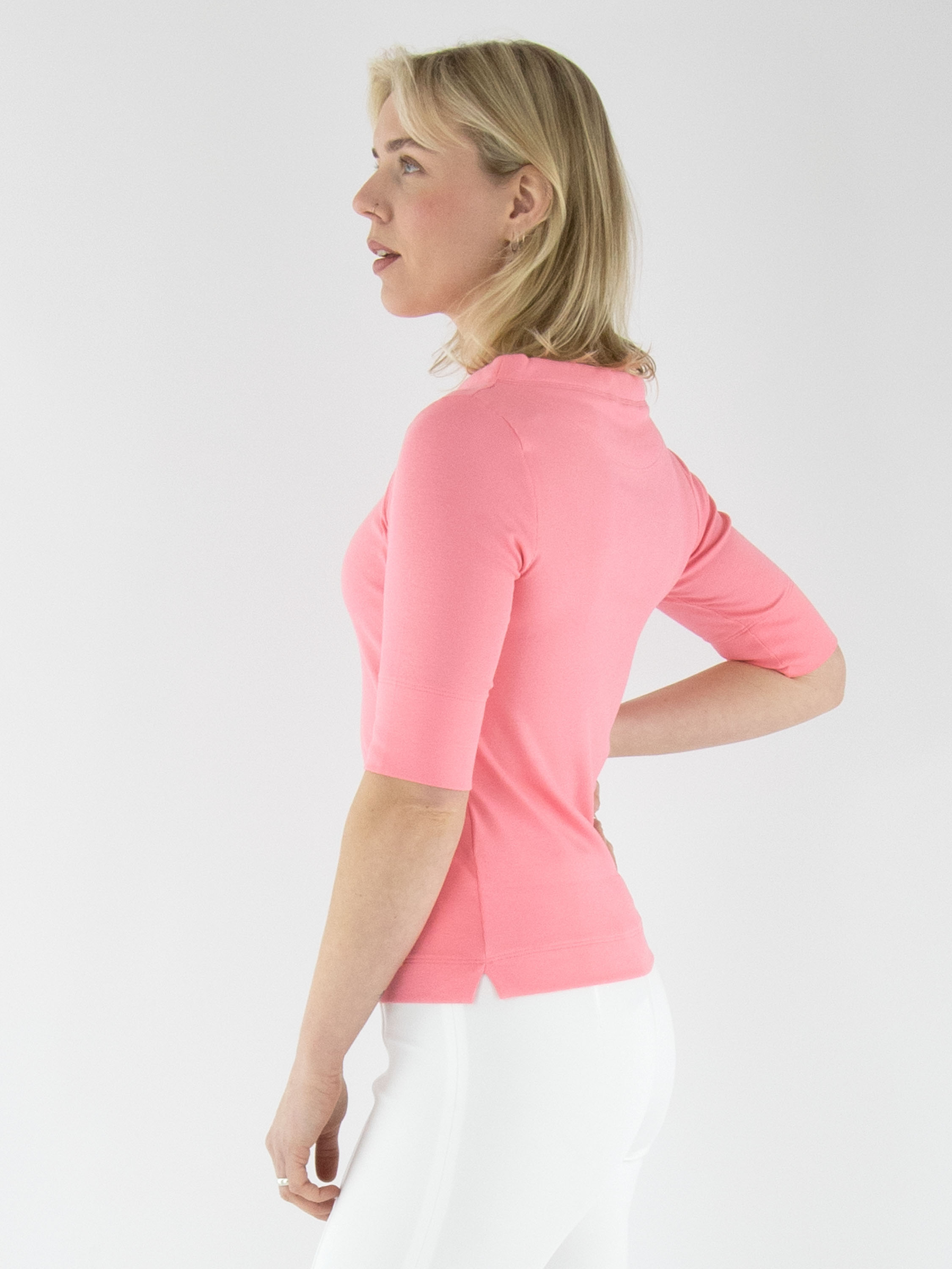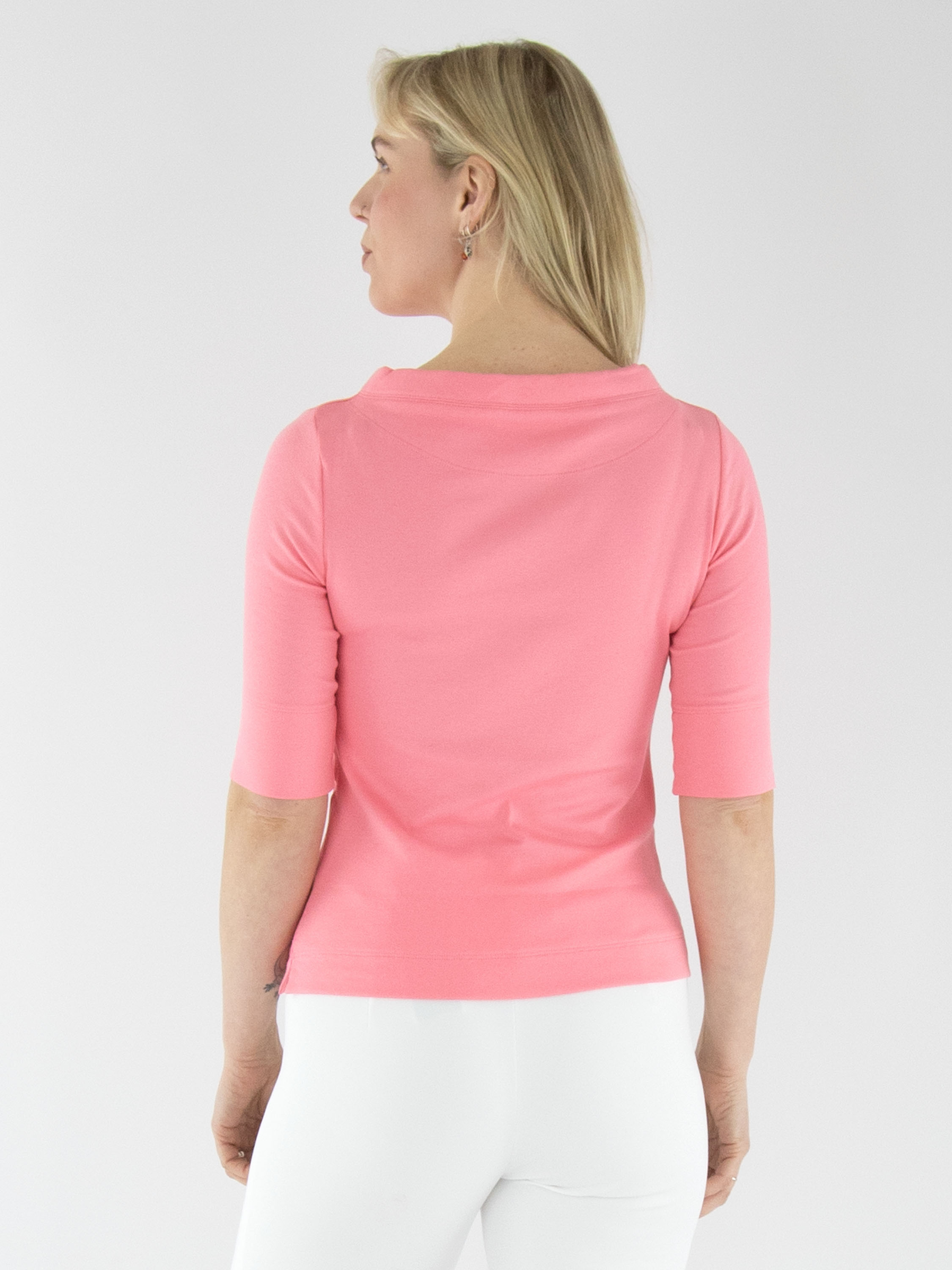 Ein Shirt von Marc Cain in Lachsrosa. Das Shirt hat eine fein gerippte Struktur, kurze Ärmel und einen breiten, runden Ausschnitt. Dieses Shirt kann bei 30 Grad gewaschen werden.