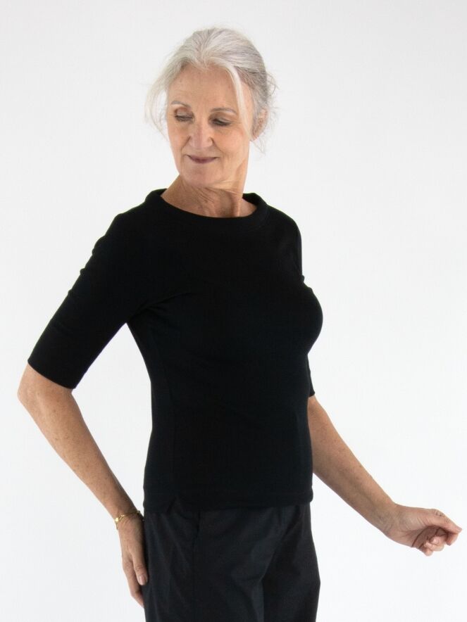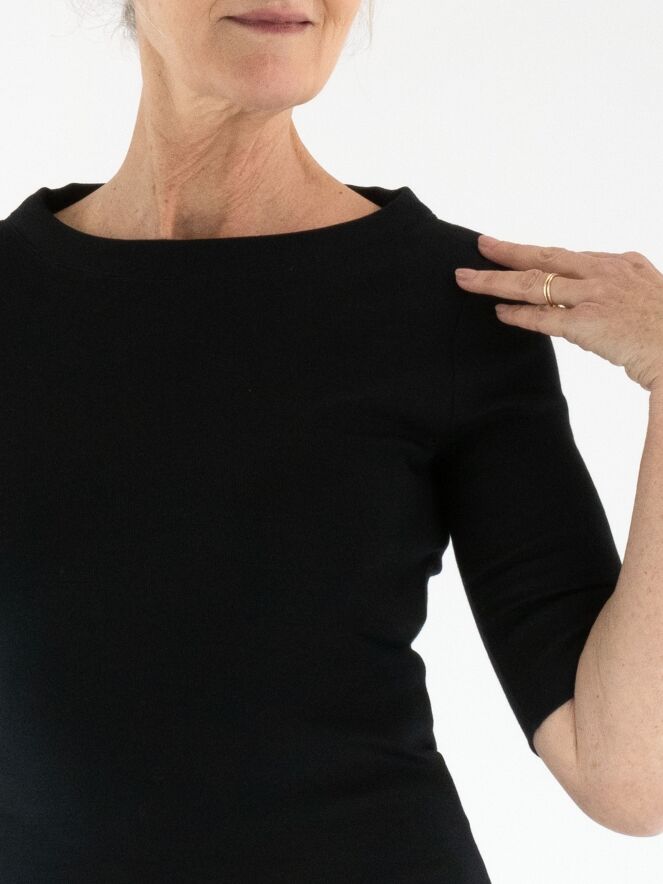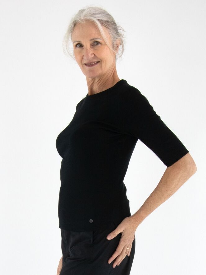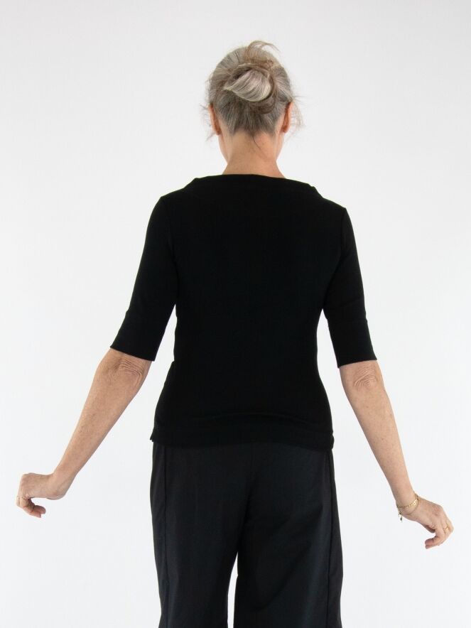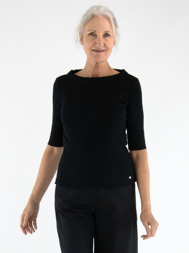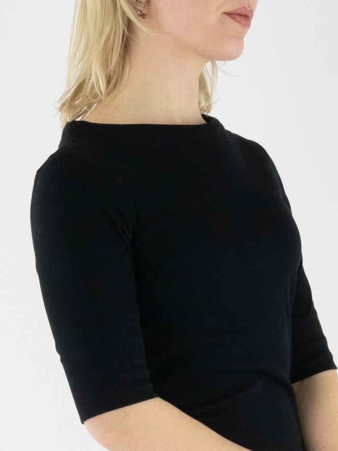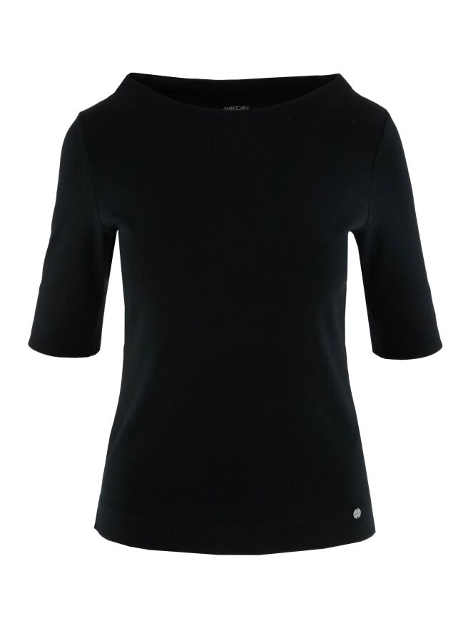 Ein Shirt von Marc Cain in Schwarz. Das Shirt hat einen weiten, runden Ausschnitt mit einem gerippten Strickbesatz. Der Stoff des Shirts ist fein gerippt. Dieses Shirt kann bei 30 Grad gewaschen werden.