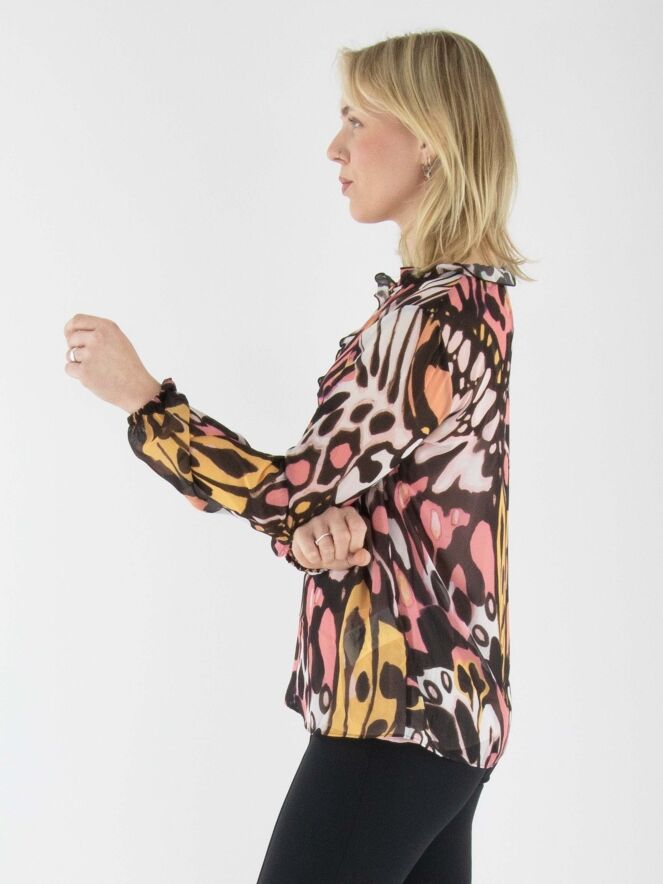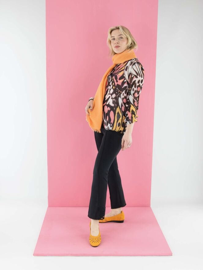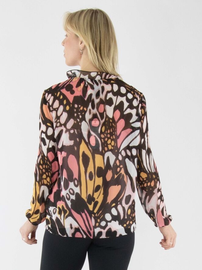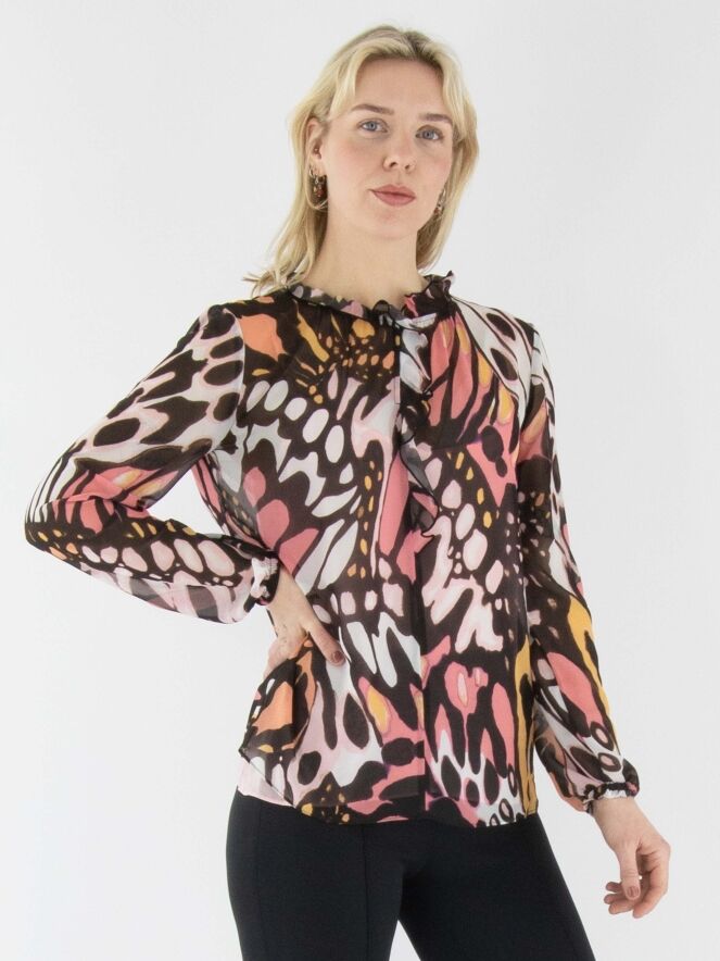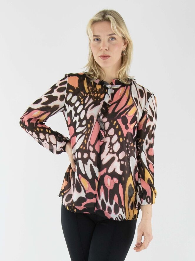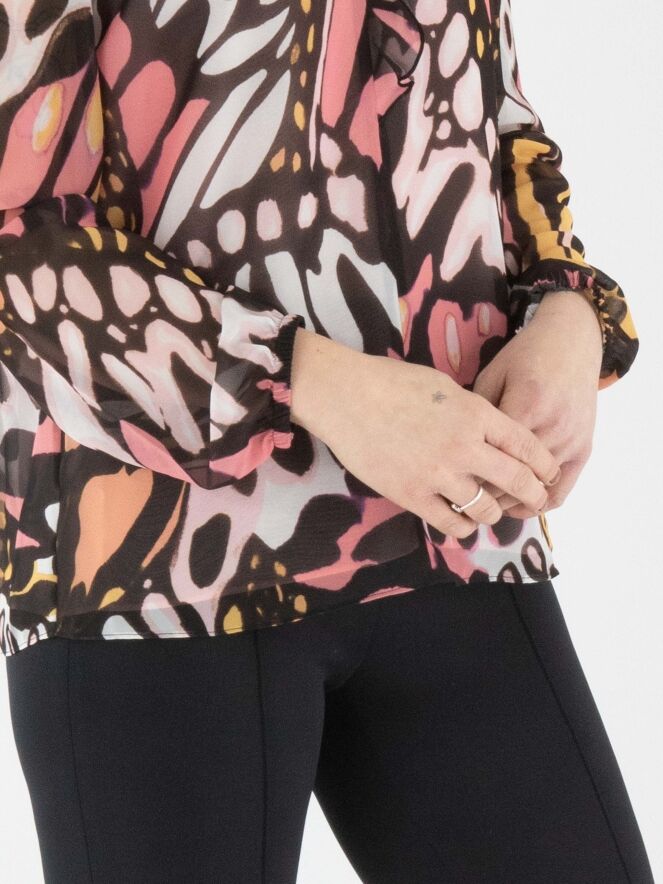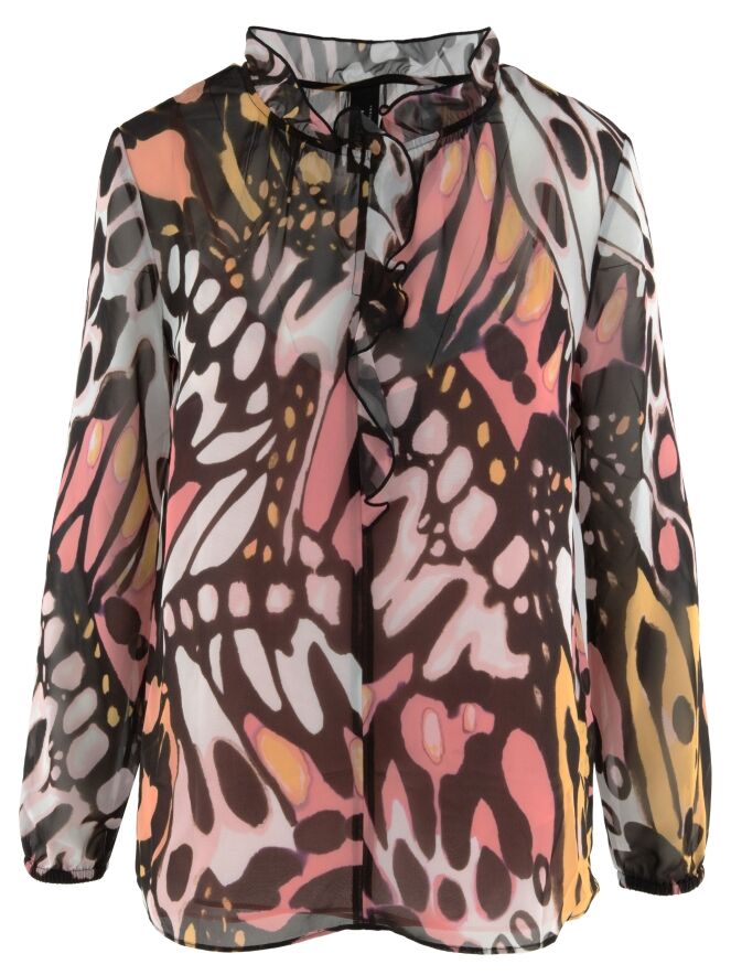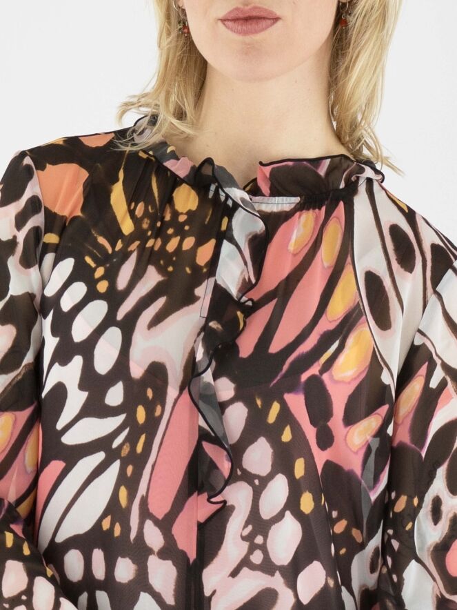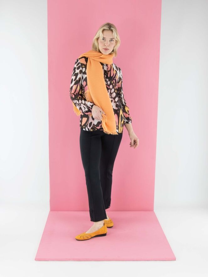 Eine leicht transparente Bluse von Marc Cain mit einem grafischen Flower-Power-Muster in Orange, Lachsrosa, Schwarz und Cremeweiß. Am Rand des runden Ausschnitts befindet sich eine fein plissierte transparente Biese, die als Volant bis zur Brustmitte verläuft. In der fein plissierten Manschette der langen Ärmel ist ein elastisches Band eingearbeitet. Die Bluse wird mit einem einfarbigen lachsrosa Untertop geliefert. Diese Bluse kann bei 30 Grad gewaschen werden.