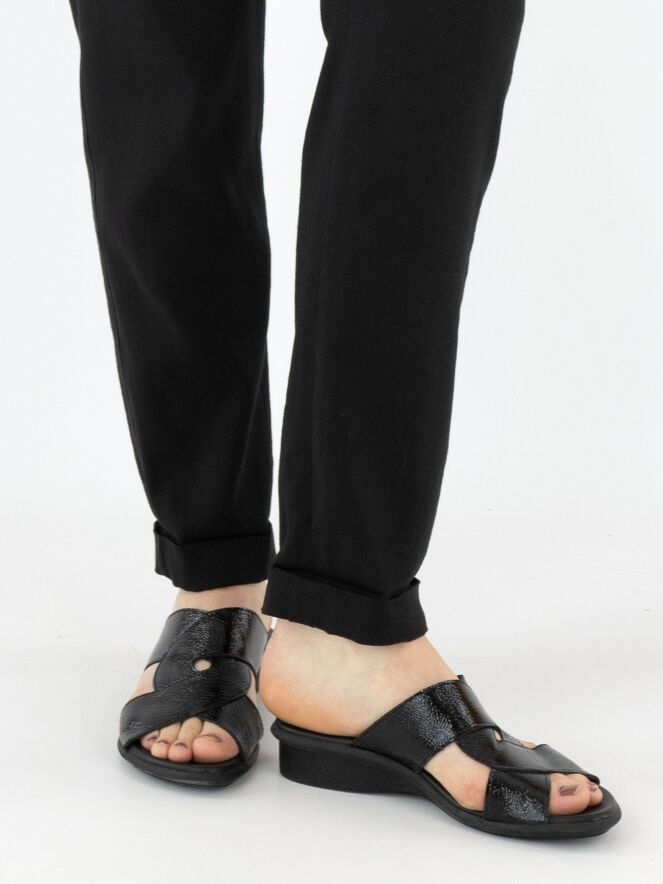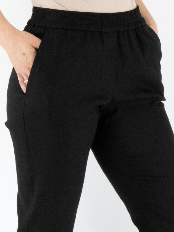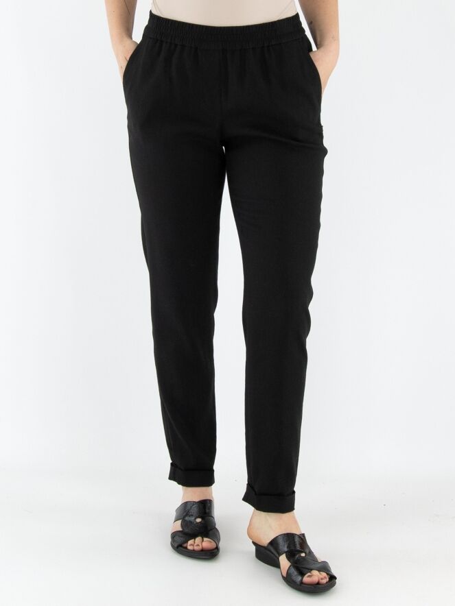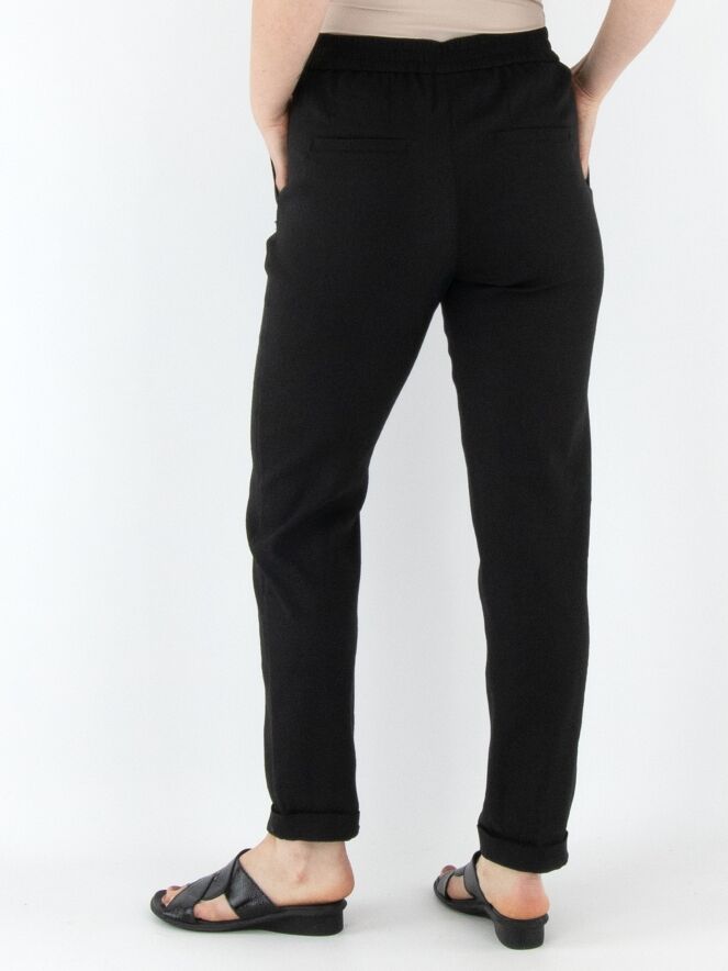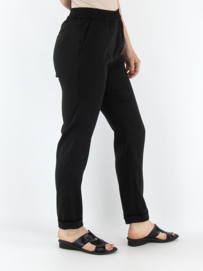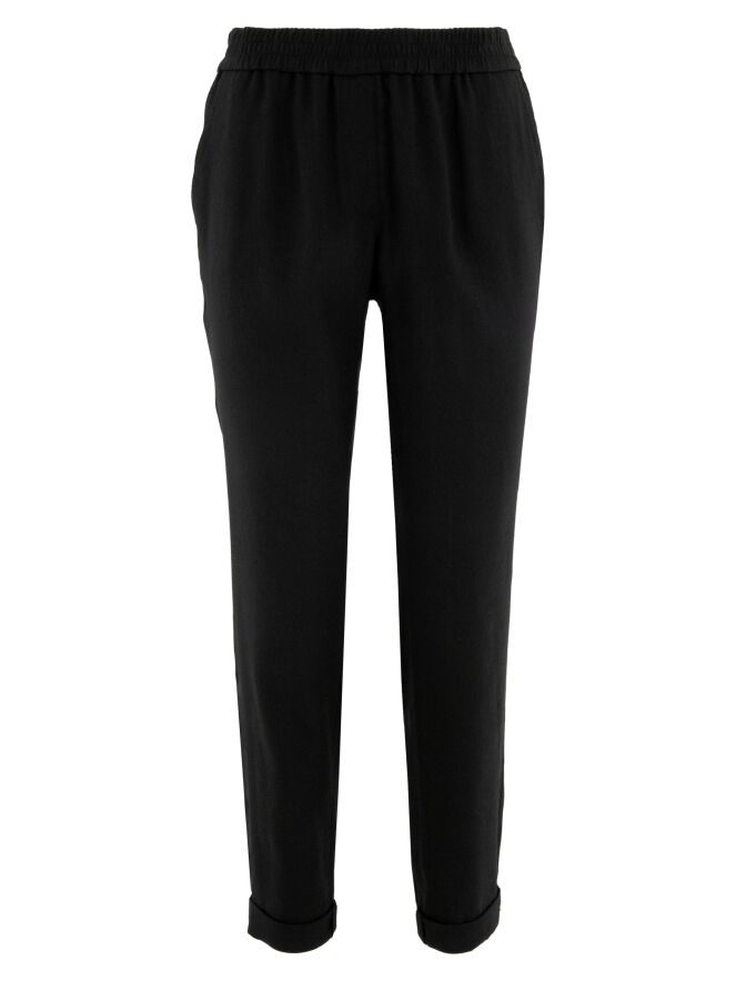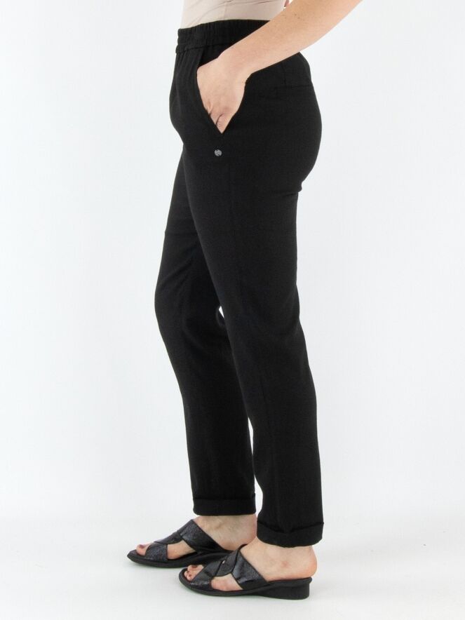 Eine Hose von Marc Cain in Schwarz. Der Bund hat ein fein plissiertes elastisches Band. Die Hose hat Seitentaschen und einen kurzen Umschlag am unteren Ende. Diese Hose kann bei 30 Grad gewaschen werden.