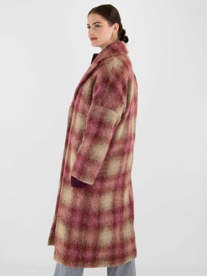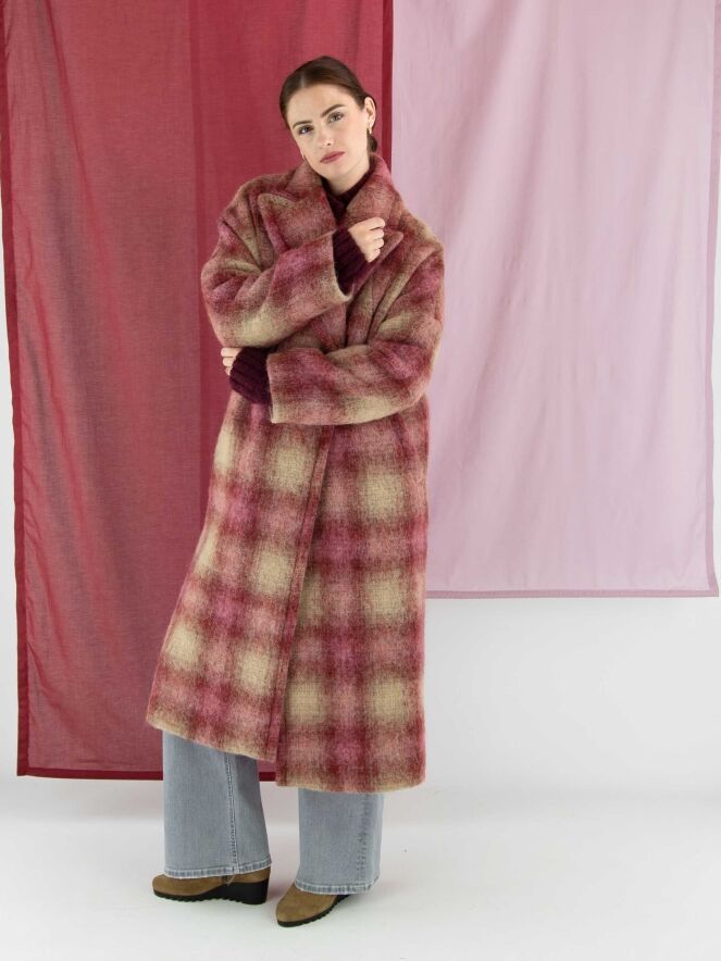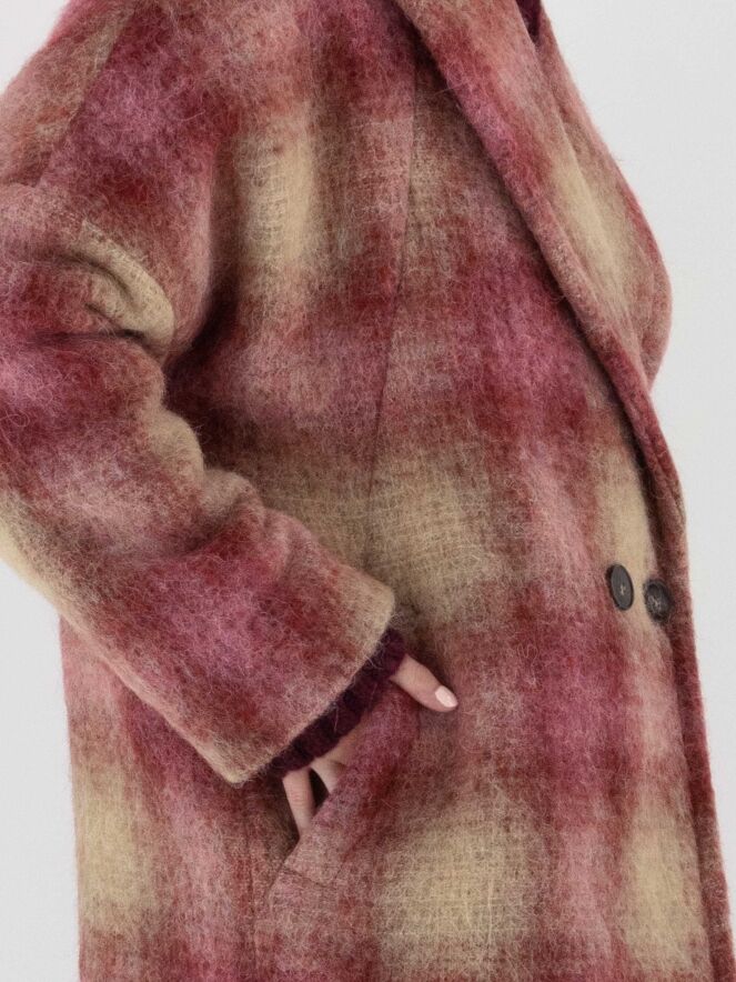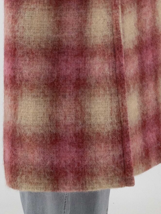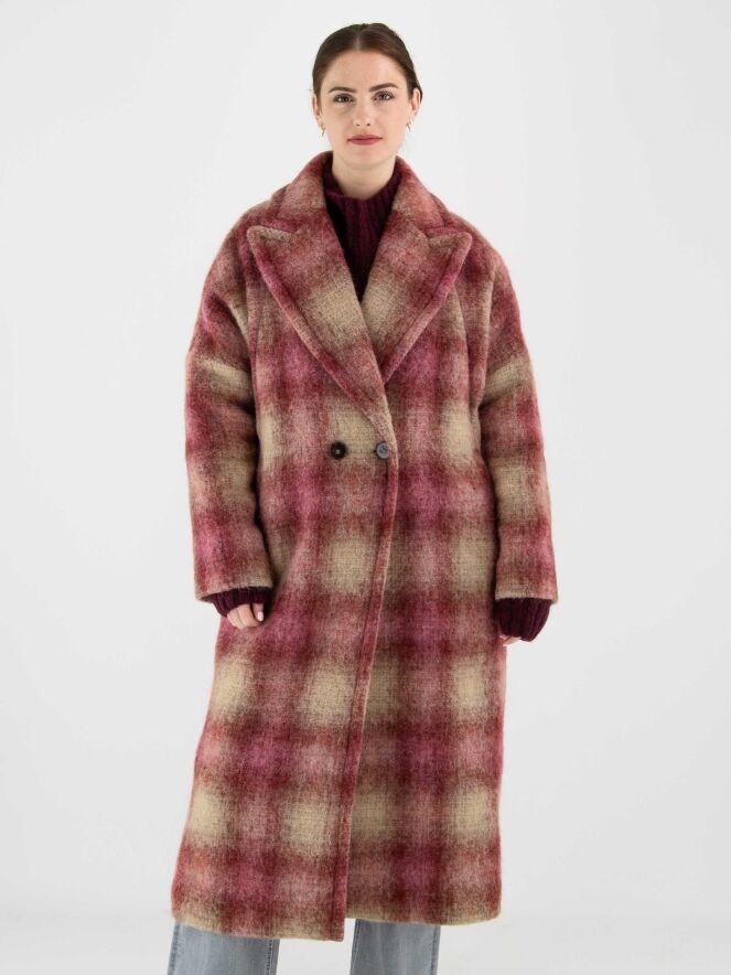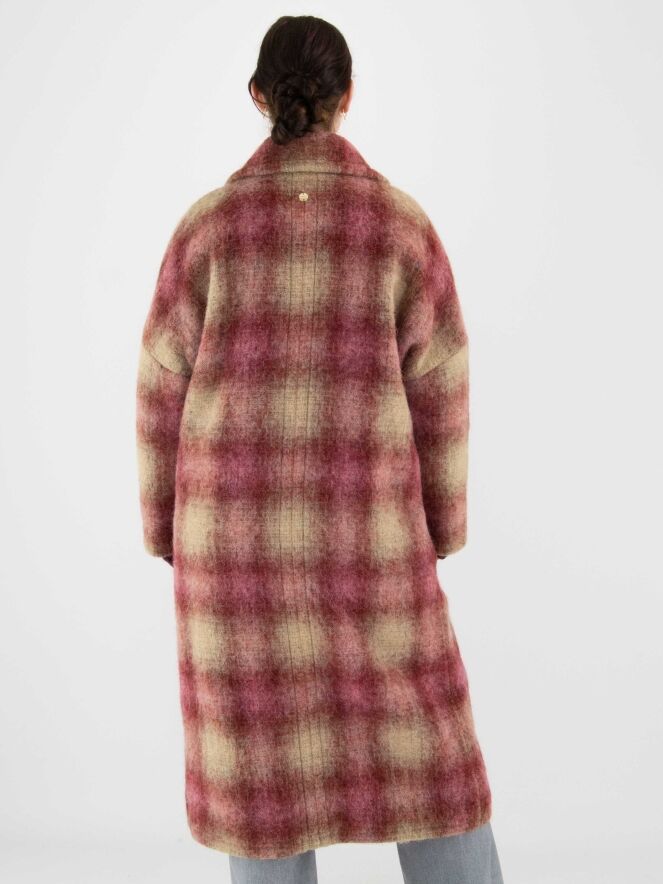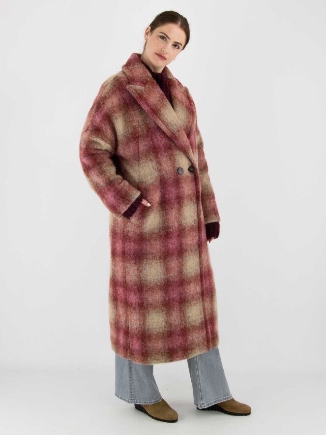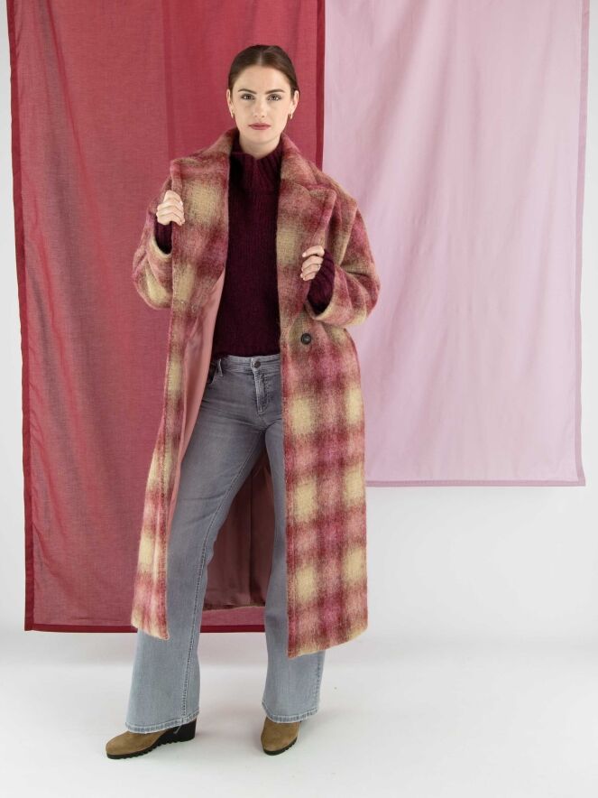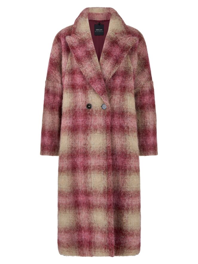 Langer, doppelt geknöpfter Mantel von Marc Cain mit einem Dégradé-Karomuster in Bordeauxrot und Camel. Der Mantel ist gefüttert und darf nicht gewaschen werden.