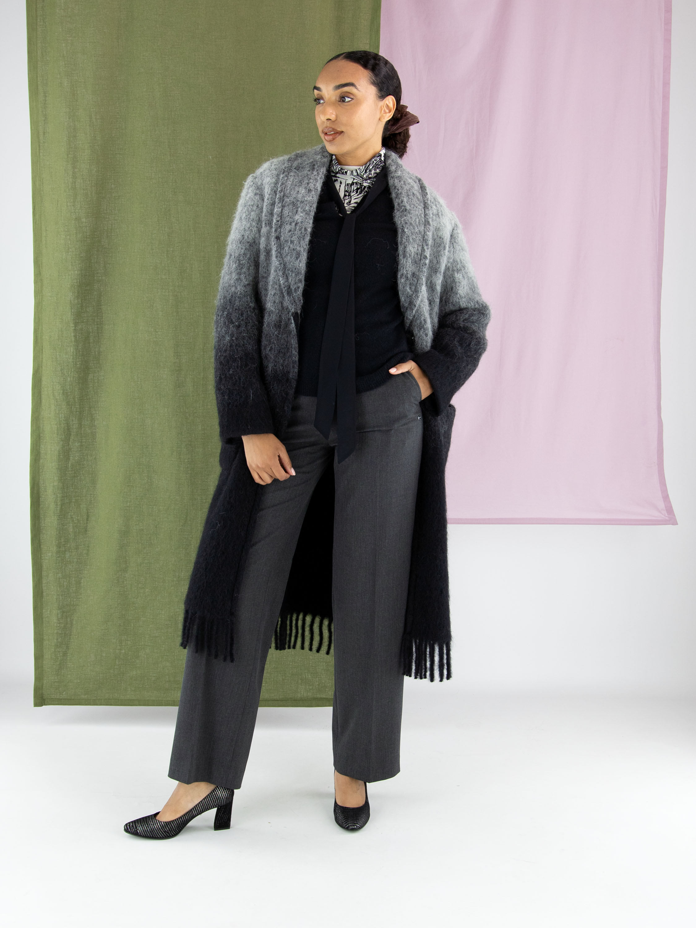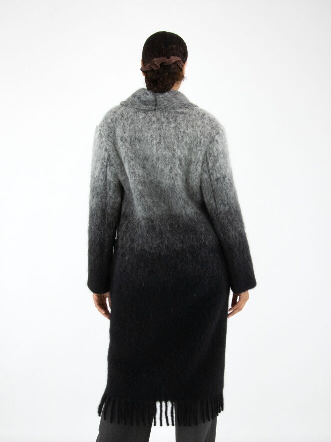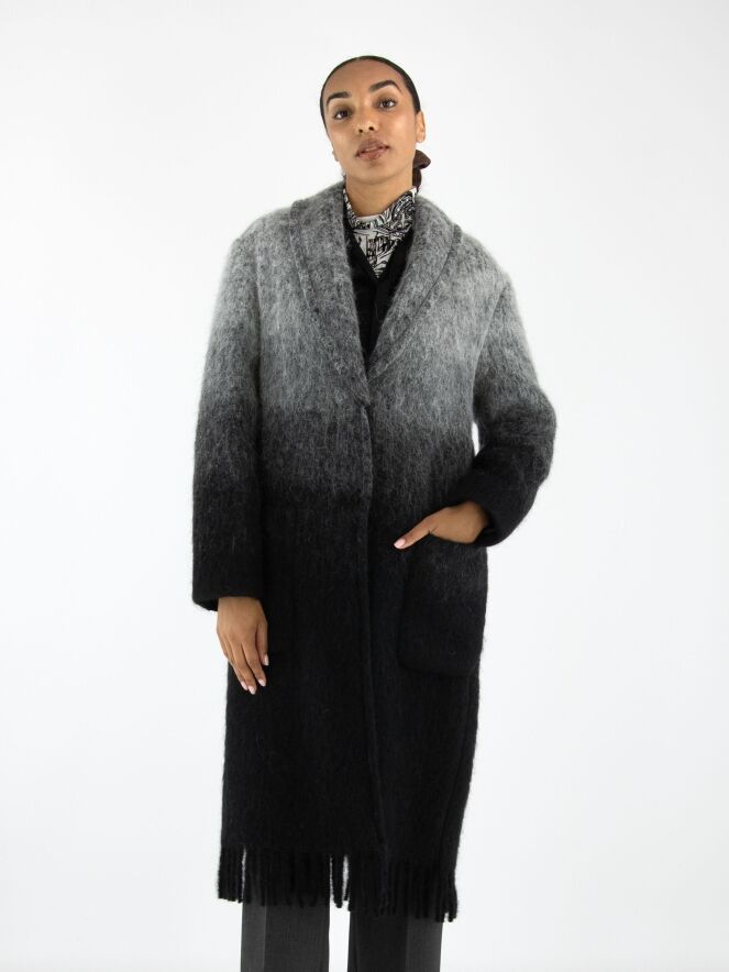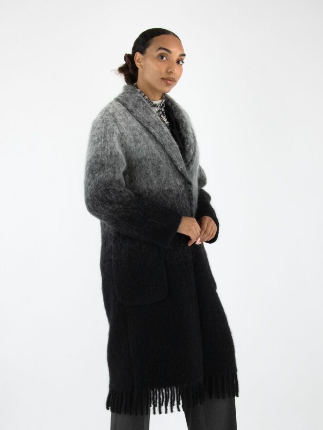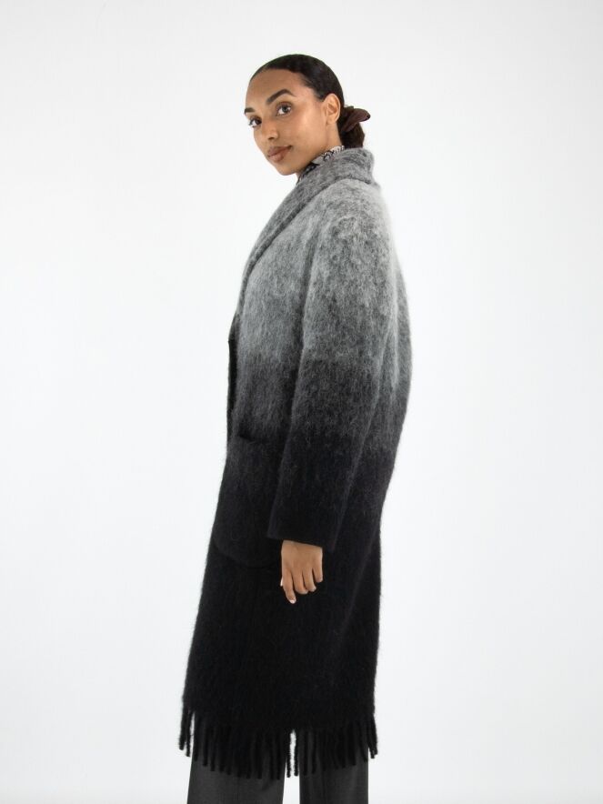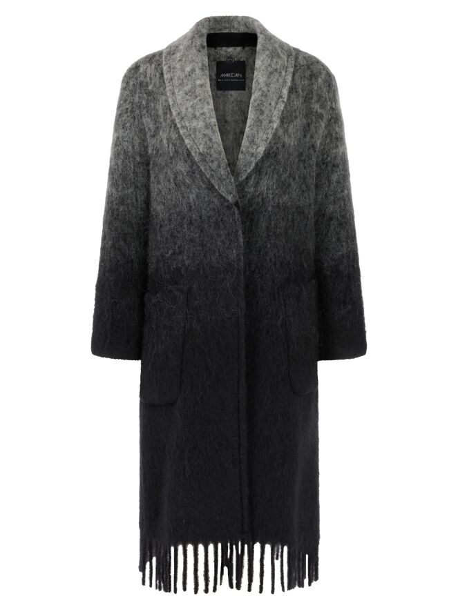 Ein Mantel von Marc Cain in einem Dégradé von Hellgrau am Kragen bis zu Anthrazitgrau am Saum. Der Mantel hat einen Verschluss mit zwei Druckknöpfen und ist ungefüttert. Am unteren Saum ist er mit langen Fransen verziert. Dieser Mantel darf nicht gewaschen werden.