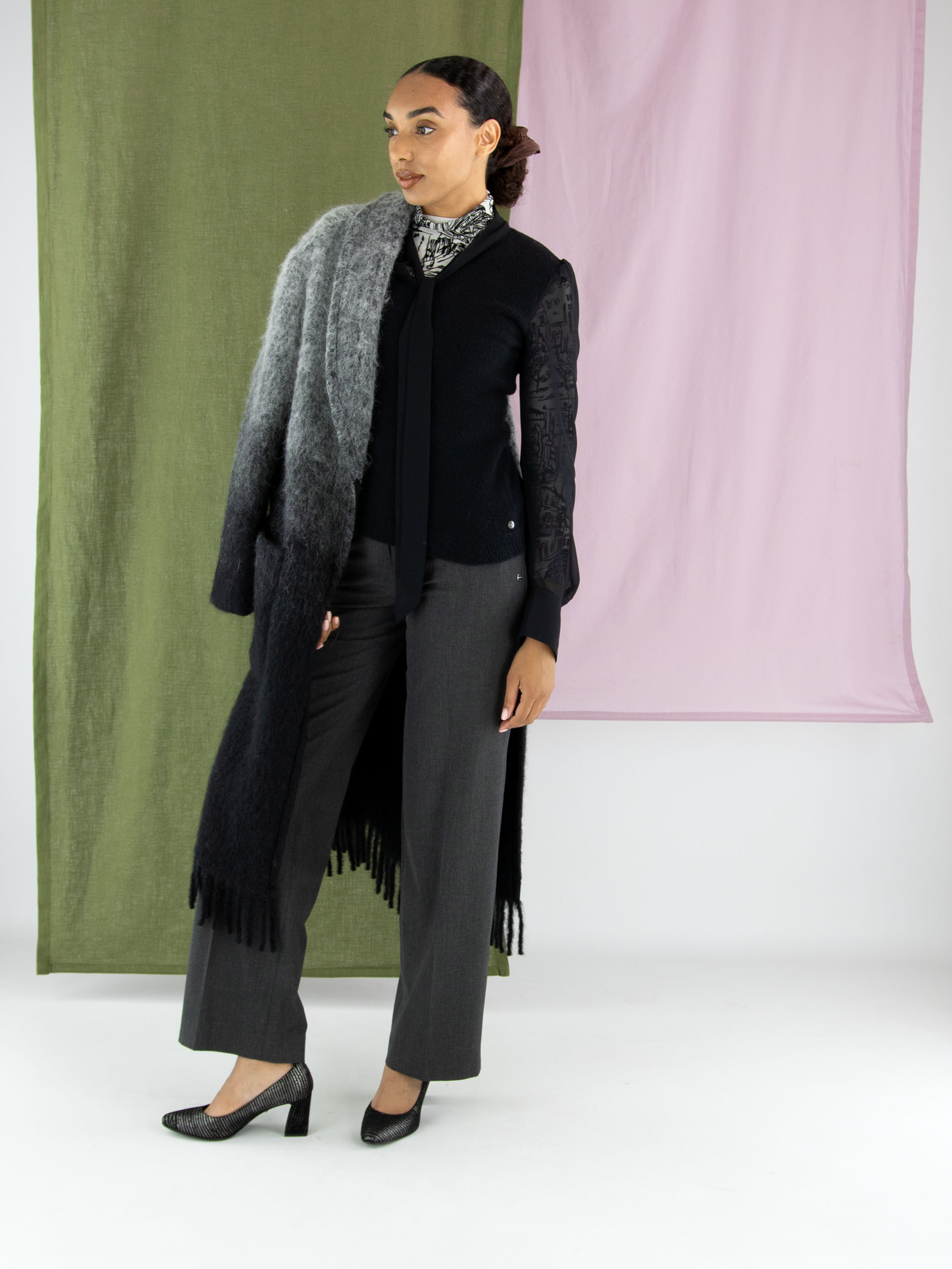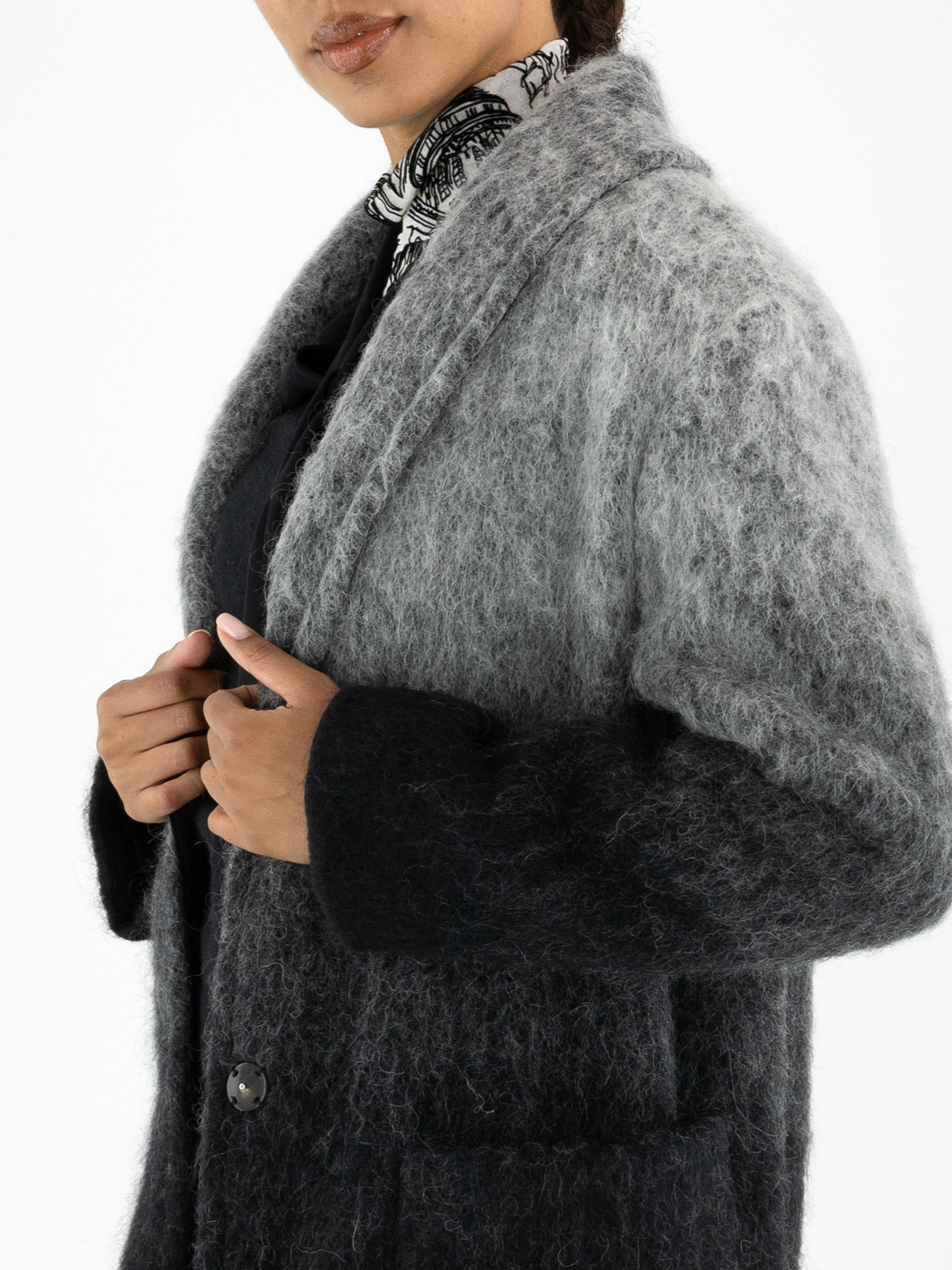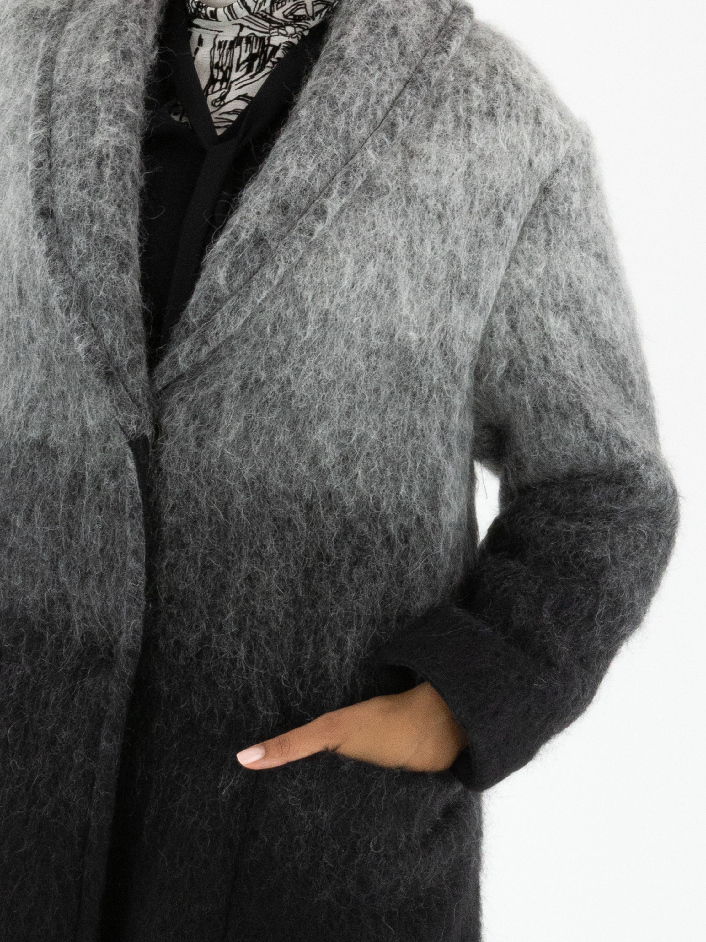 Ein Mantel von Marc Cain in einem Dégradé von Hellgrau am Kragen bis zu Anthrazitgrau am Saum. Der Mantel hat einen Verschluss mit zwei Druckknöpfen und ist ungefüttert. Am unteren Saum ist er mit langen Fransen verziert. Dieser Mantel darf nicht gewaschen werden.