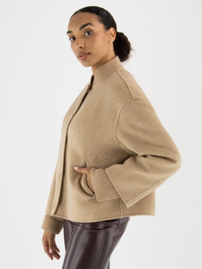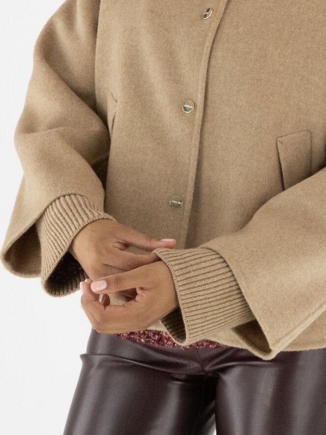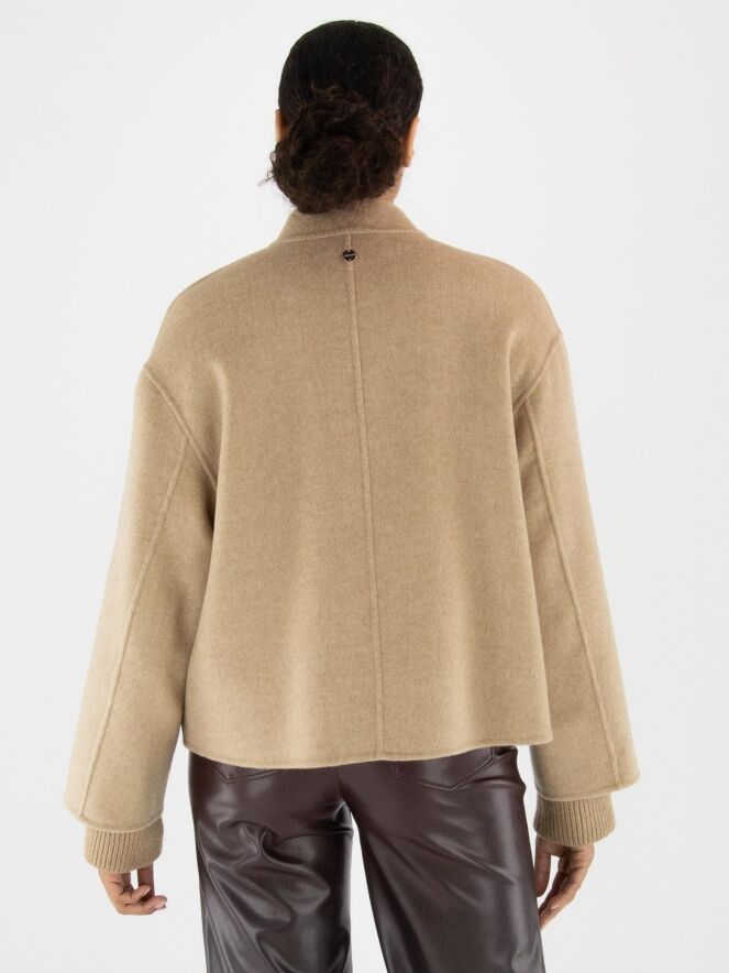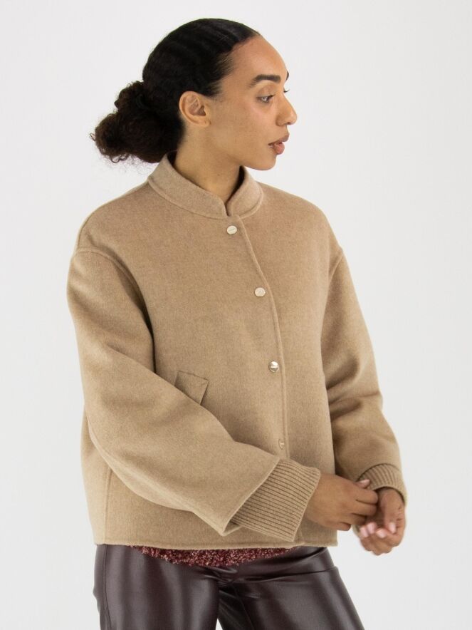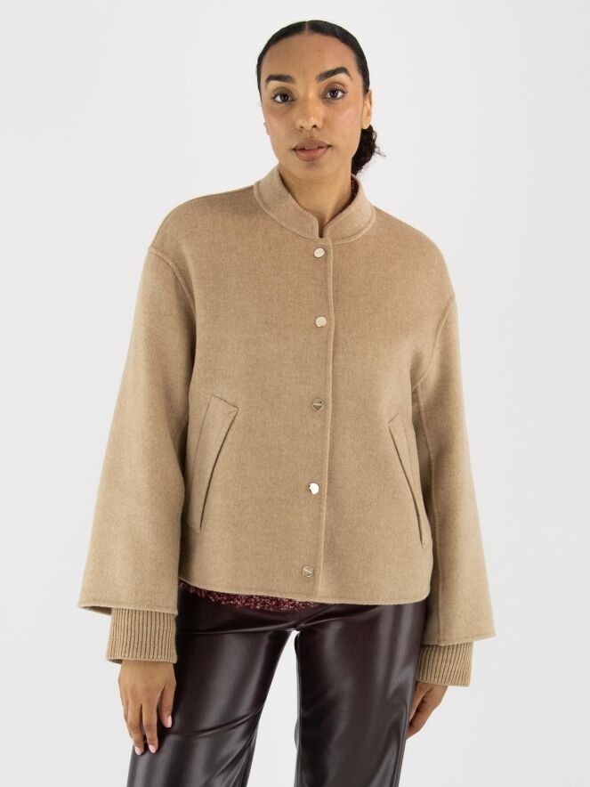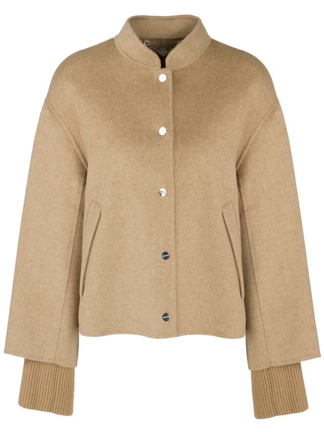 Blazer von Marc Cain in einem weichen Camelton. Die Eingrifftaschen haben eine umgekehrte Klappe. Der Blazer wird mit kleinen goldfarbenen Druckknöpfen geschlossen und ist ungefüttert. Aus den Ärmelsäumen sind fein gerippte Strickbündchen gearbeitet. Dieser Blazer darf nicht gewaschen werden.