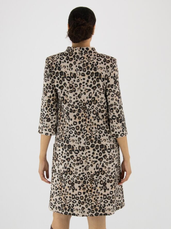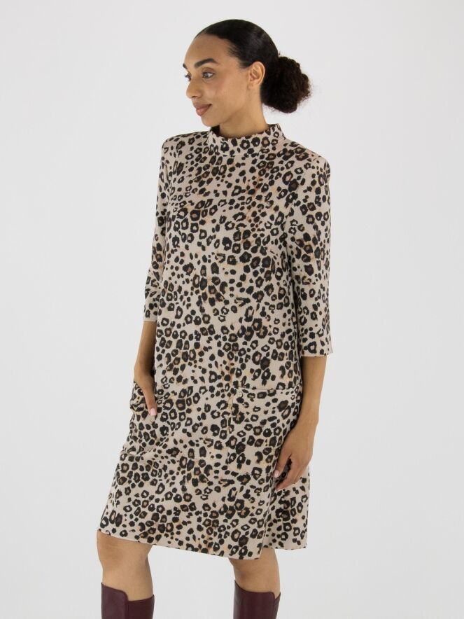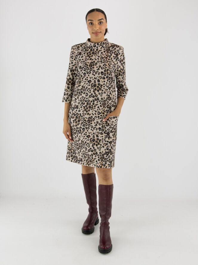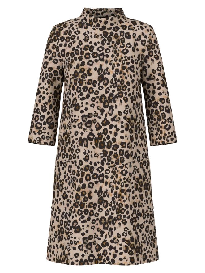 Ein Kleid von Marc Cain im Leopardenmuster mit verschiedenen Braun- und Schwarztönen auf sandfarbenem Hintergrund. Das Kleid hat einen stehenden Rundhalsausschnitt und halblange Ärmel. Auf der Rückseite befindet sich ein verdeckter Reißverschluss bis oberhalb der Taille. Vorne, direkt unter der Taille, sind zwei Taschen. Dieses Kleid kann bei 30 Grad gewaschen werden.