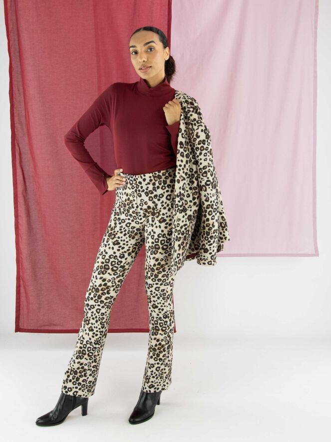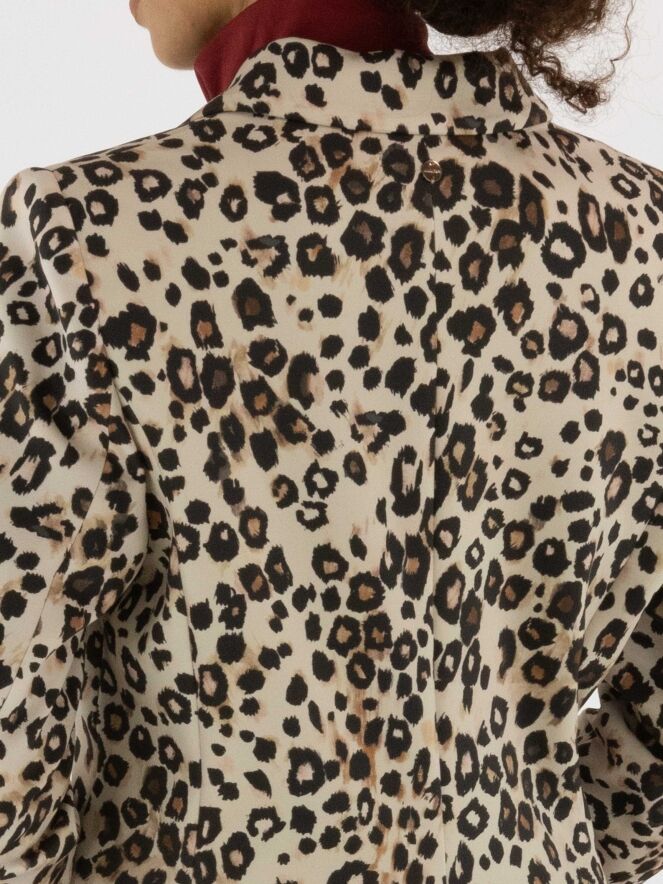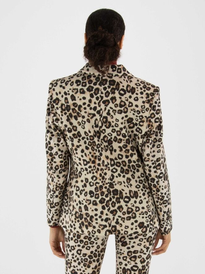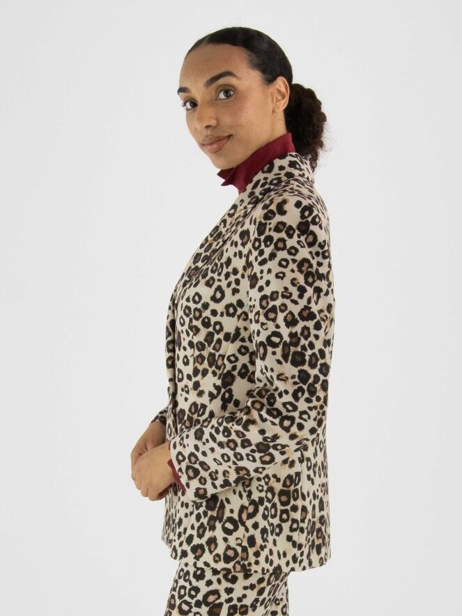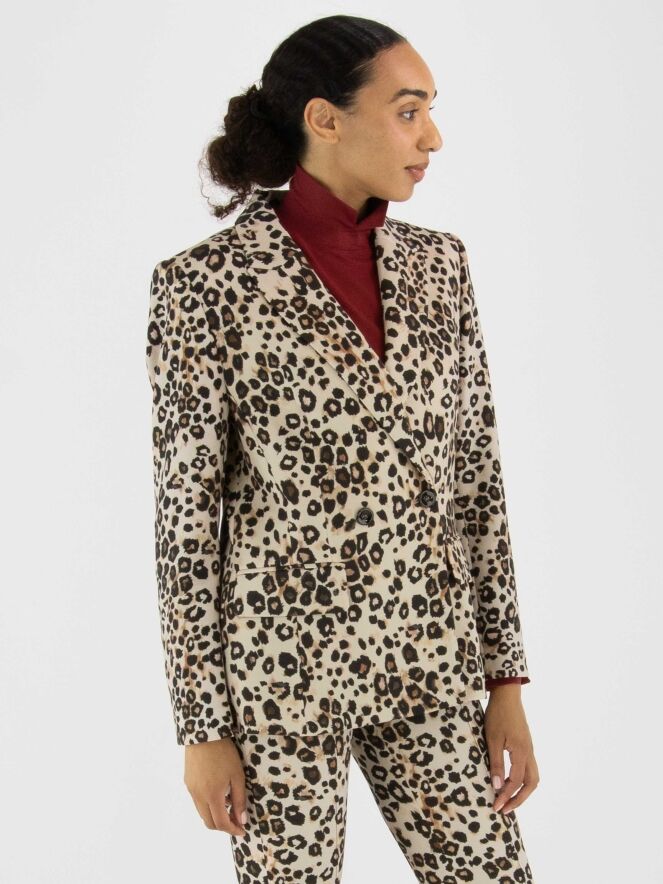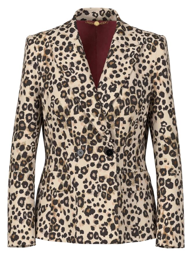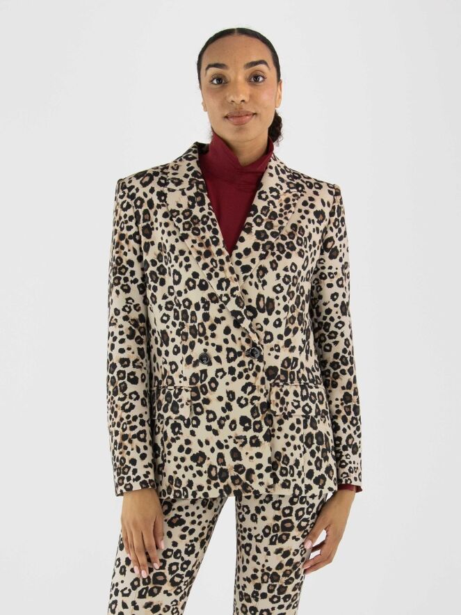 Scuba-Doppelreiher-Blazer von Marc Cain mit Leopardenmuster in verschiedenen Braun- und Schwarztönen auf sandfarbenem Grund. Der Blazer ist gefüttert und darf nicht gewaschen werden.