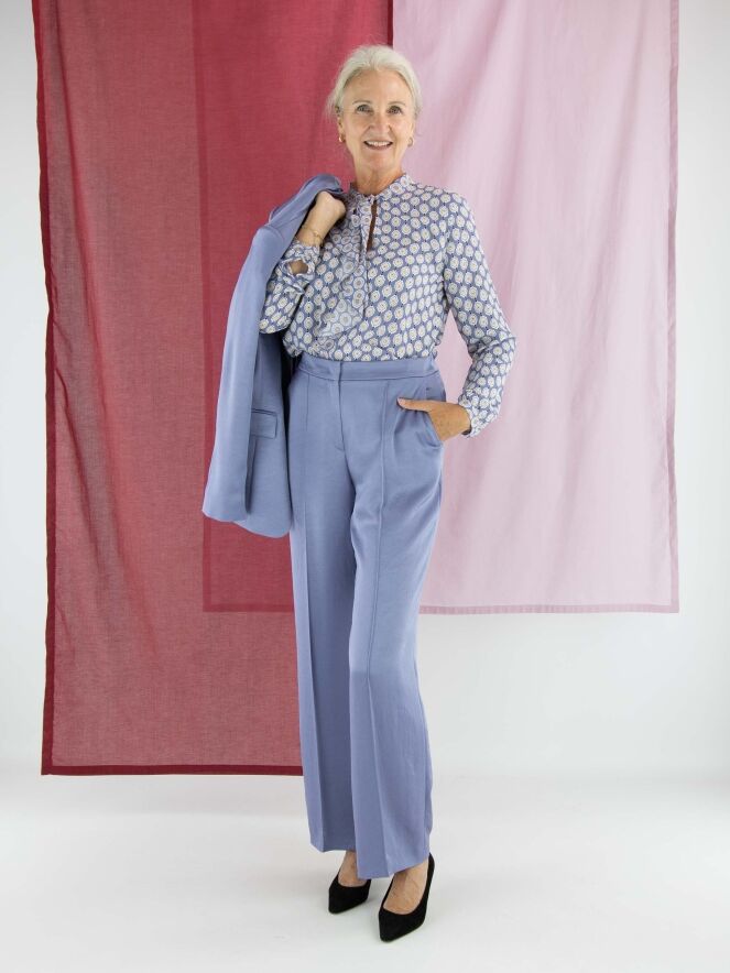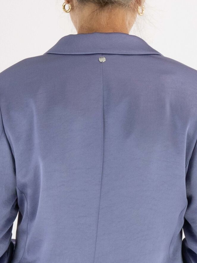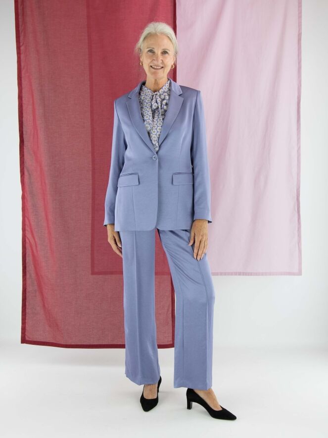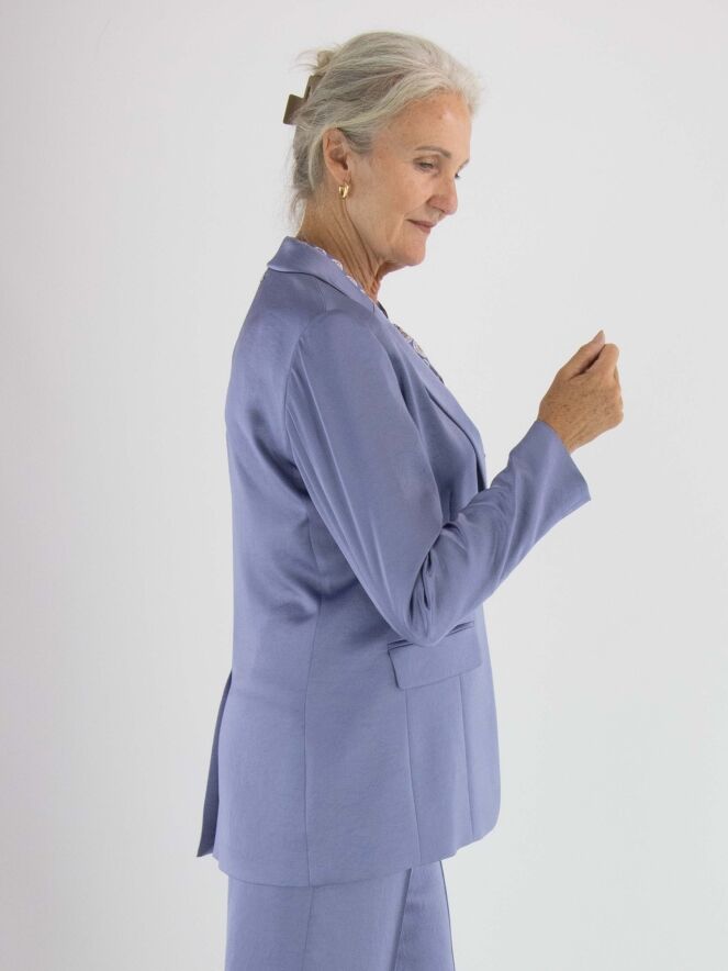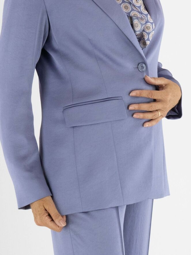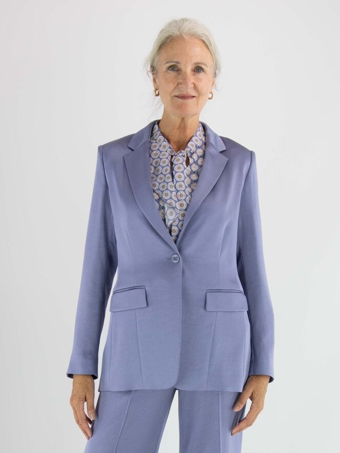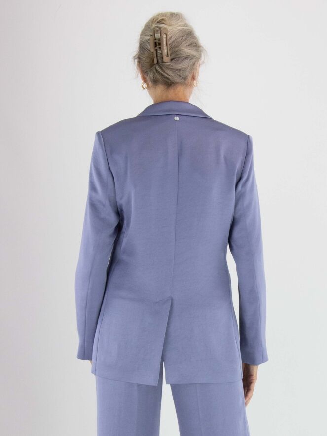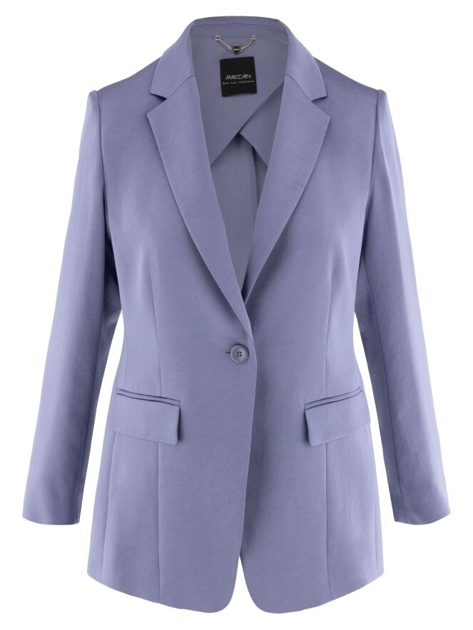 Blazer aus mattem Satin von Marc Cain in der Farbe Flieder. Der Blazer ist halb gefüttert und hat einen mittigen Schlitz am unteren Rücken. Er wird mit einem Knopf geschlossen und kann bei 30 Grad gewaschen werden.