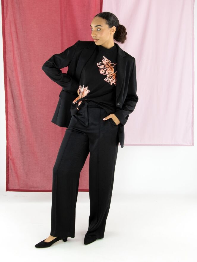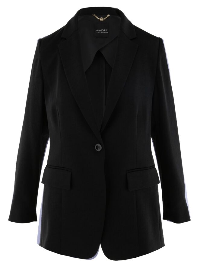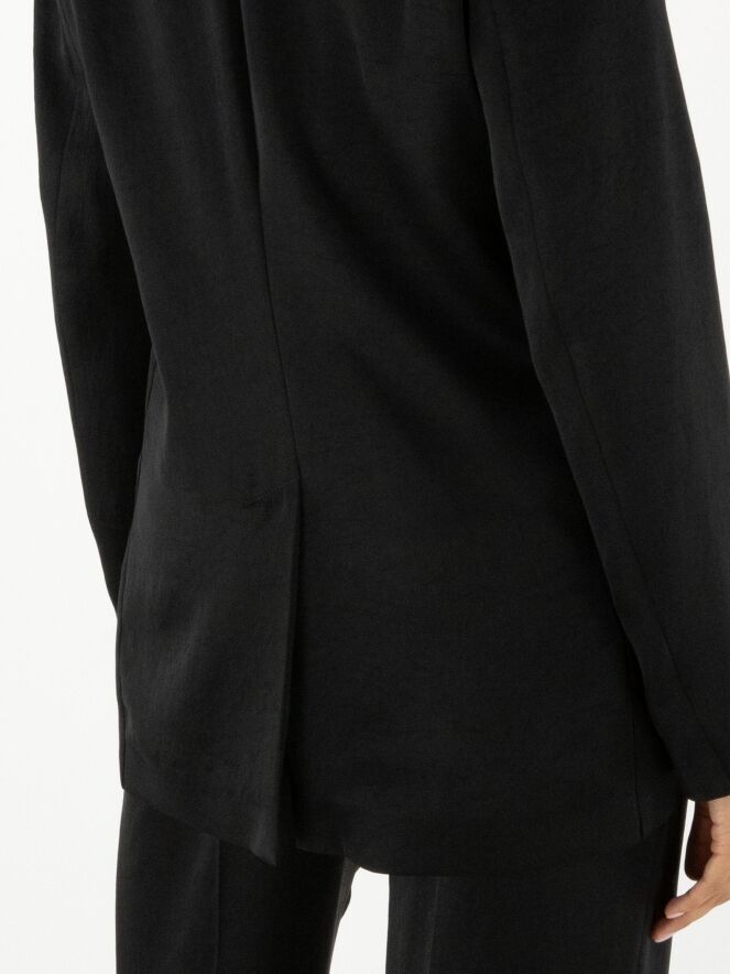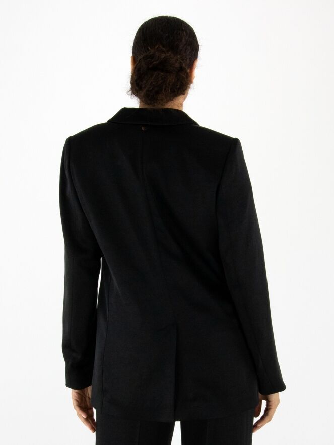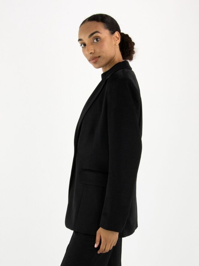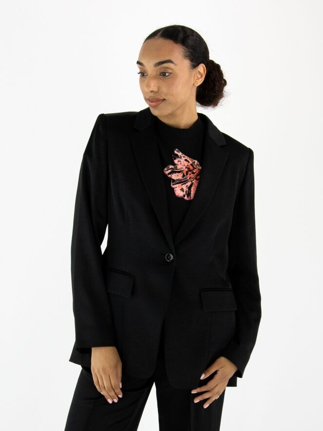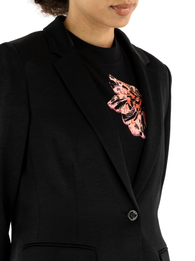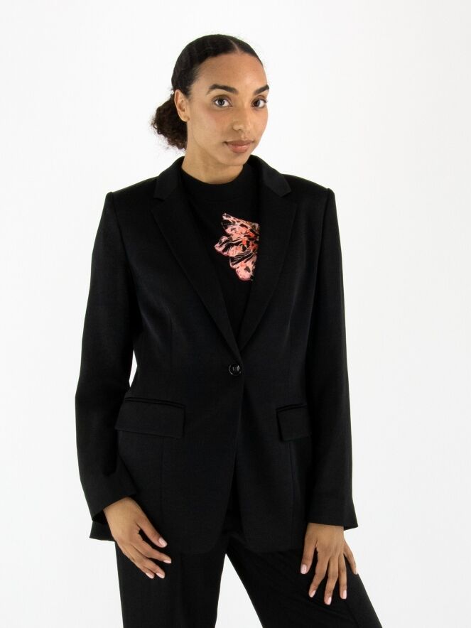 Mattsatin-Blazer von Marc Cain in Schwarz. Der Blazer ist halb gefüttert und hat einen mittigen Schlitz am Rückensaum. Er wird mit einem Knopf geschlossen und darf bei 30 Grad gewaschen werden.