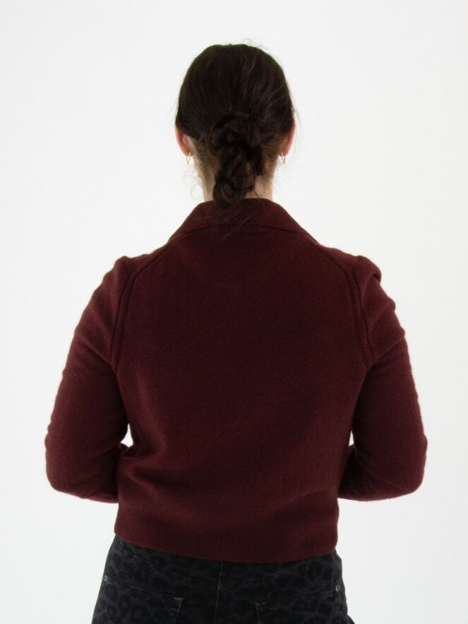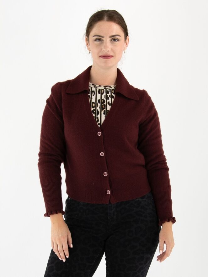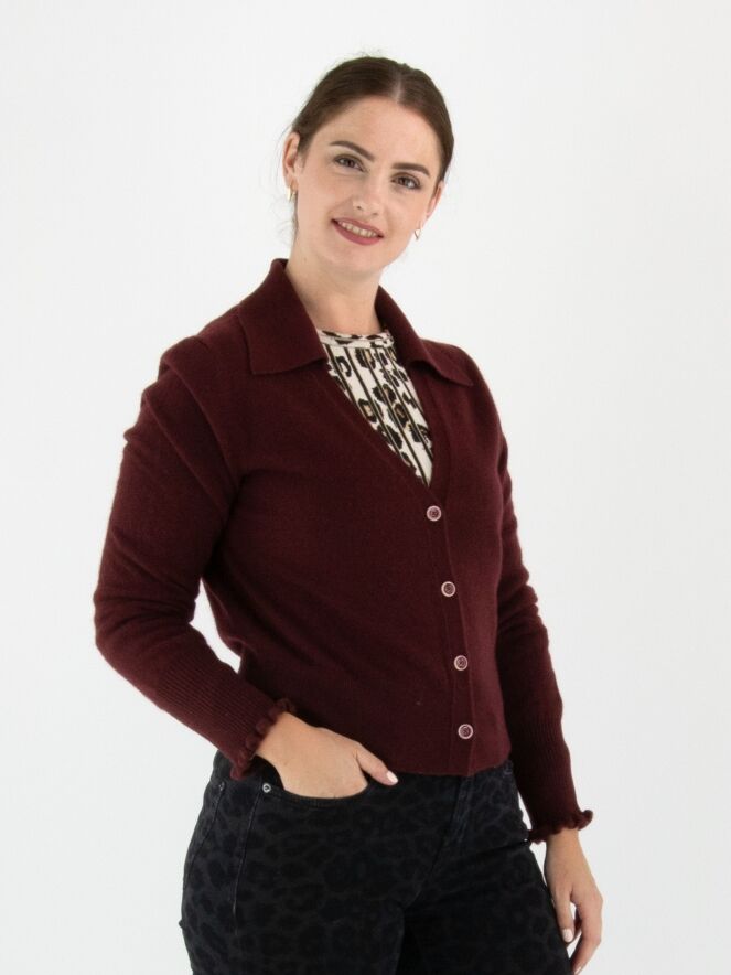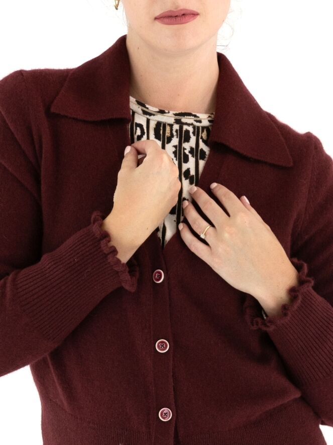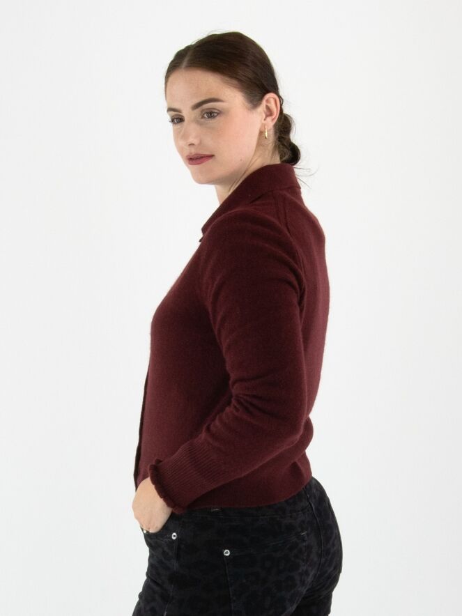 Eine kurze Strickjacke von Marc Cain in Aubergine. Die Jacke wird mit vier Knöpfen geschlossen. Entlang des Halsausschnitts verläuft ein breiter Kragen. Die langen Ärmel enden in langen, fein gerippten Bündchen mit gesmoktem Abschluss. Diese Strickjacke sollte von Hand gewaschen werden.