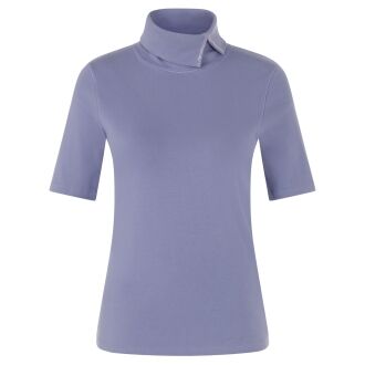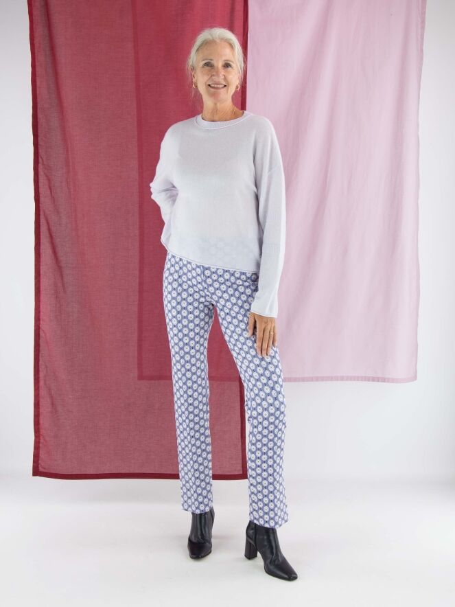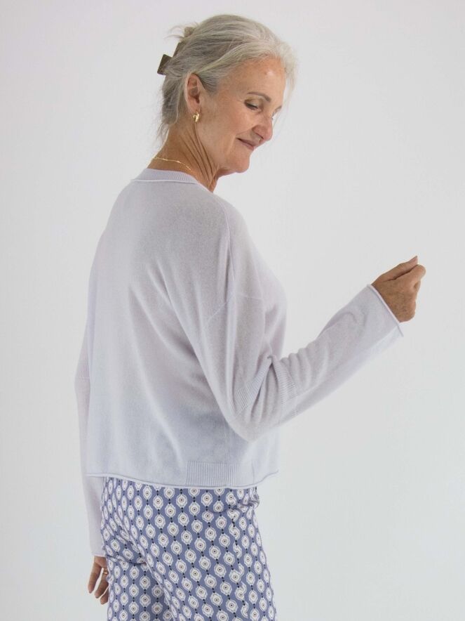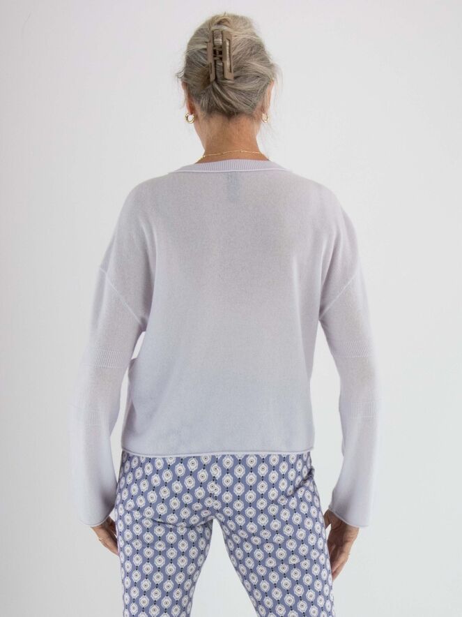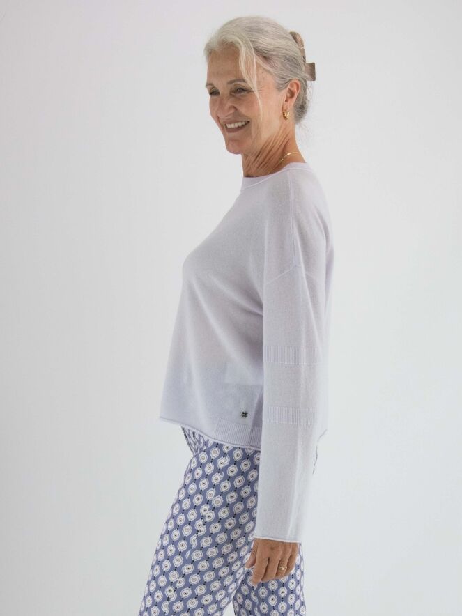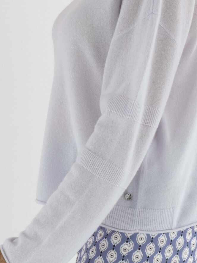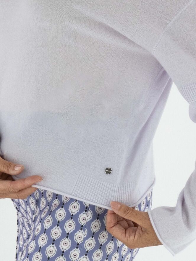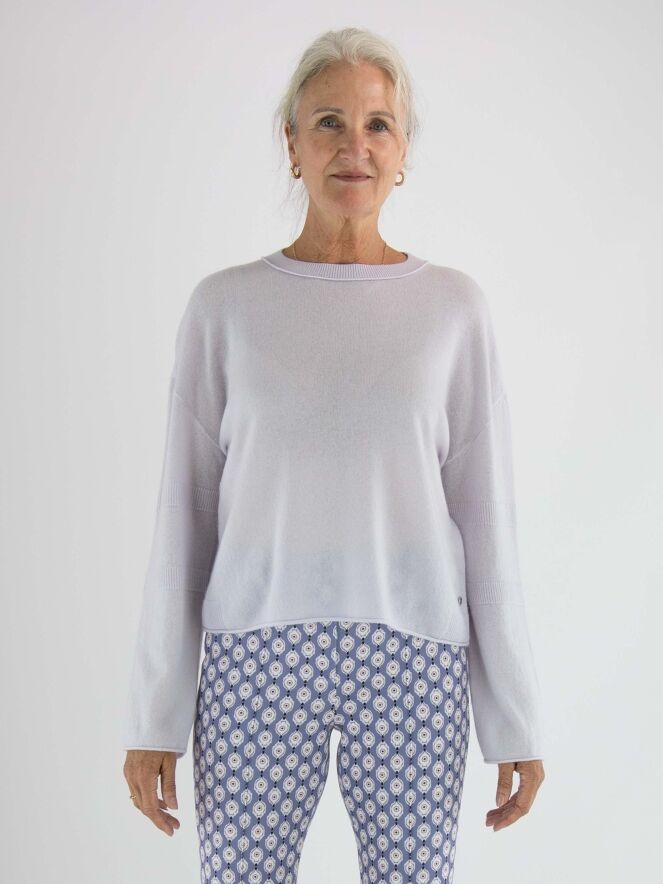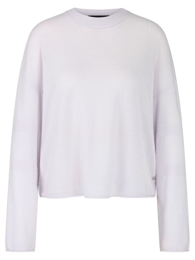 Pullover von Marc Cain in einem pastell-lilafarbenen Ton. Der Pullover hat einen Rundhalsausschnitt und lange Ärmel. Direkt über und unter dem Ellbogen befindet sich eine fein gerippte, gestrickte Blende. Dieser Pullover sollte von Hand gewaschen werden.