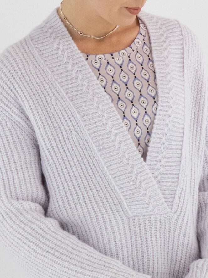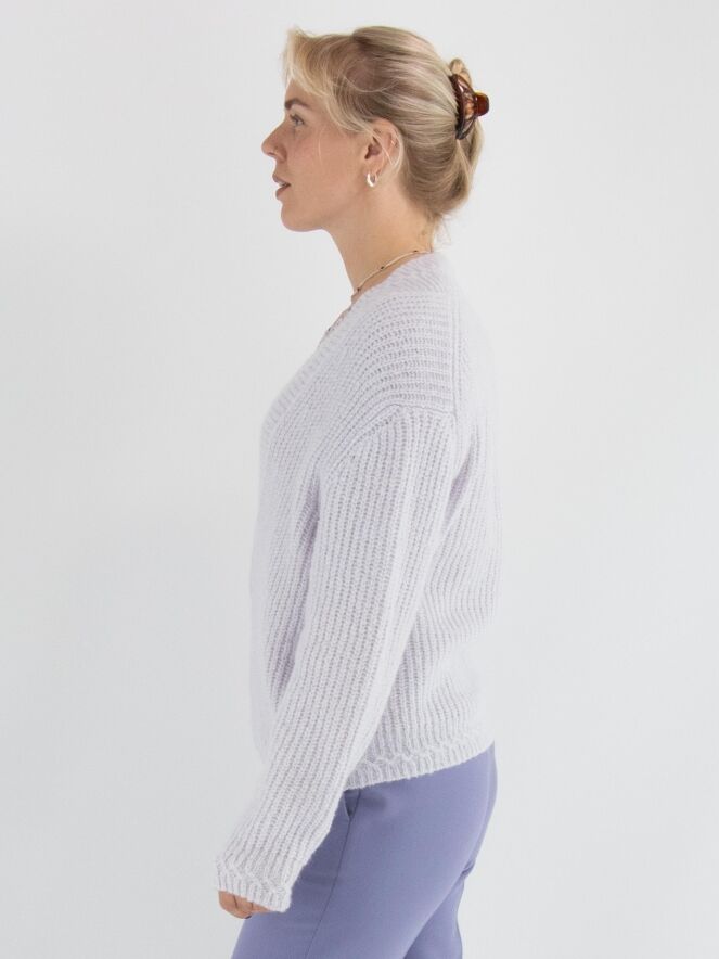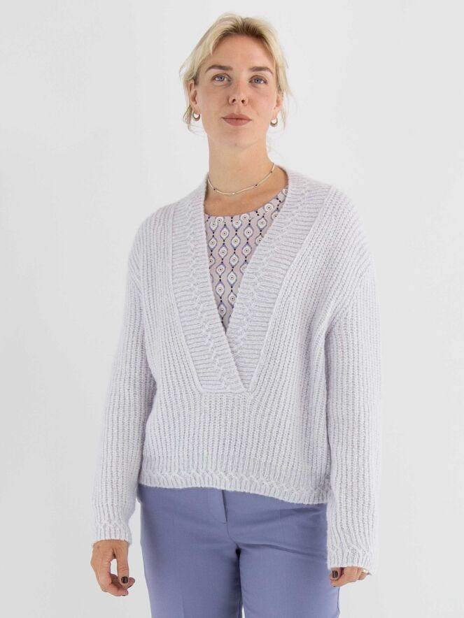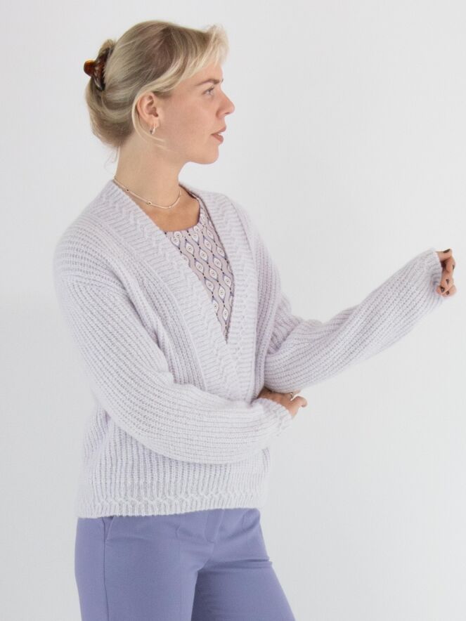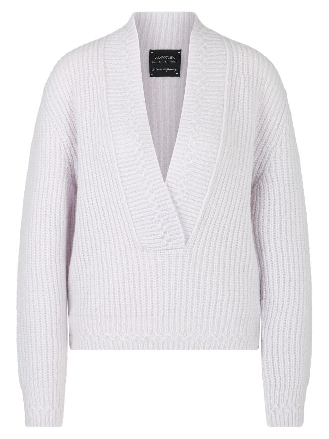 Ein kurzer Pullover von Marc Cain in Pastelllila. Der Pullover hat einen tiefen V-Ausschnitt mit einem breiten gestrickten Bündchen entlang des Randes. Dieser Pullover sollte von Hand gewaschen werden.