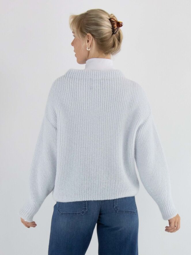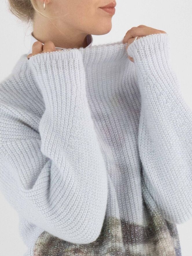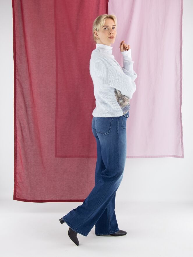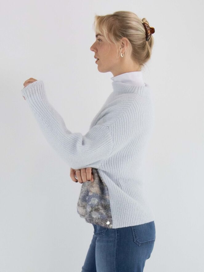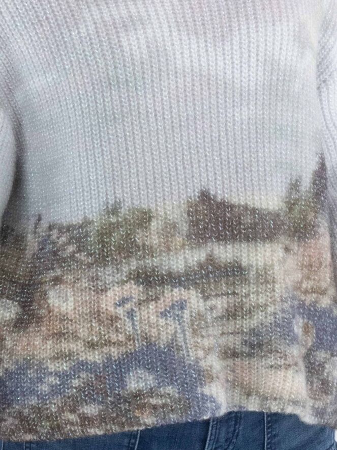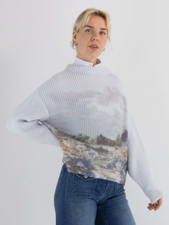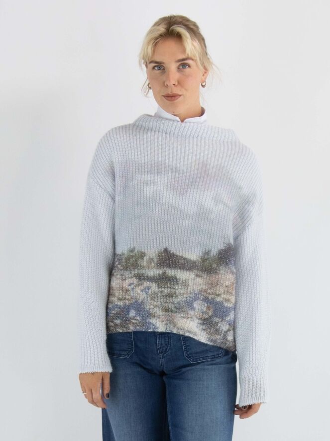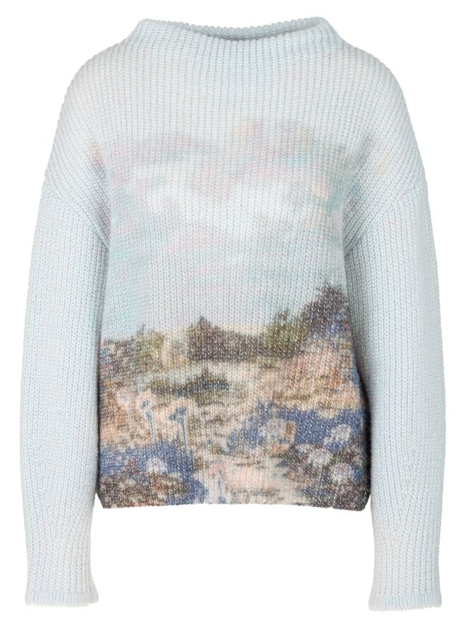 Ein Pullover von Marc Cain, gestrickt im Patentmuster, mit einem grafischen Landschaftsprint in mehreren Farben auf hellblauem Hintergrund. Der Pullover hat einen U-Boot-Ausschnitt und lange Ärmel. Dieser Pullover sollte von Hand gewaschen werden.
