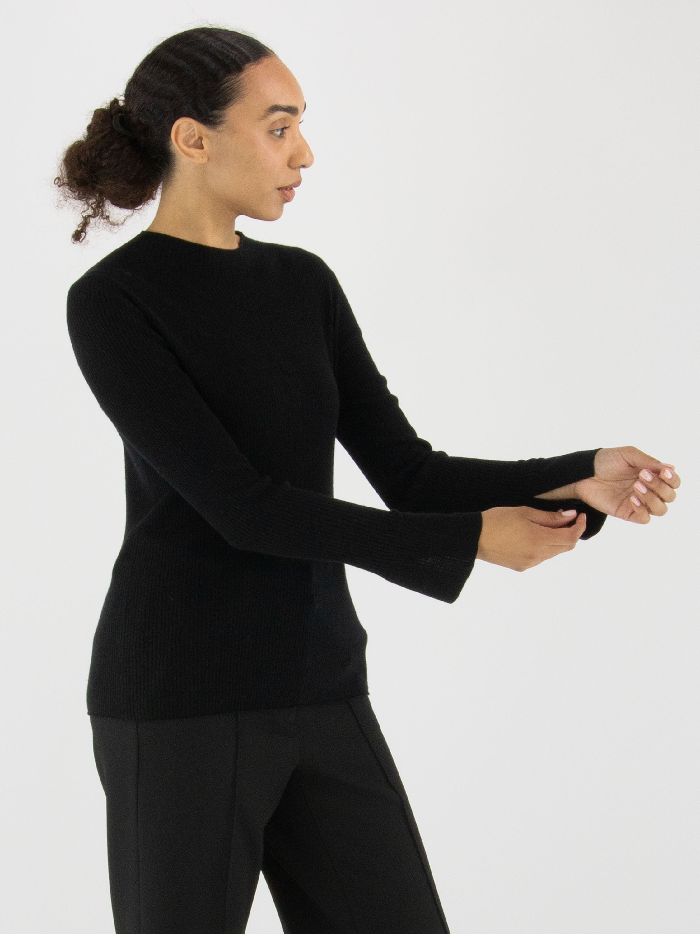 Ein fein gestrickter Pullover von Marc Cain in Schwarz. Er hat eine gerippte Struktur mit einer vertikalen Linie aus Blumenmotiven in der vorderen Mitte. Der Pullover hat lange Ärmel und einen runden Ausschnitt und sollte von Hand gewaschen werden.