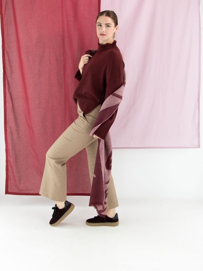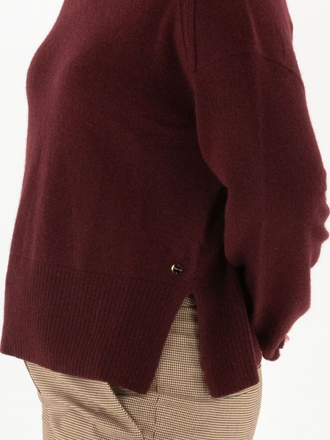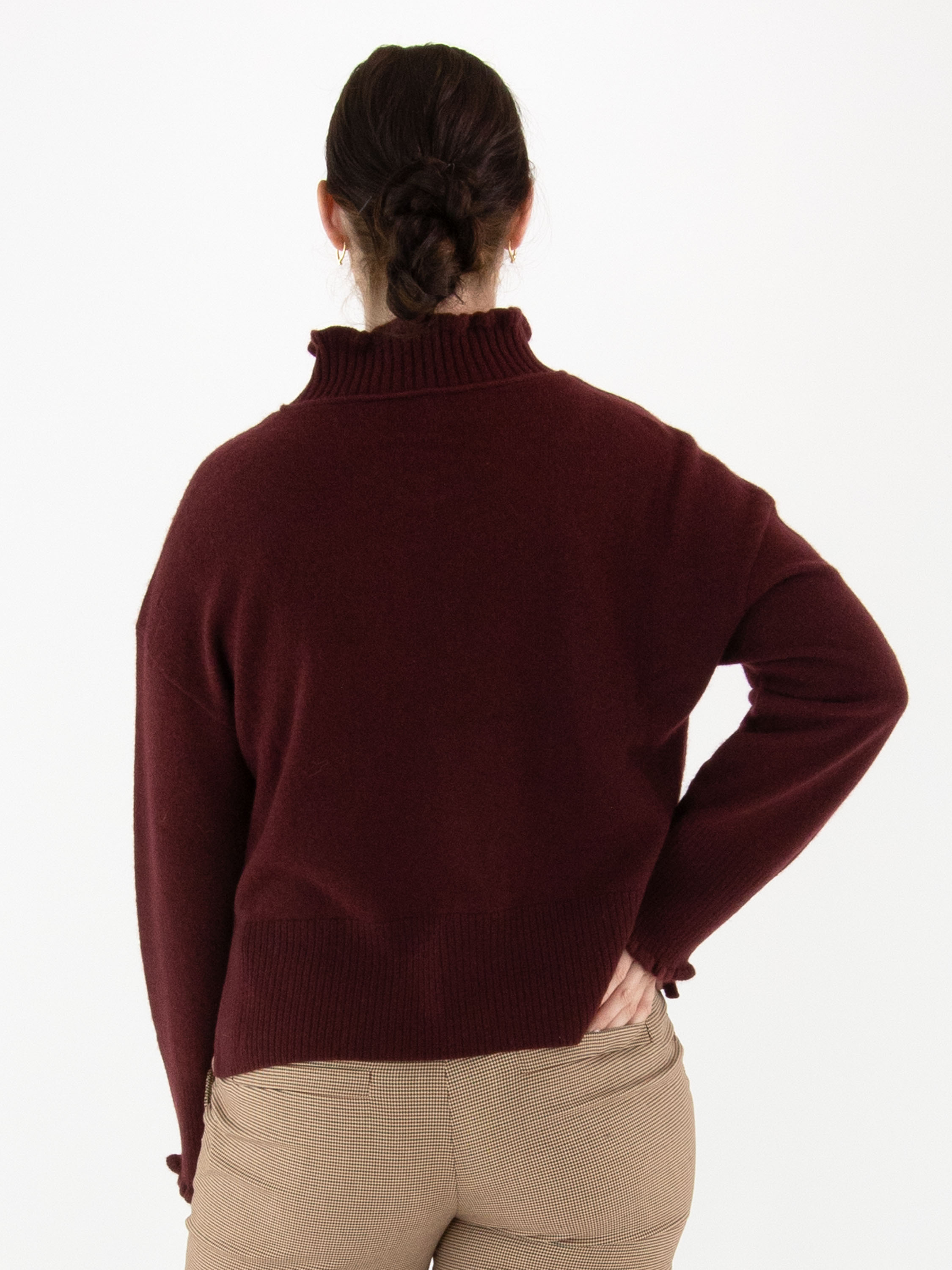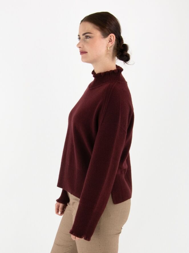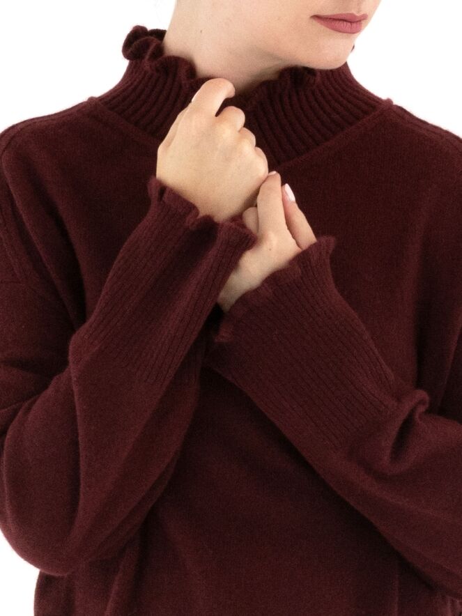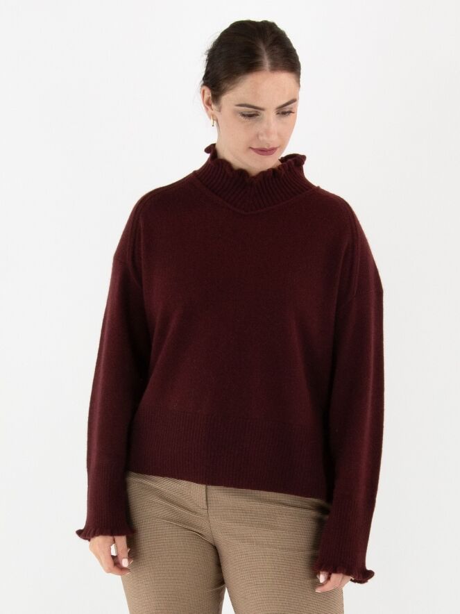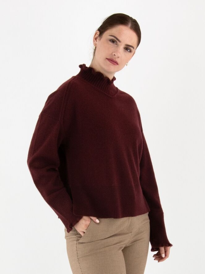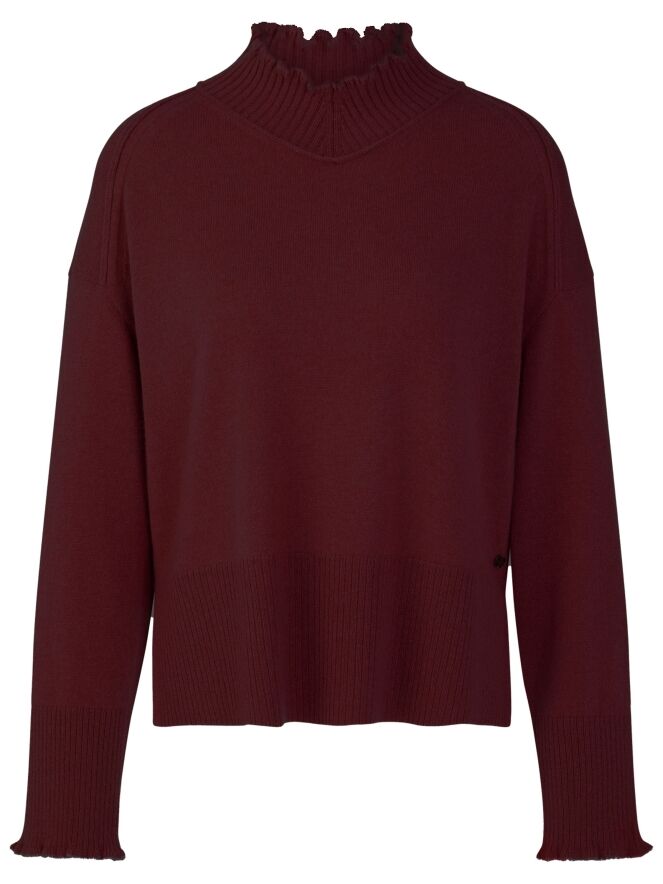 Ein Pullover von Marc Cain in Bordeauxrot. Er hat einen hohen, fallenden Rollkragen mit grob gerippter Blende. Die Ärmelabschlüsse sind gesmokt, und am Saum befindet sich ein breiter Rippbund. Dieser Pullover sollte von Hand gewaschen werden.
