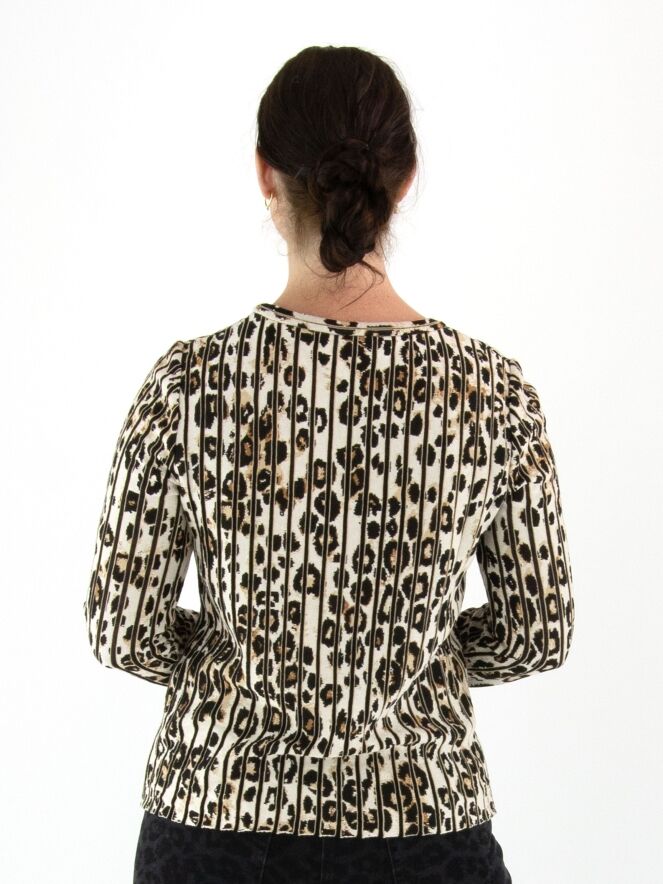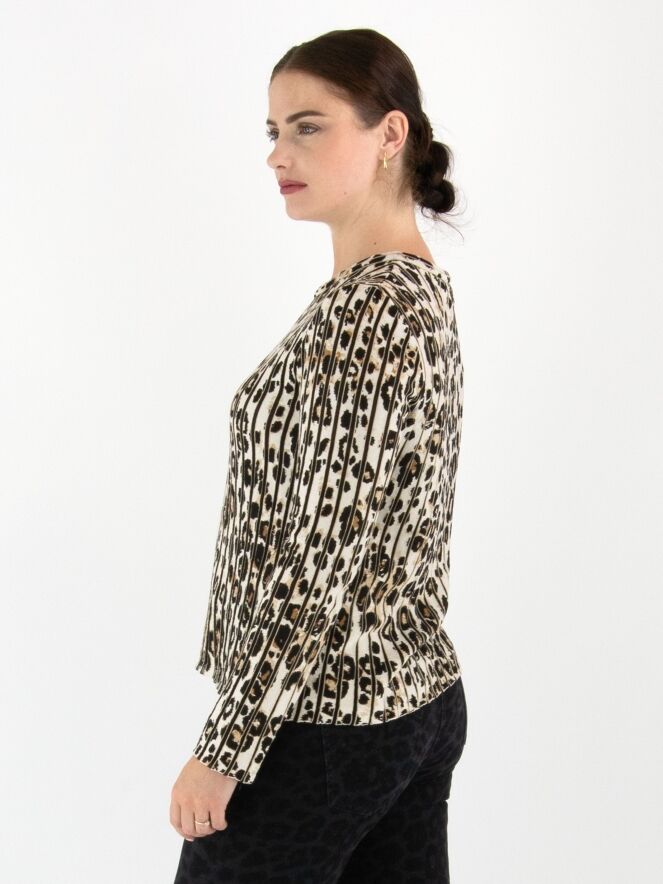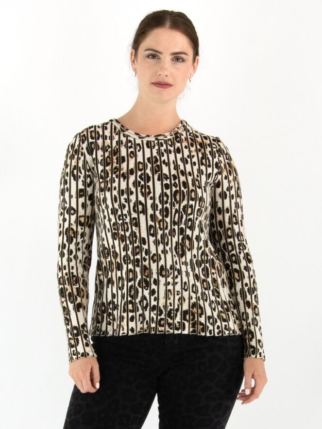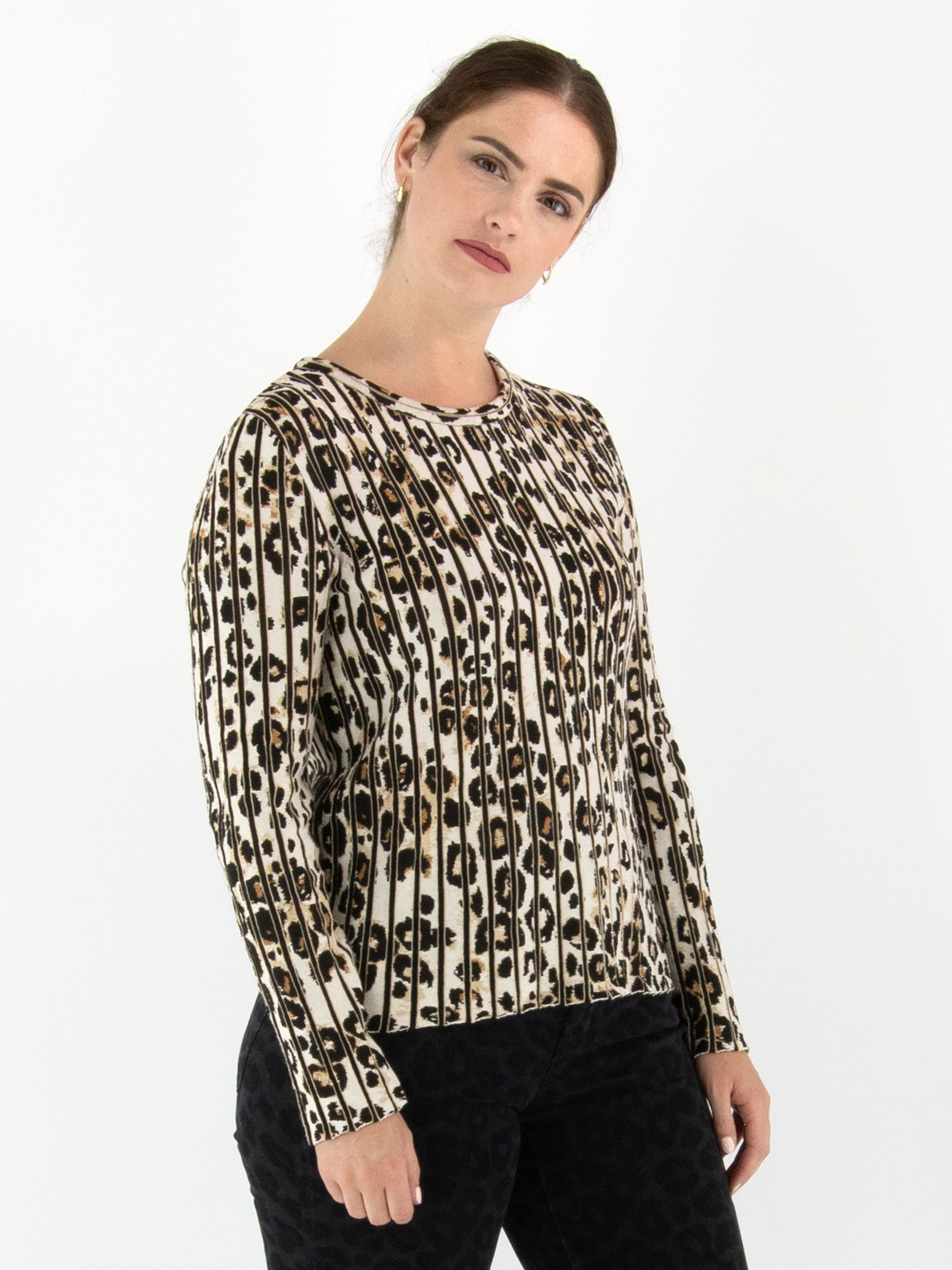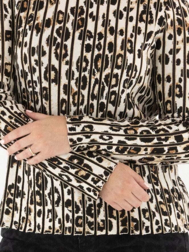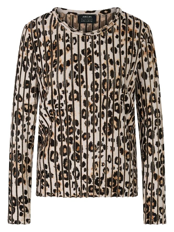 Ein Pullover von Marc Cain mit einem Leopardenmuster in verschiedenen Braun- und Schwarztönen auf sandfarbenem Hintergrund. Im Print ist ein vertikales Streifenmuster in Schwarz eingearbeitet. Der Pullover hat einen runden Ausschnitt und lange Ärmel. Dieser Pullover kann bei 30 Grad gewaschen werden.
