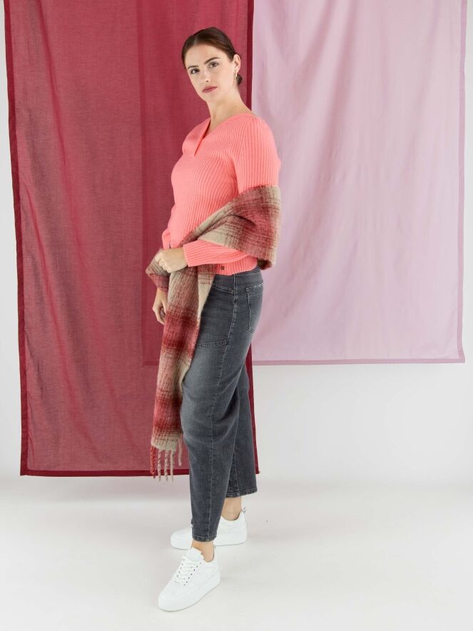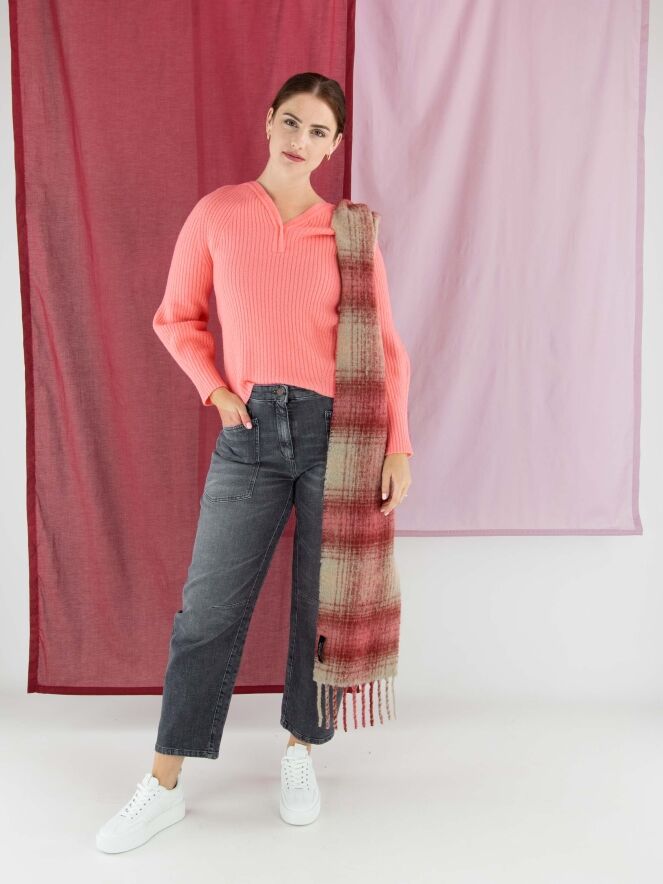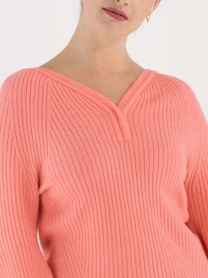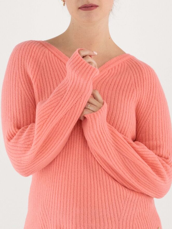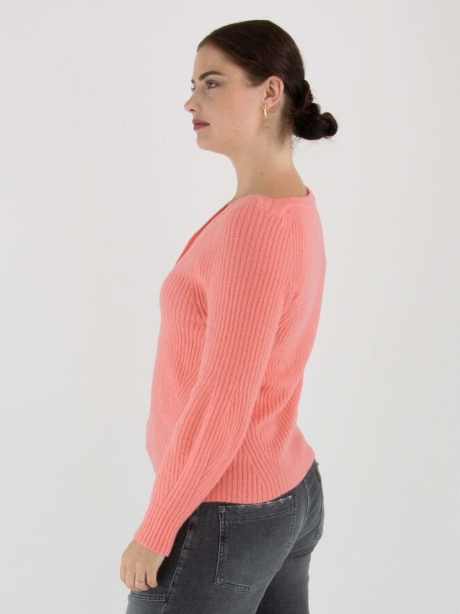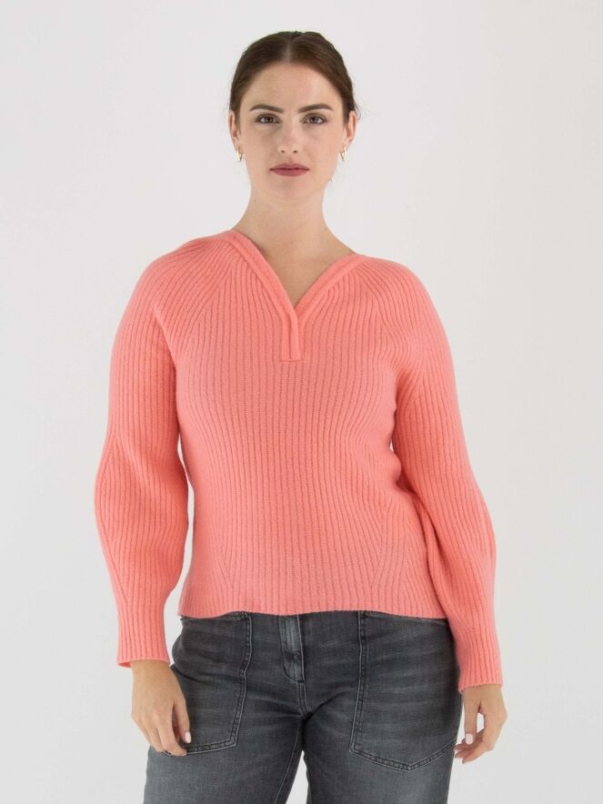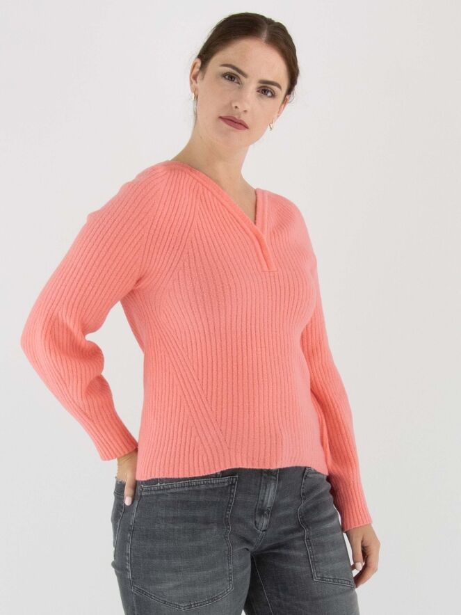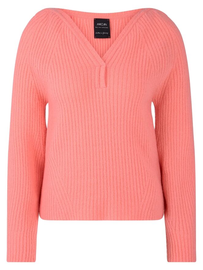 Ein gerippter Pullover von Marc Cain in Lachsrosa. Der V-Ausschnitt ist sanft abgerundet. Dieser Pullover sollte von Hand gewaschen werden.