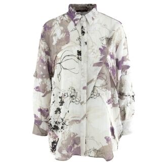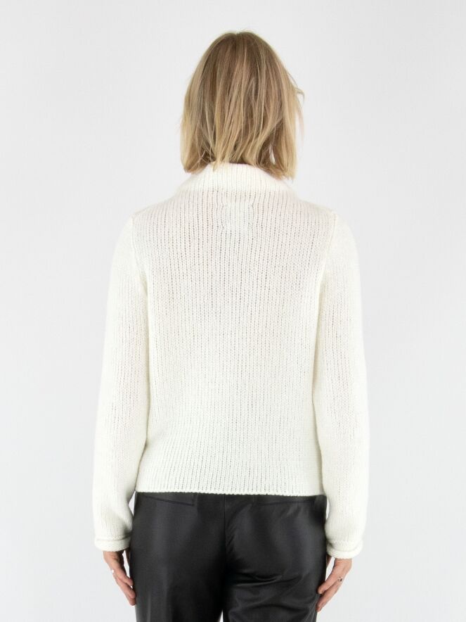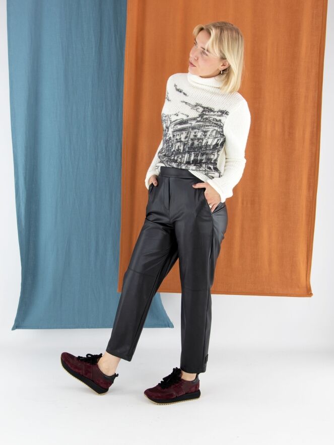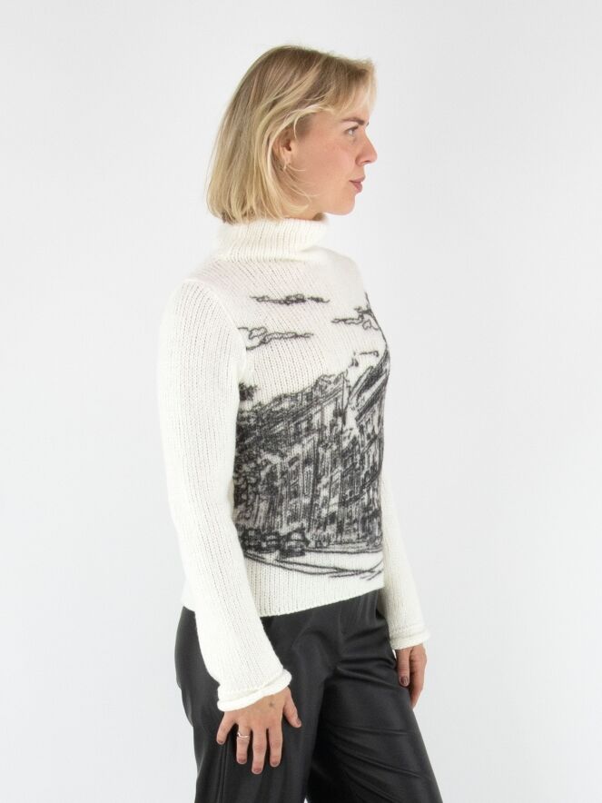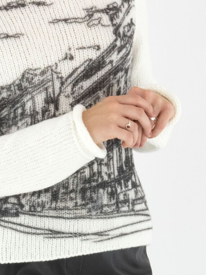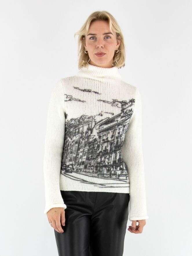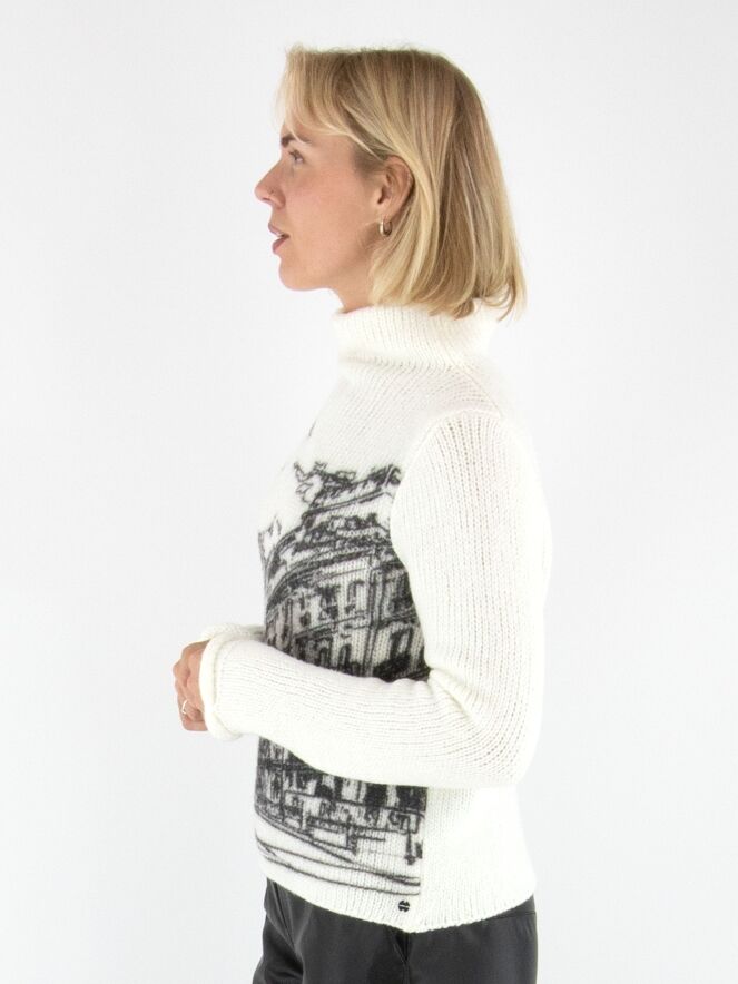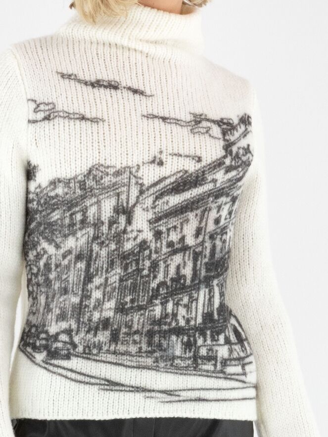 Dieser stilvolle Pullover von Marc Cain zeigt auf der Vorderseite ein Dessin mit der Skizze eines Gebäudes in Schwarz auf cremeweißem Hintergrund. Die Rückseite ist in einem einfarbigen Cremeweiß gehalten. Der Pullover hat einen eleganten fallenden Kragen und kann von Hand gewaschen werden.