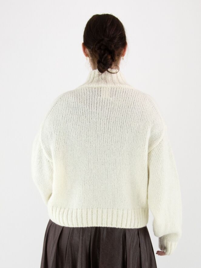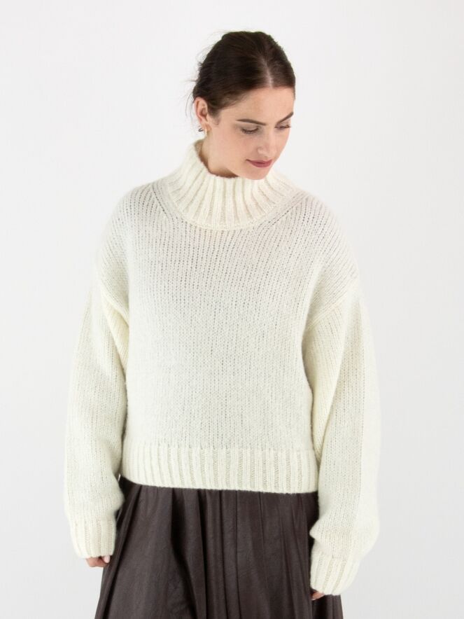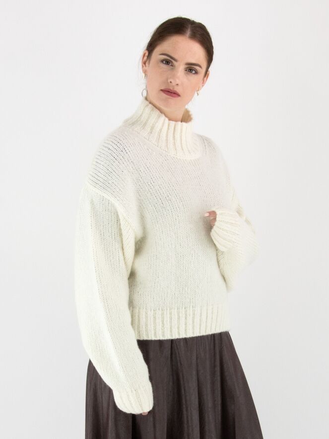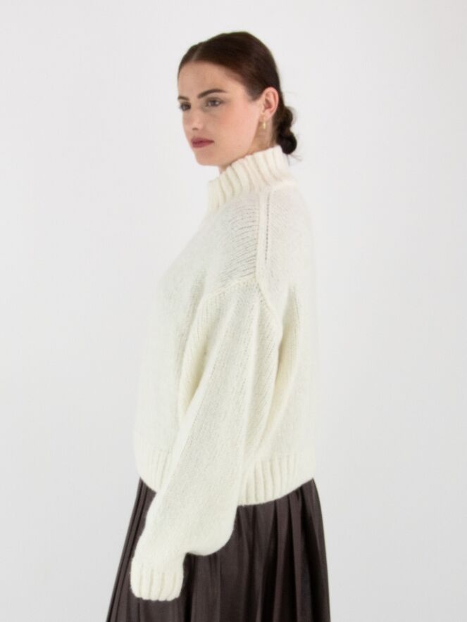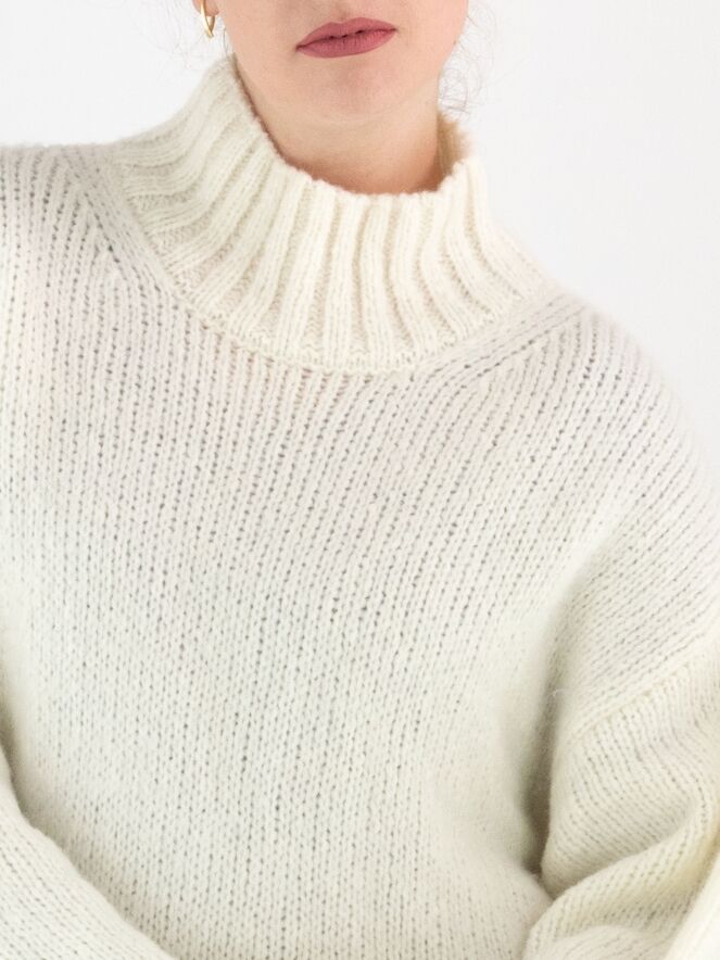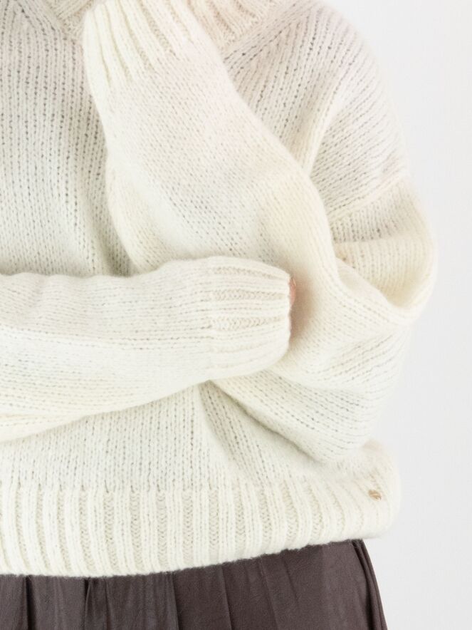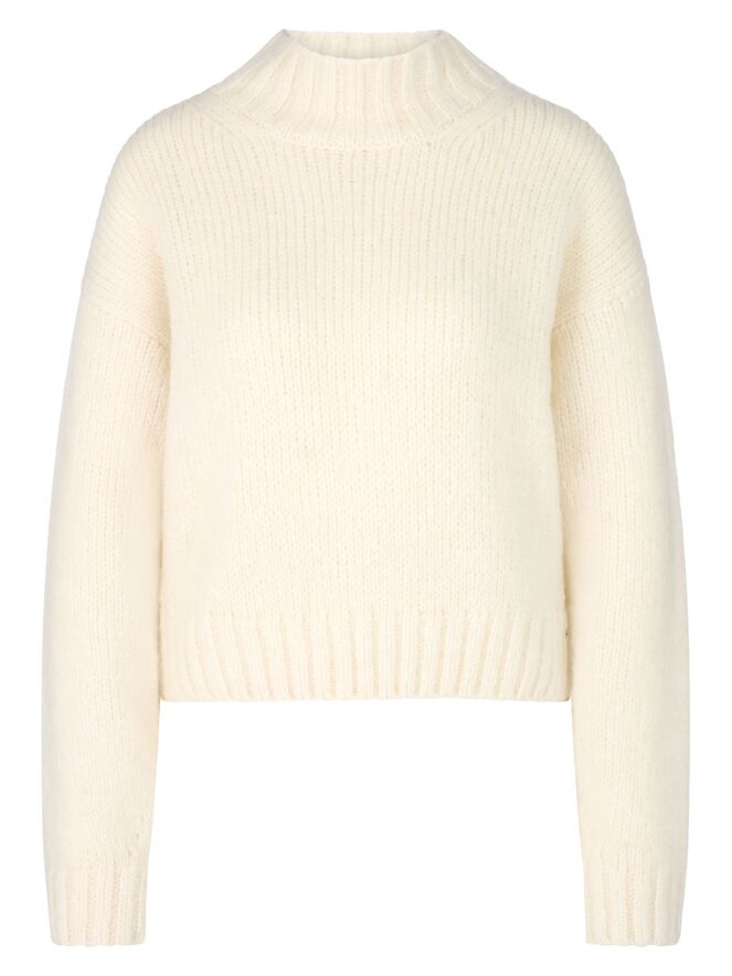 Pullover von Marc Cain in der Farbe Off-White. Der Rand des Rollkragens, die Ärmelbündchen und der Saum sind mit einem grob gestrickten Rippenmuster versehen. Dieser Pullover sollte von Hand gewaschen werden.