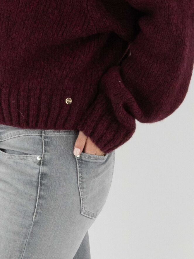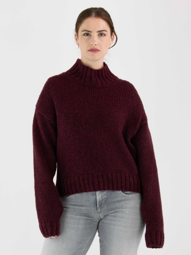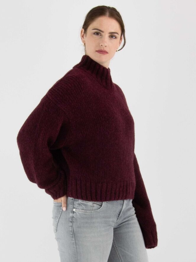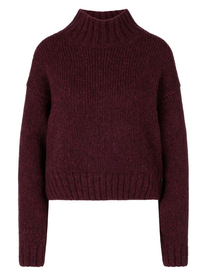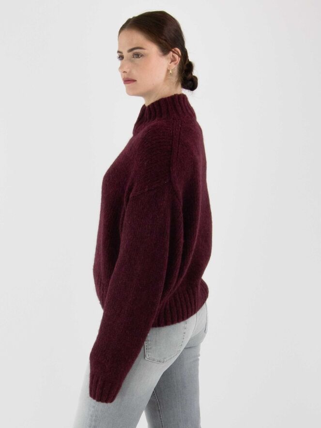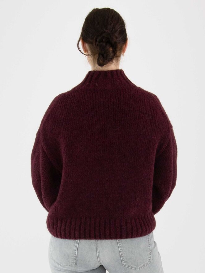 Pullover von Marc Cain in der Farbe Aubergine. Der Rollkragen, die Ärmelabschlüsse und der Saum sind mit einem grob gestrickten Rippenmuster versehen. Dieser Pullover sollte von Hand gewaschen werden.