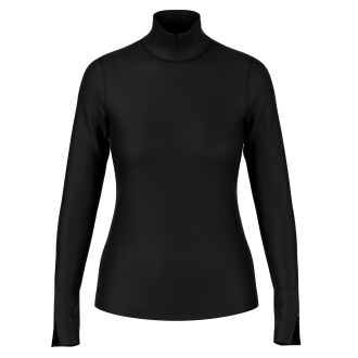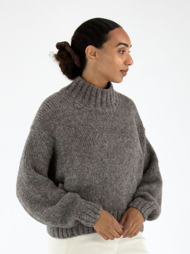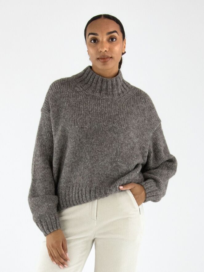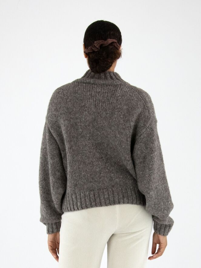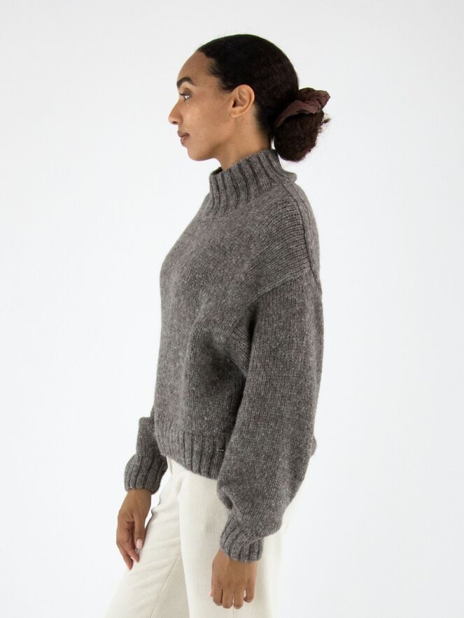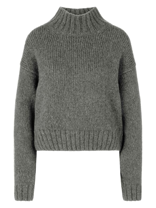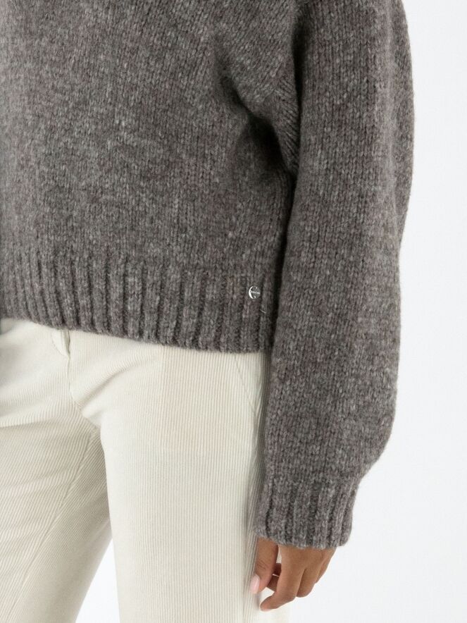 Pullover von Marc Cain in melierter Graunuance. Der Rand des Rollkragens, die Ärmelabschlüsse und der Saum sind mit einem grob gestrickten Rippenmuster versehen. Dieser Pullover sollte von Hand gewaschen werden.