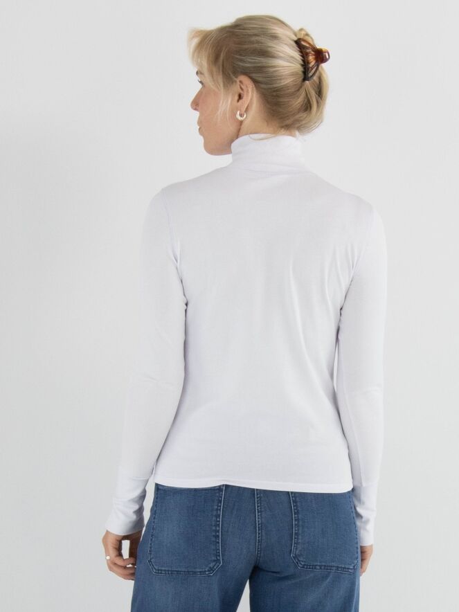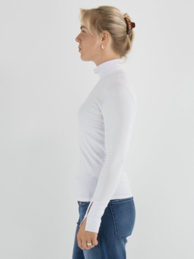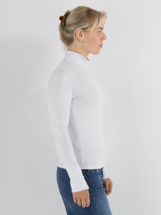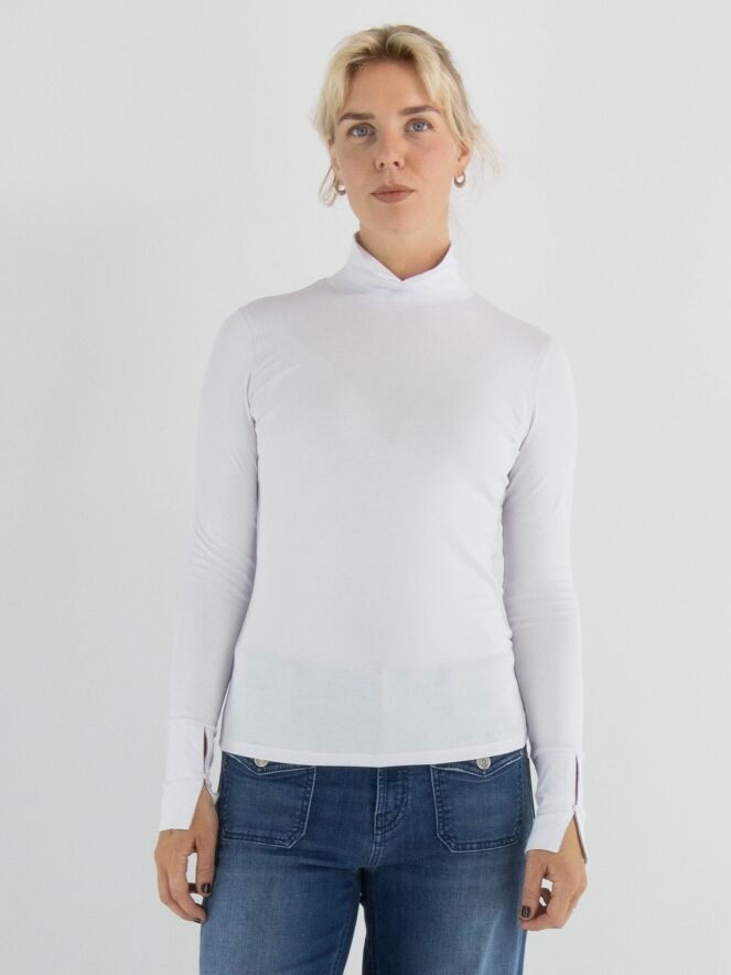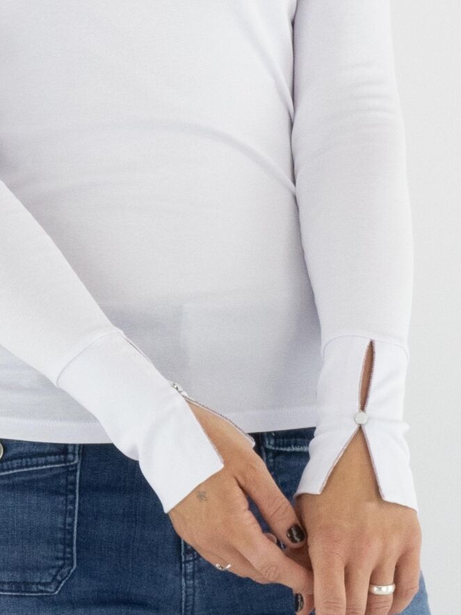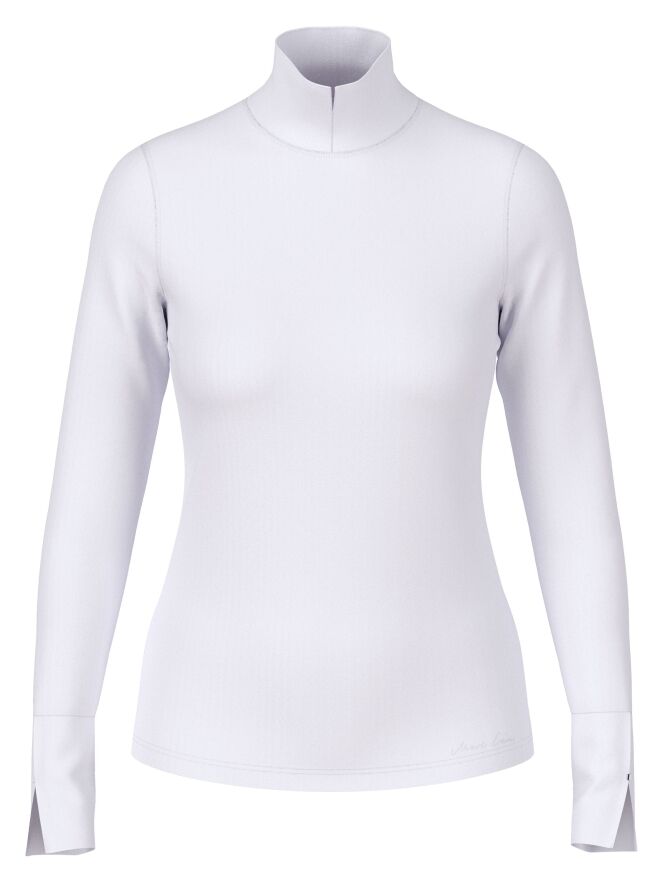 Shirt von Marc Cain in einem pastellfliederfarbenen Ton. Es hat lange Ärmel und einen Turtle-Neck mit einem kleinen Schlitz in der vorderen Mitte. Dieses Shirt kann bei 30 Grad gewaschen werden.