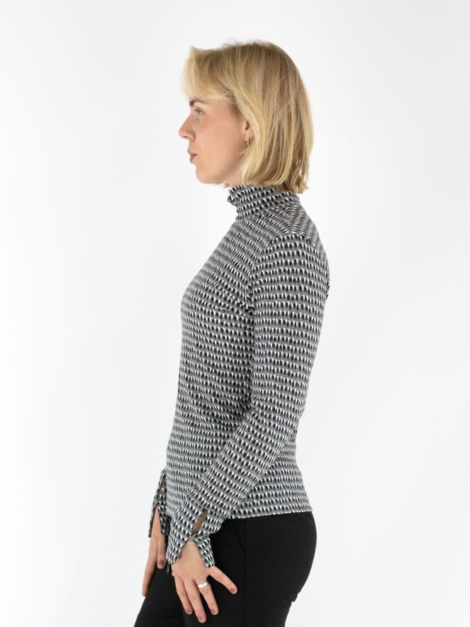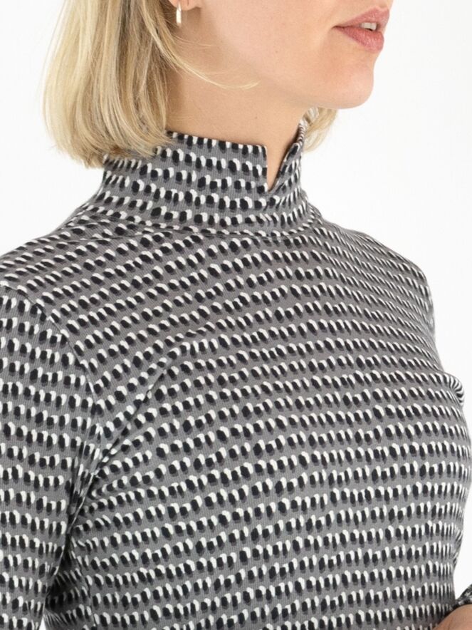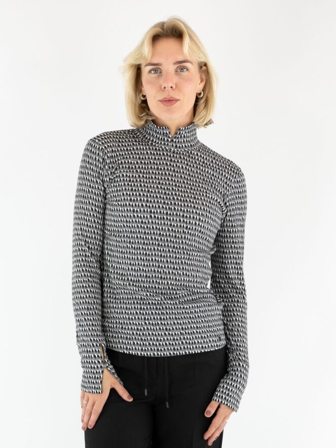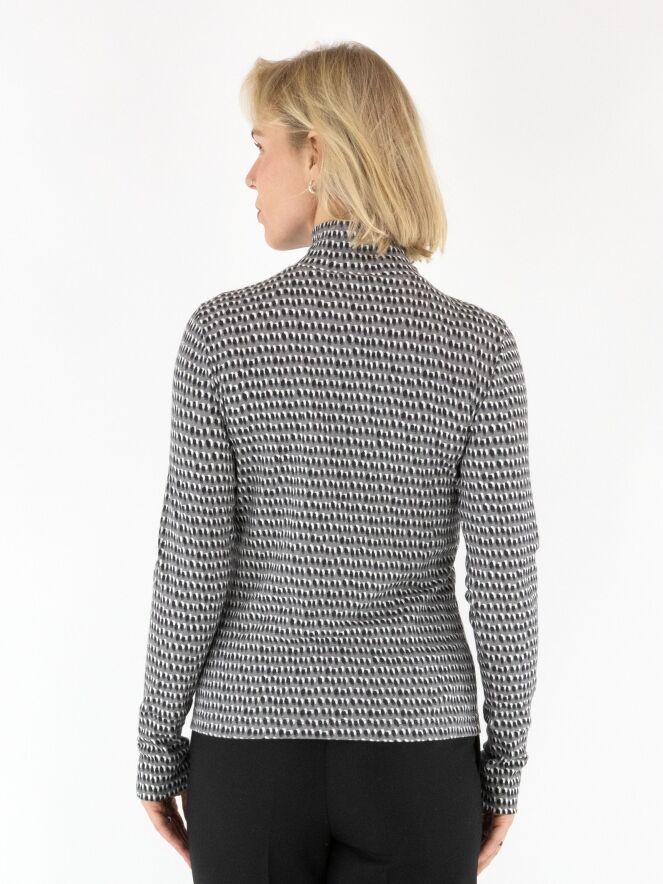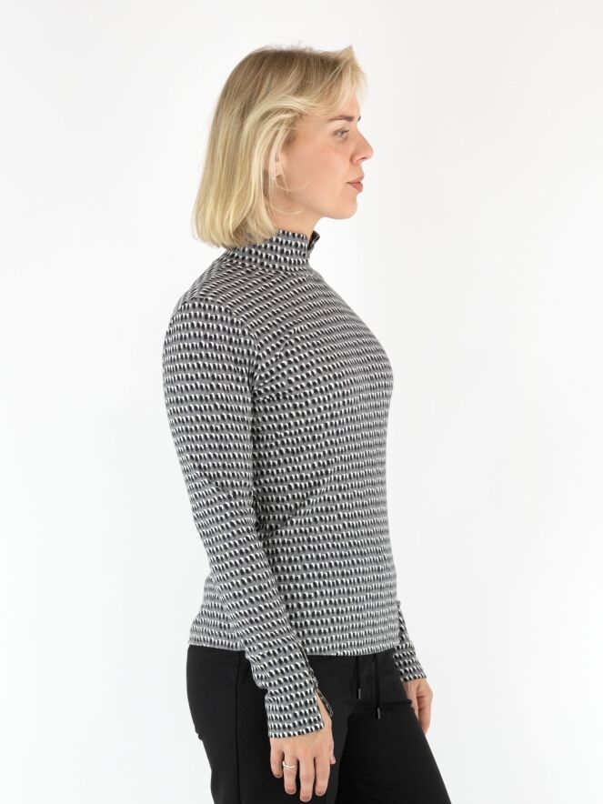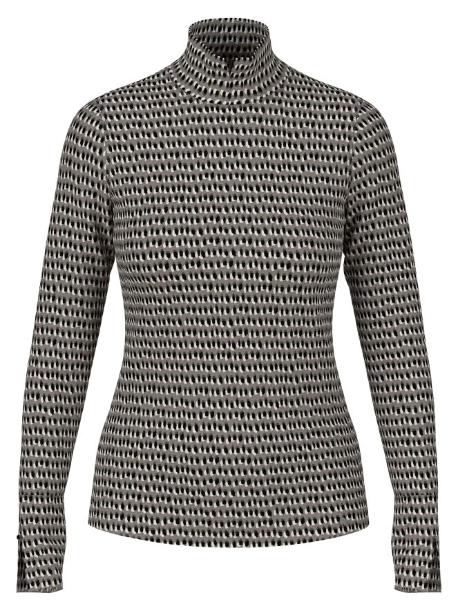 Fein geripptes Shirt von Marc Cain mit einem Punkteprint in Schwarz und Creme auf hellgrauem Hintergrund. Das Shirt hat einen Turtleneck und lange Ärmel. Dieses Shirt kann bei 30 Grad gewaschen werden.