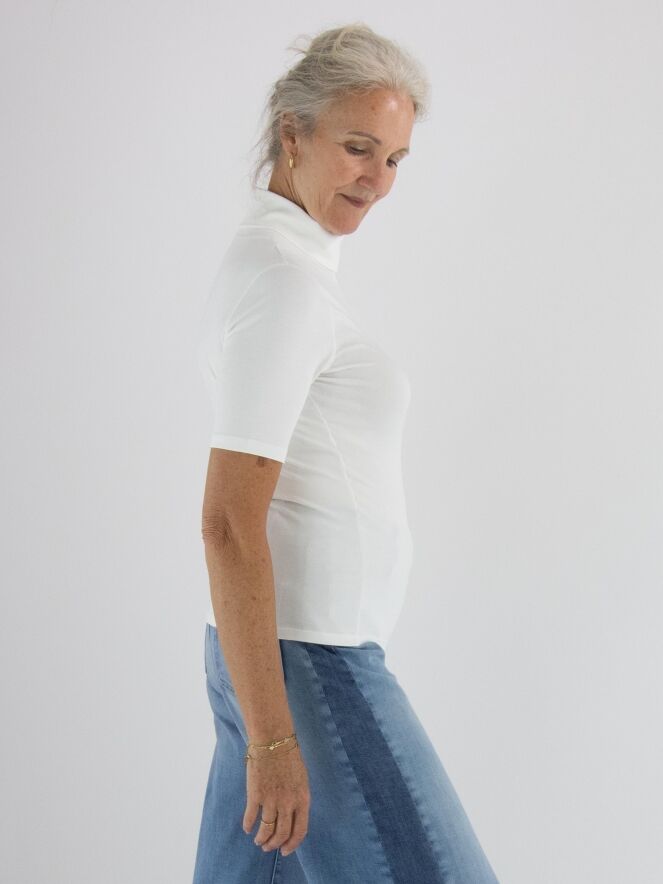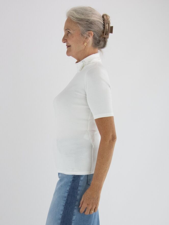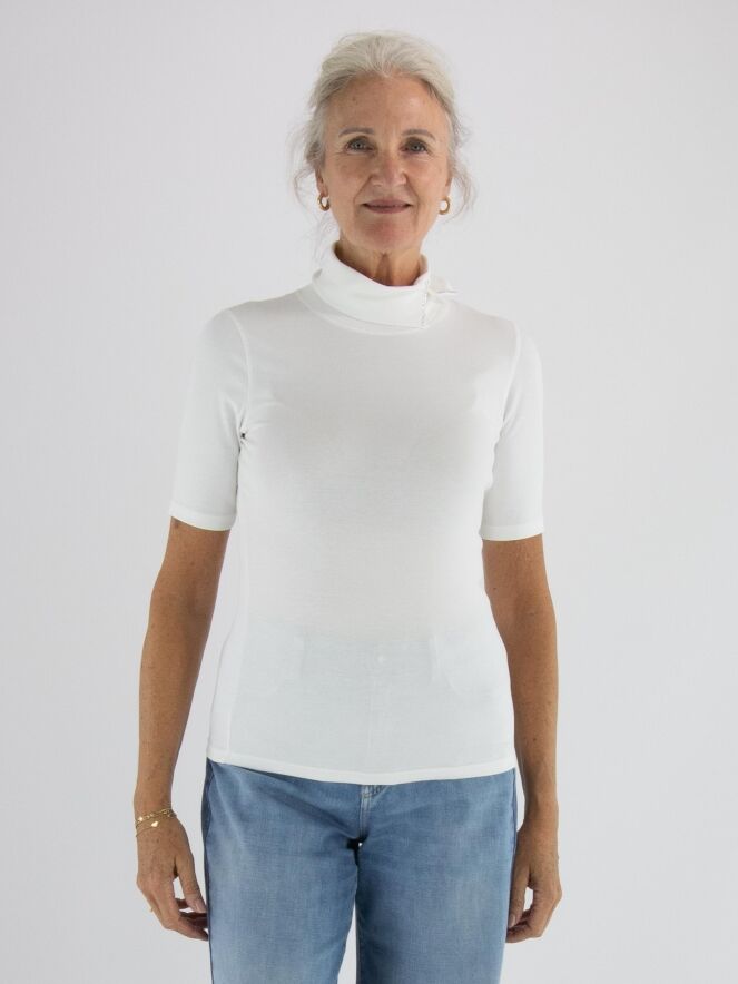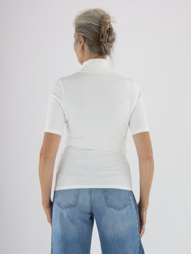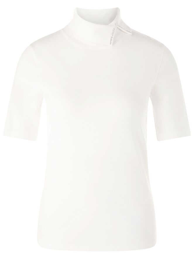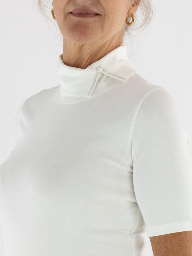 Shirt von Marc Cain in einem cremeweißen Farbton. Es hat kurze Ärmel und einen Turtlekragen mit einem kleinen Schlitz vorne links neben der Mitte. Entlang des Schlitzes sind dekorative Strasssteine angebracht. Dieses Shirt kann bei 30 Grad gewaschen werden.