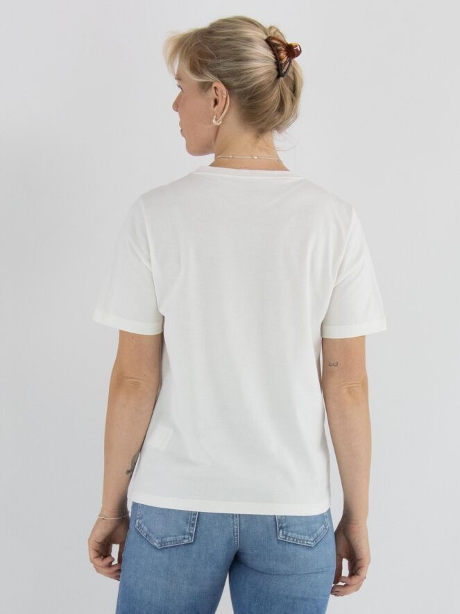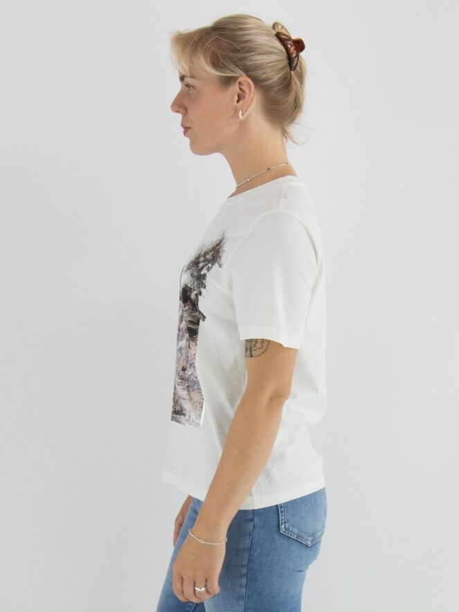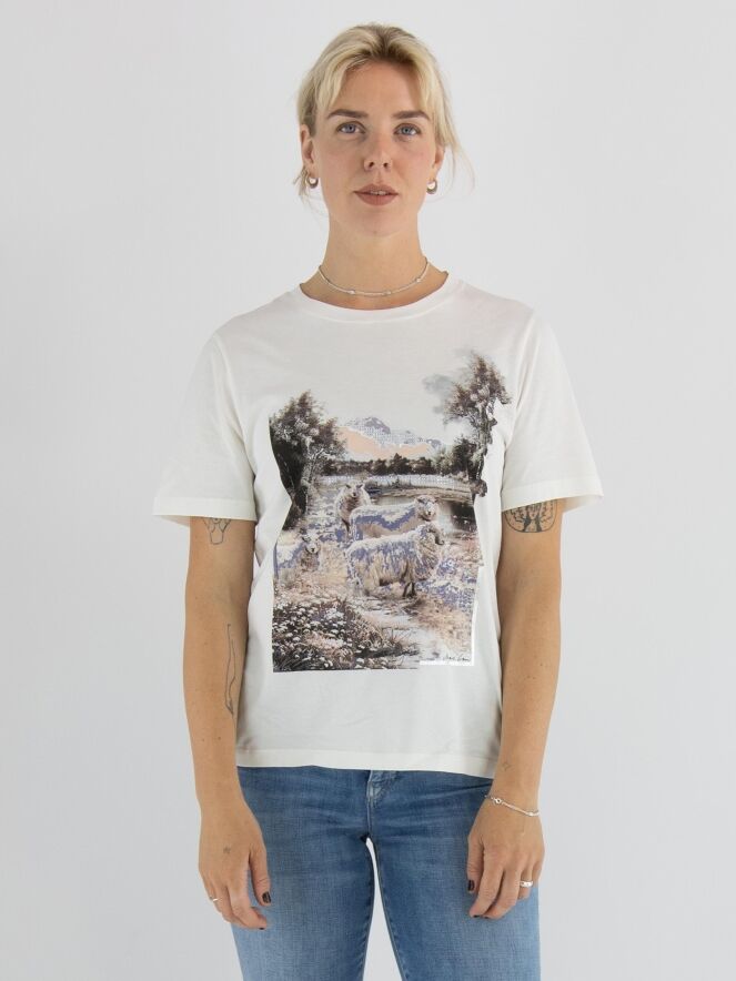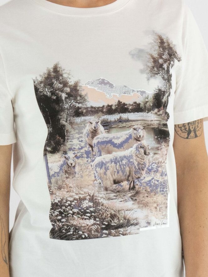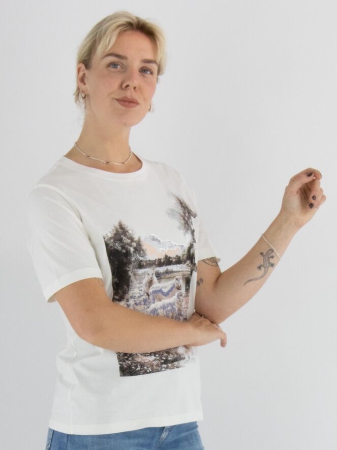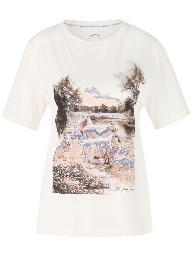 Ein Shirt von Marc Cain mit einem Landschaftsprint mit Schafen auf der Vorderseite. Der Print ist in Lila, Braun und Lachsrosa auf einem cremeweißen Hintergrund gehalten. Das Shirt hat einen Rundhalsausschnitt und kurze Ärmel und kann bei 30 Grad gewaschen werden.