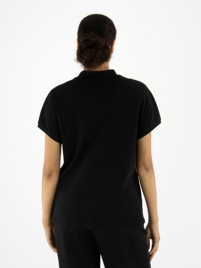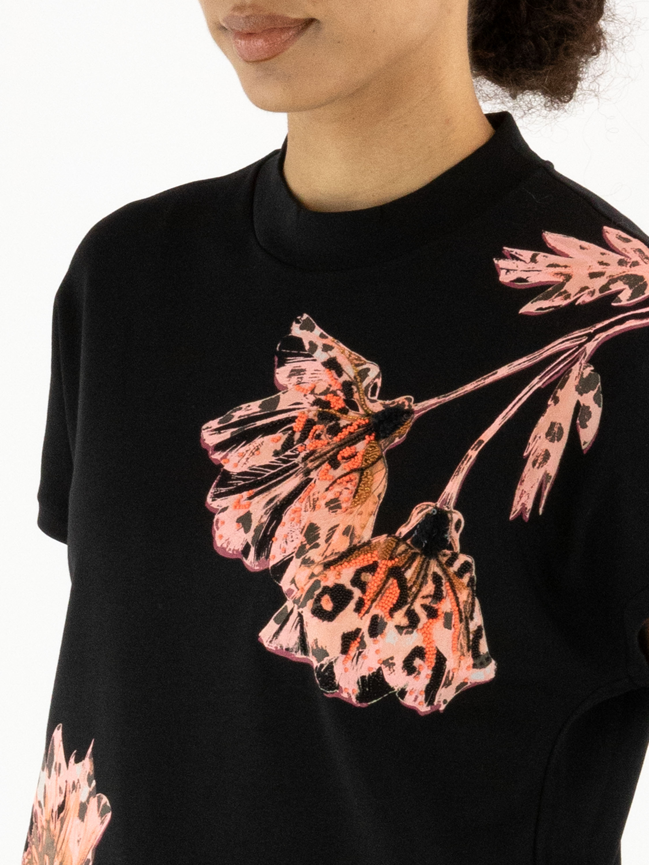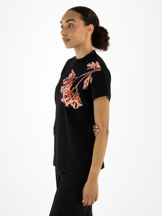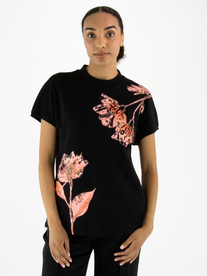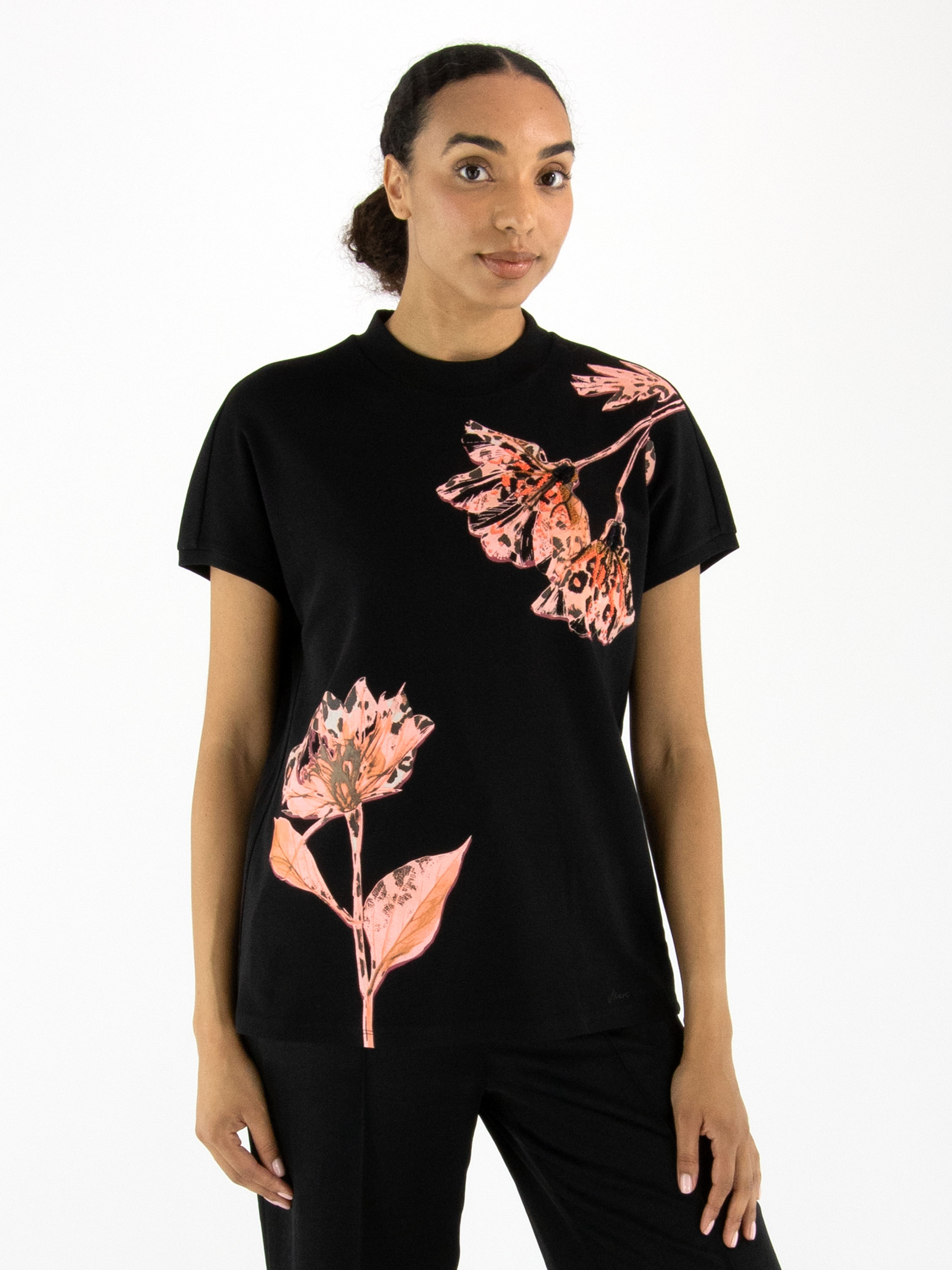 Ein Shirt von Marc Cain mit einem Blumenprint in verschiedenen Rosa-, Braun- und Schwarztönen auf schwarzem Hintergrund. In das Muster sind schwarze und korallenrote Strasssteine eingearbeitet. Das Shirt hat angeschnittene Ärmel und einen runden Ausschnitt. Dieses Shirt kann bei 30 Grad gewaschen werden.