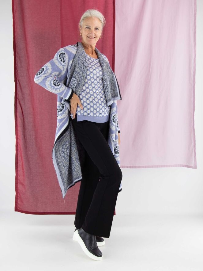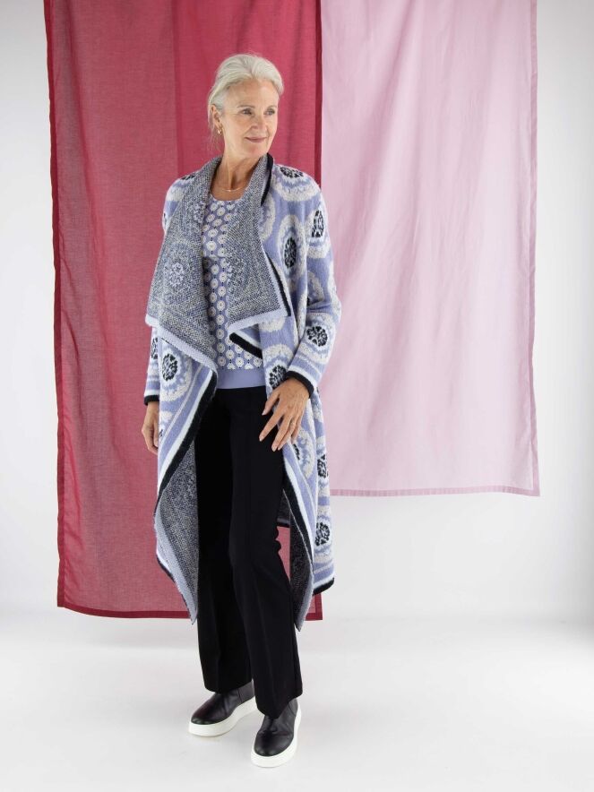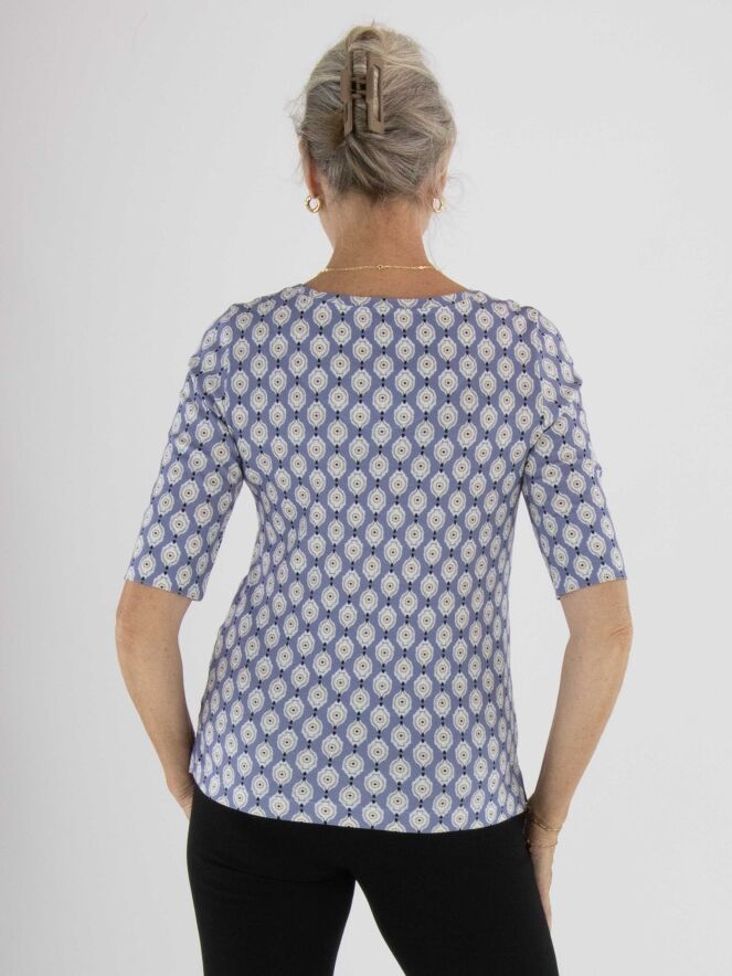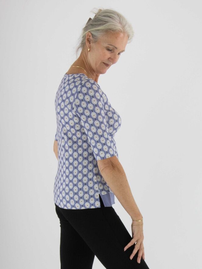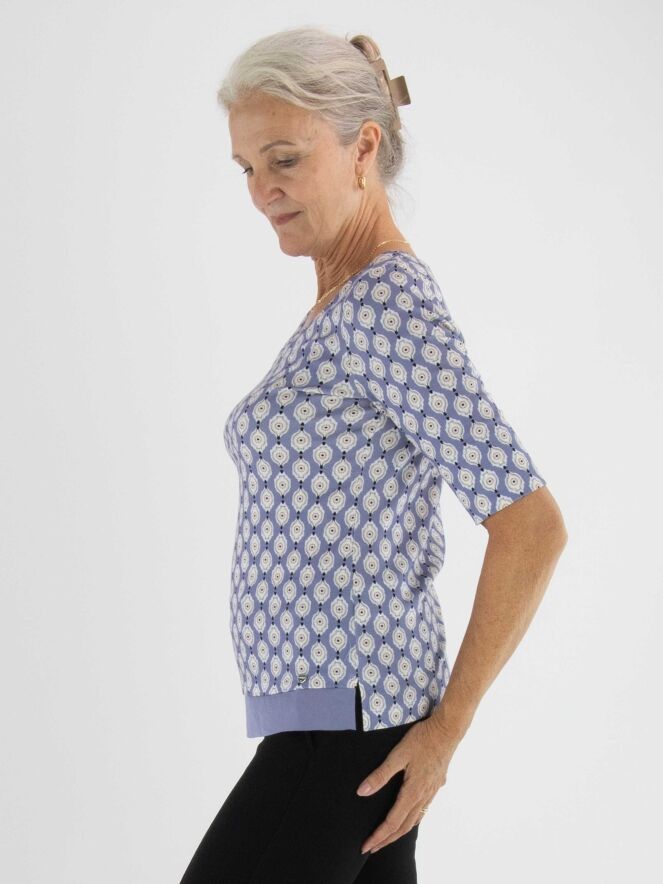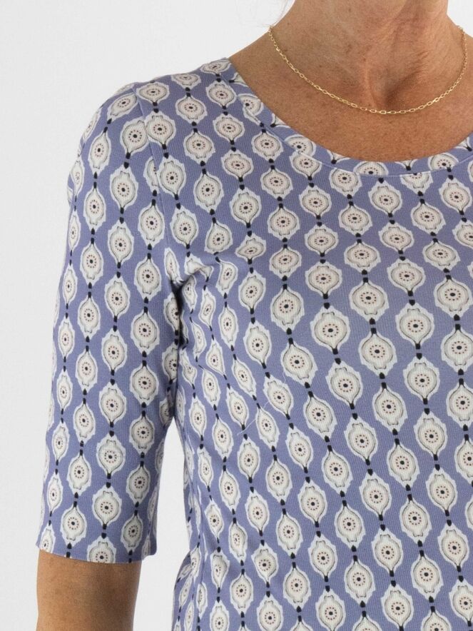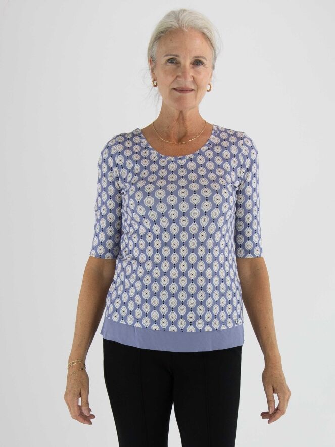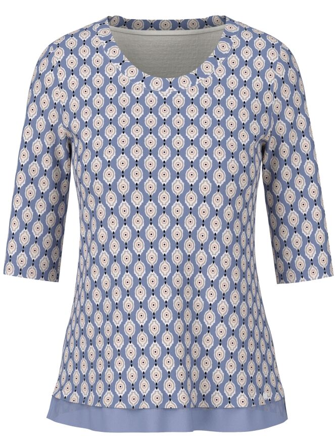 Shirt von Marc Cain mit einem grafischen Print in Beige, Rosa, Cremeweiß und Schwarz auf einem fliederfarbenen Hintergrund. Am vorderen Saum befindet sich eine breite Voileblende in Rosé. Das Shirt hat einen Rundhalsausschnitt und kurze Ärmel. Es kann bei 30 Grad gewaschen werden.
