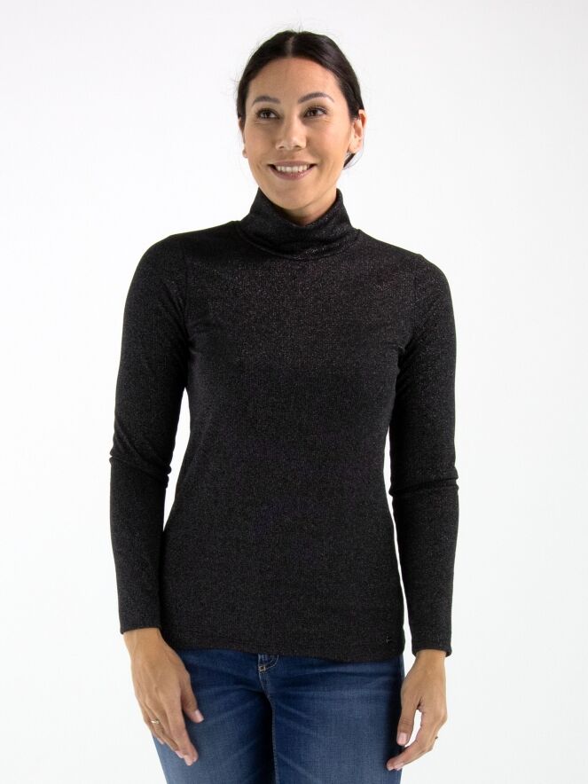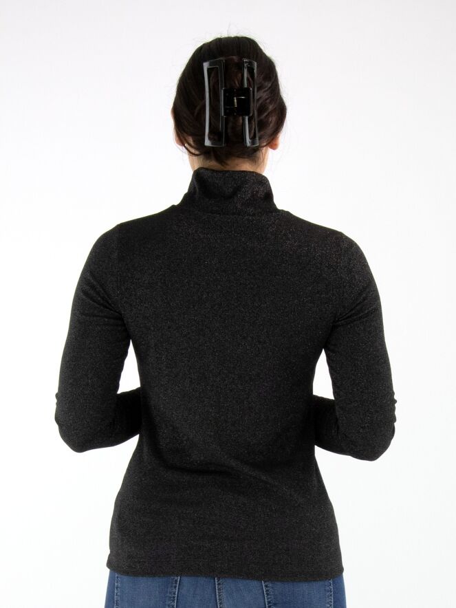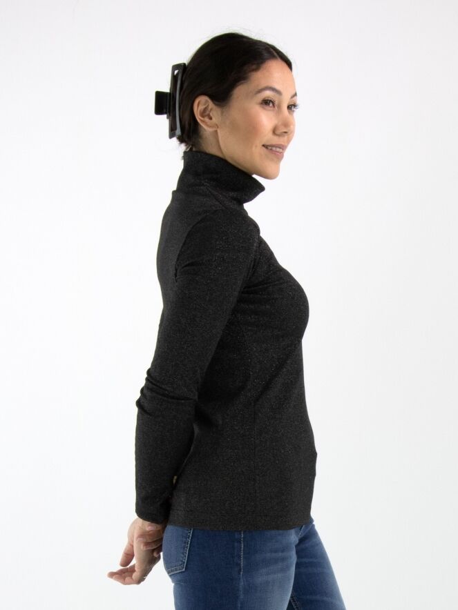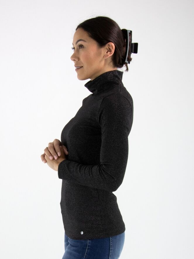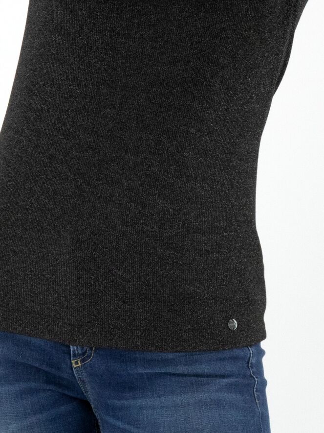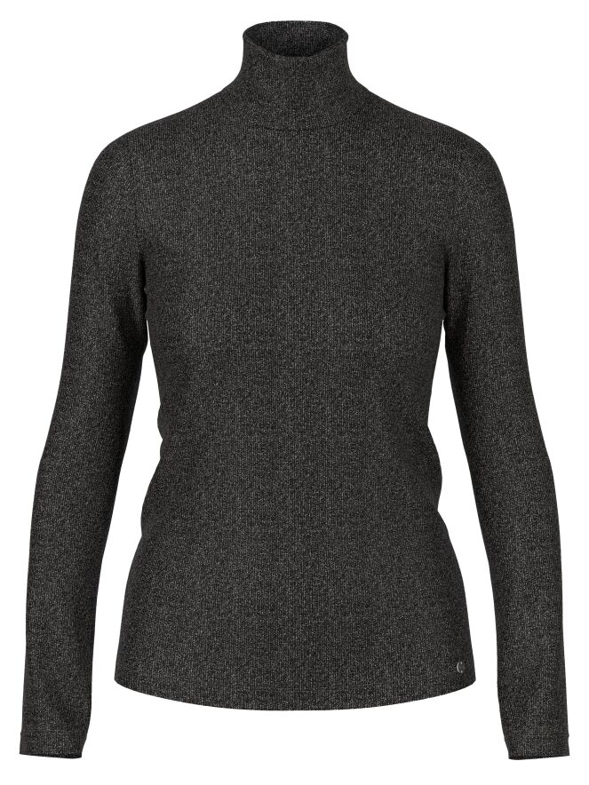 Pullover von Marc Cain in feiner Rippstruktur in Anthrazit. Der Stoff ist dezent mit Silberfaden durchzogen, was einen edlen Schimmer verleiht. Der Pullover hat einen weichen, fallenden Kragen und lange Ärmel. Dieser Pullover kann bei 30 Grad gewaschen werden.