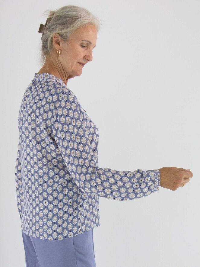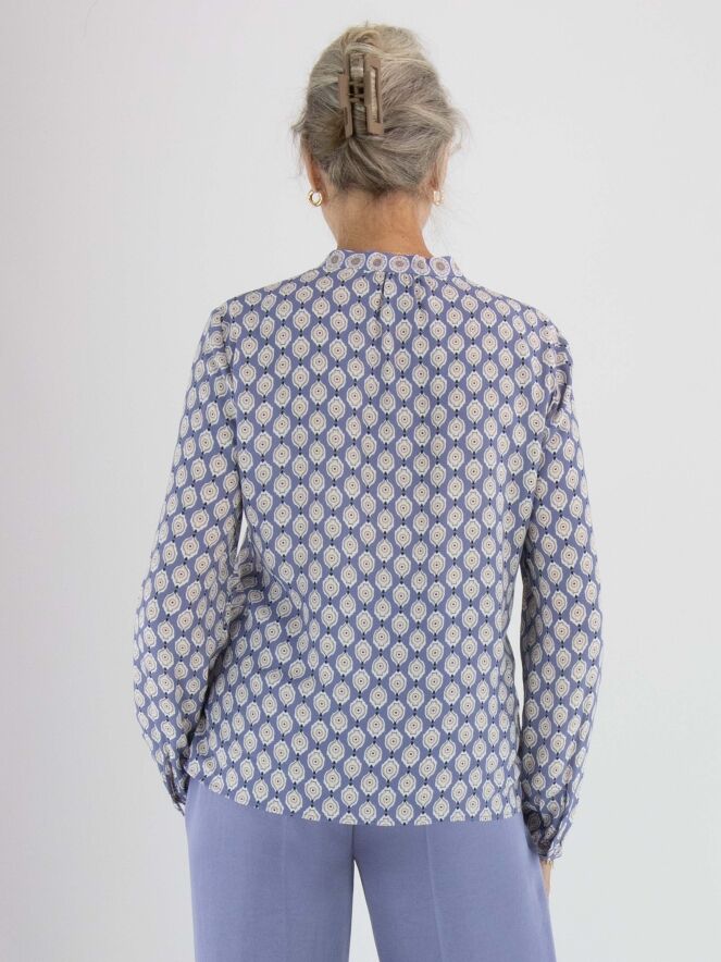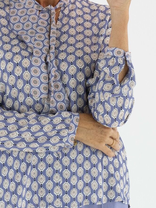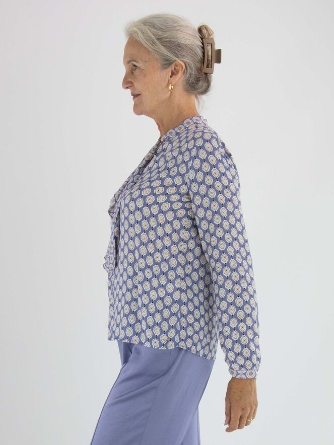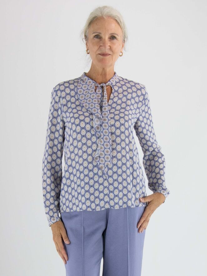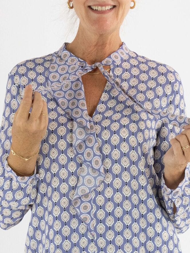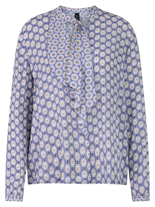 Bluse von Marc Cain mit einem grafischen Print in Rosa, Cremeweiß, Beige und Schwarz auf einem fliederfarbenen Hintergrund. Vom Ausschnitt verlaufen zwei Bänder, mit denen eine dekorative Schleife gebunden werden kann. Auf der rechten Seite zieht sich eine Volantkante vom Halsausschnitt bis zur Taille. Diese Bluse kann bei 30 Grad gewaschen werden.
