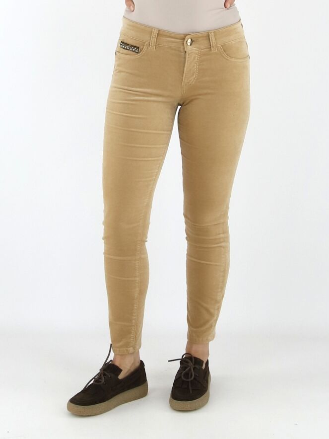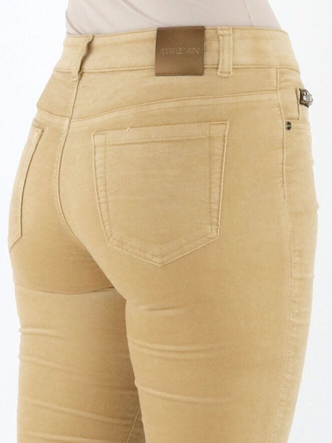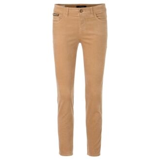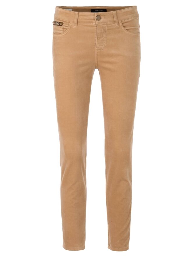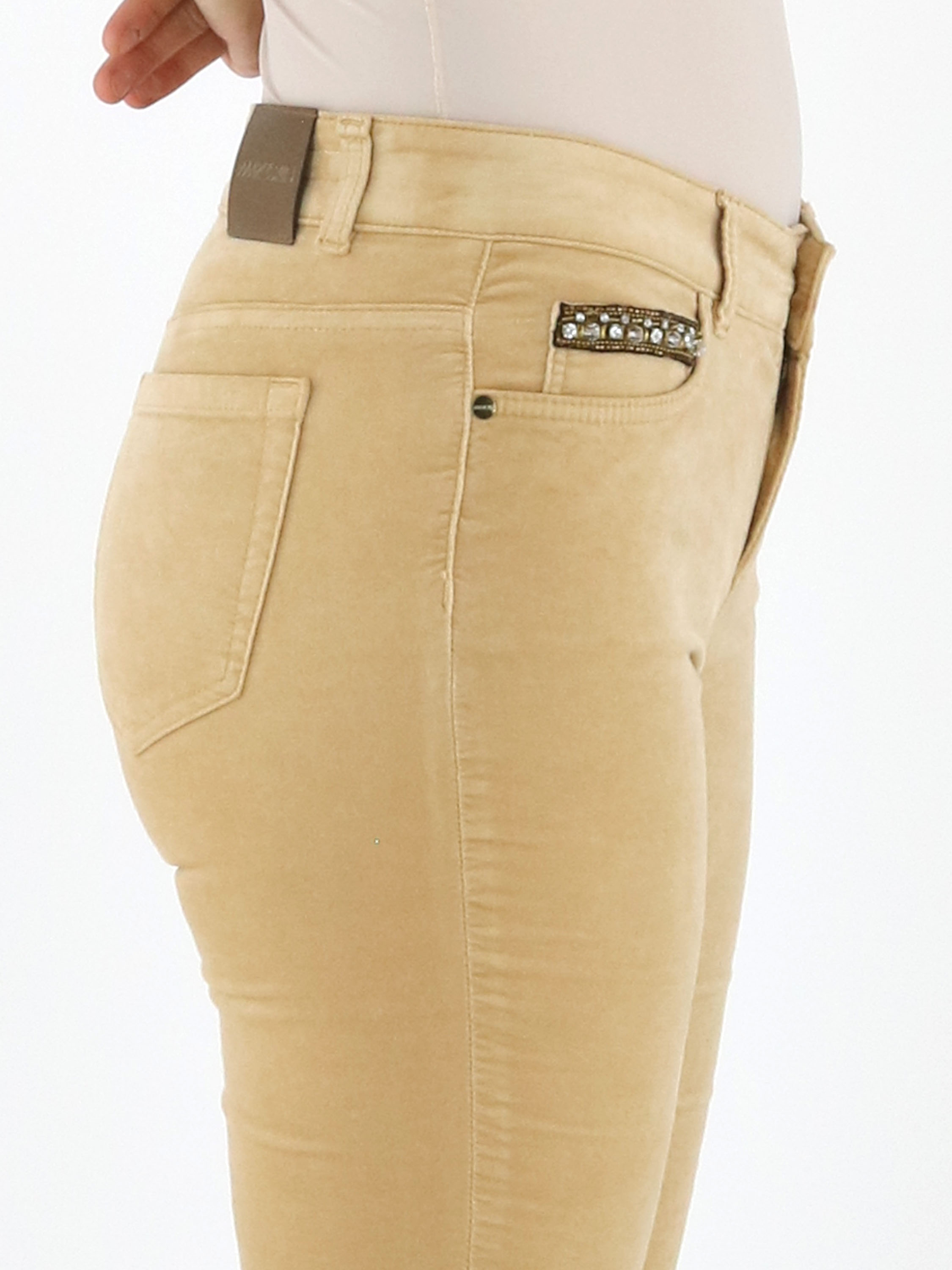 Samthose von Marc Cain in der Farbe Camel. Im 5-Pocket-Stil gearbeitet und mit Strasssteinen entlang des kleinen Vordertaschenrands verziert. Diese Hose kann bei 30 Grad gewaschen werden.