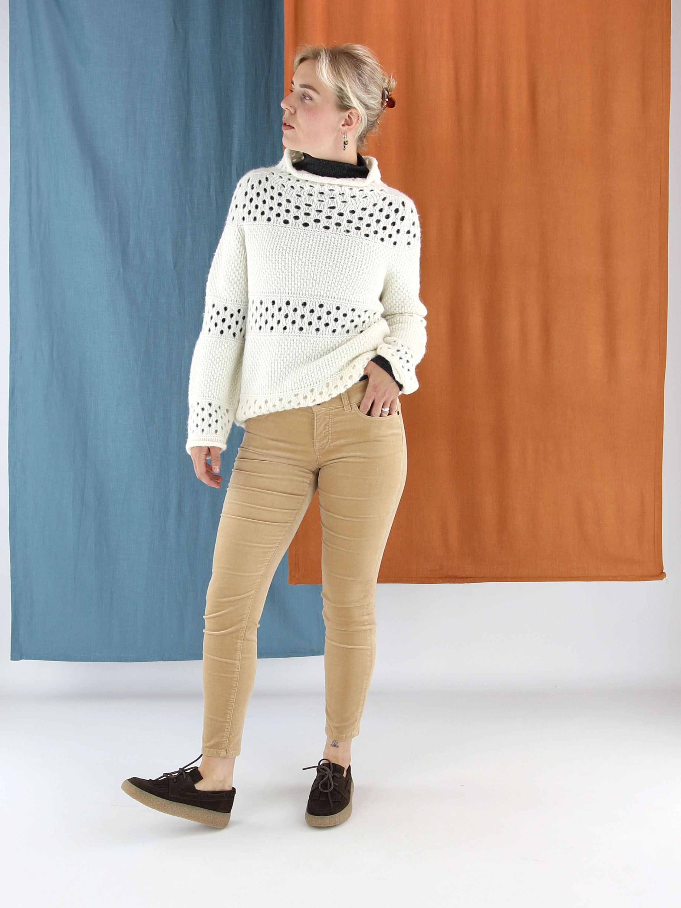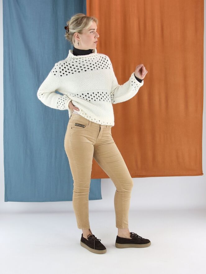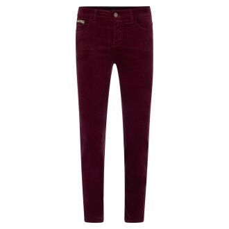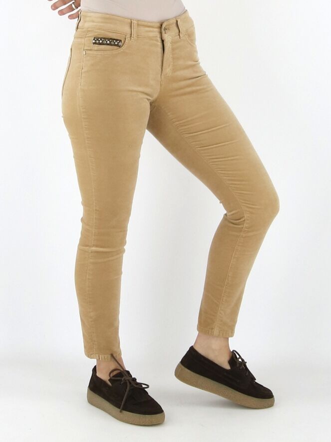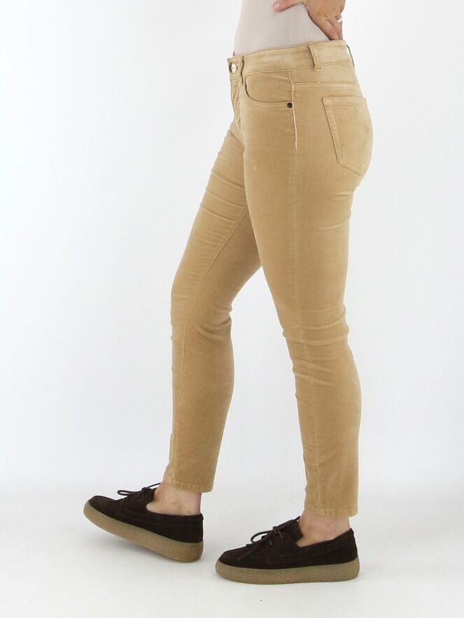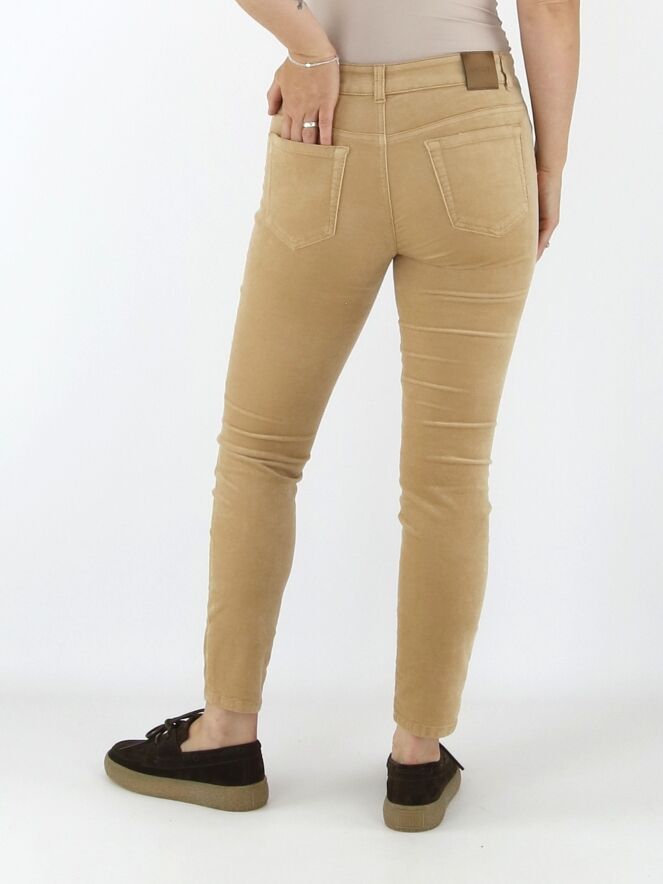 Samthose von Marc Cain in der Farbe Camel. Im 5-Pocket-Stil gearbeitet und mit Strasssteinen entlang des kleinen Vordertaschenrands verziert. Diese Hose kann bei 30 Grad gewaschen werden.