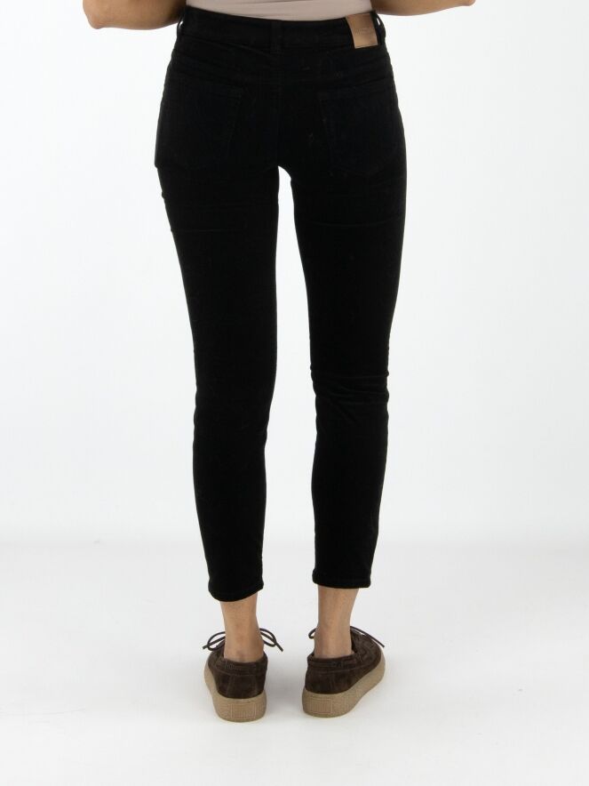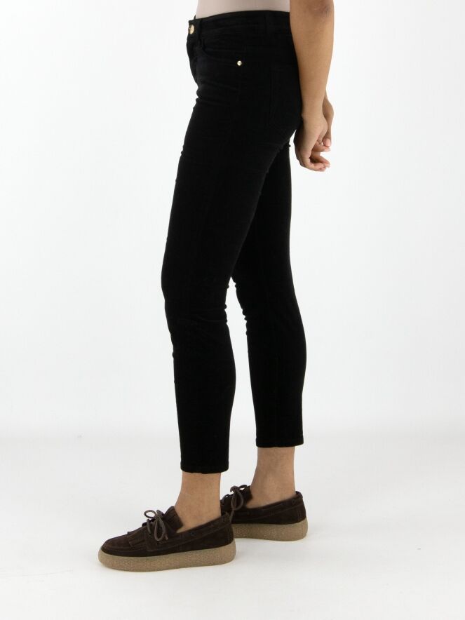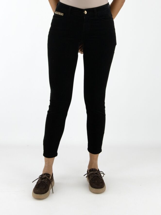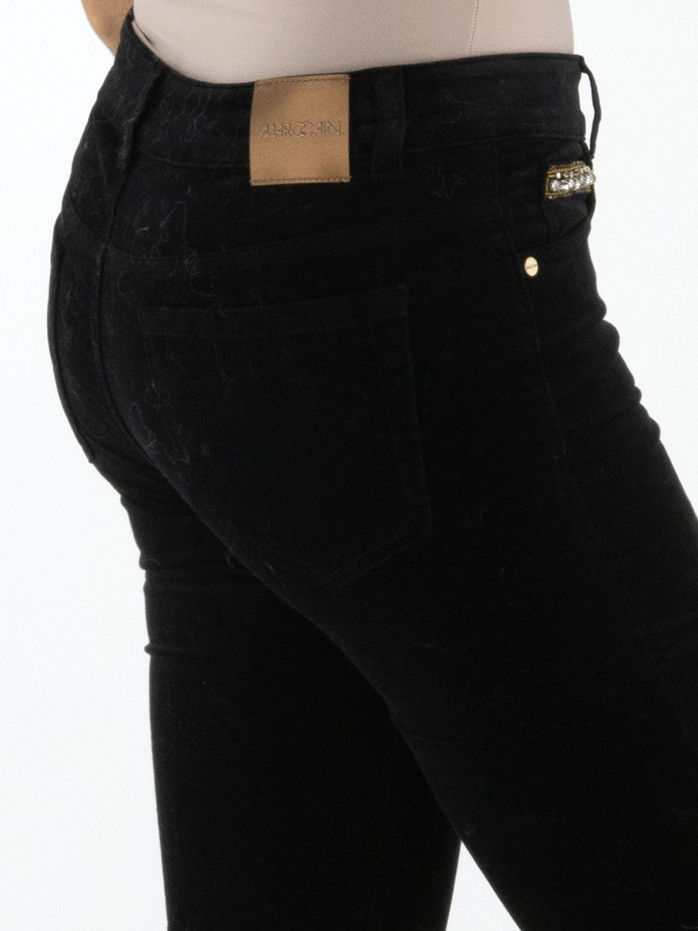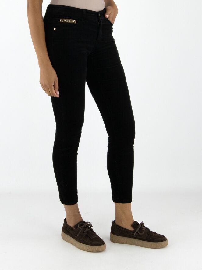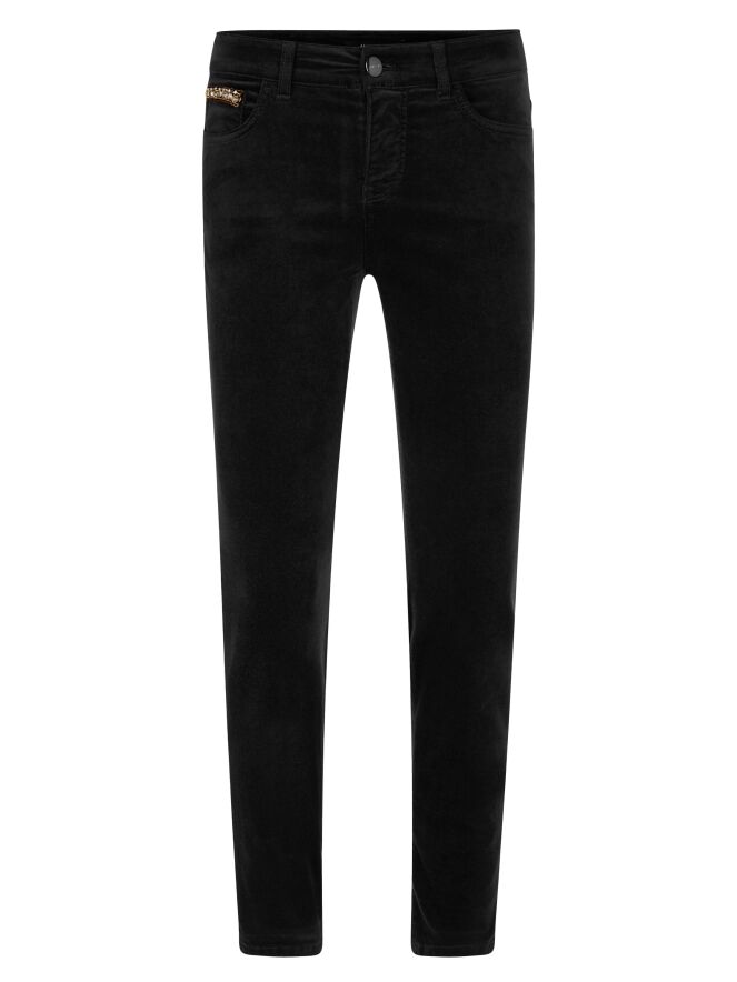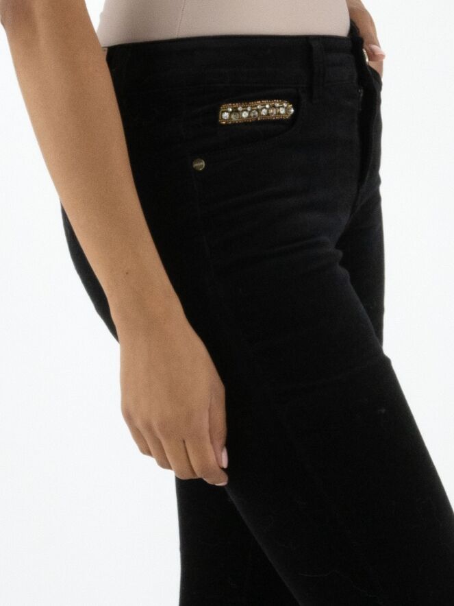 Samthose von Marc Cain in Schwarz. Sie ist im 5-Pocket-Stil gefertigt und entlang des kleinen Vordertaschenrands mit Strasssteinen verziert. Diese Hose kann bei 30 Grad gewaschen werden.