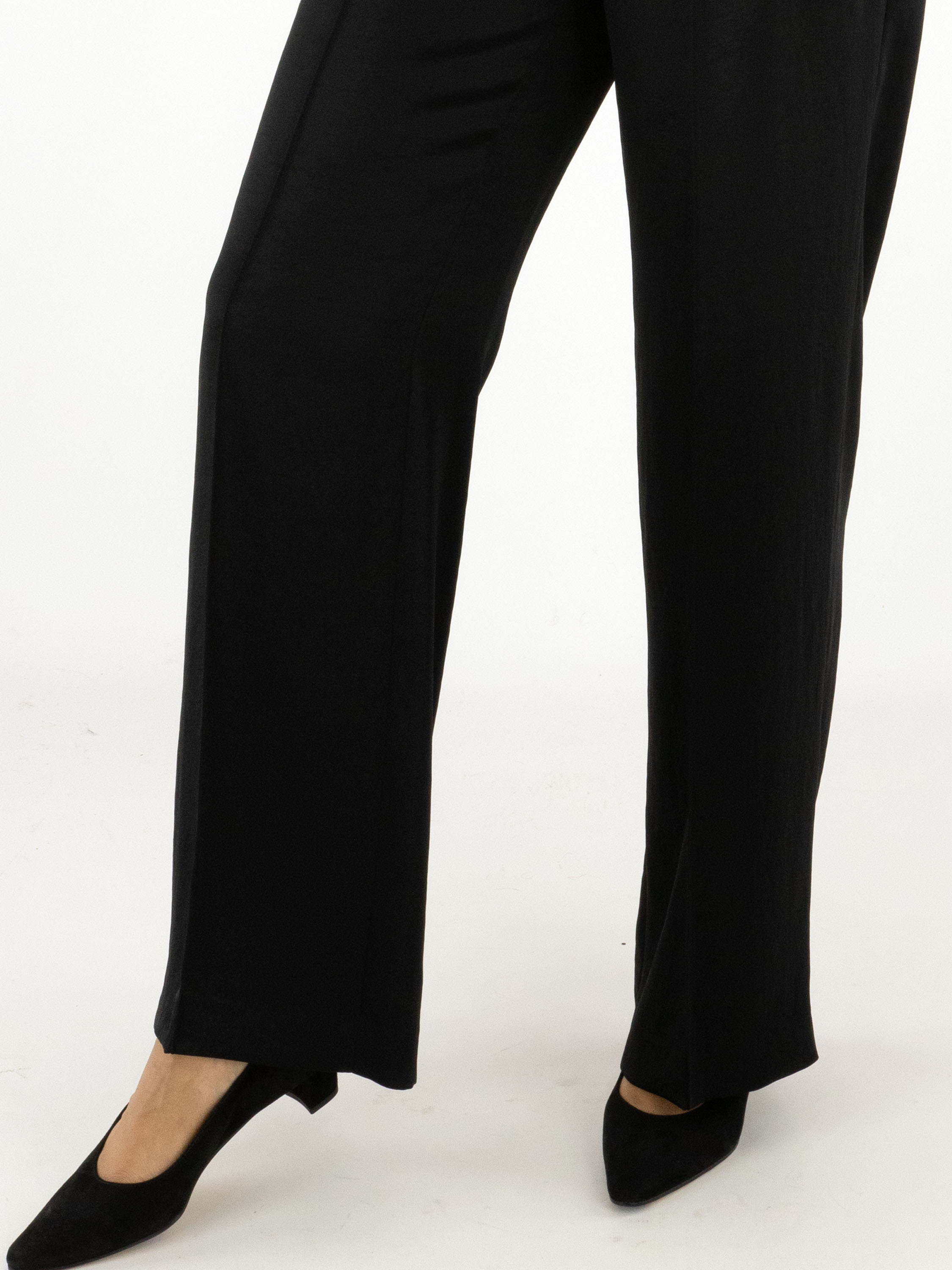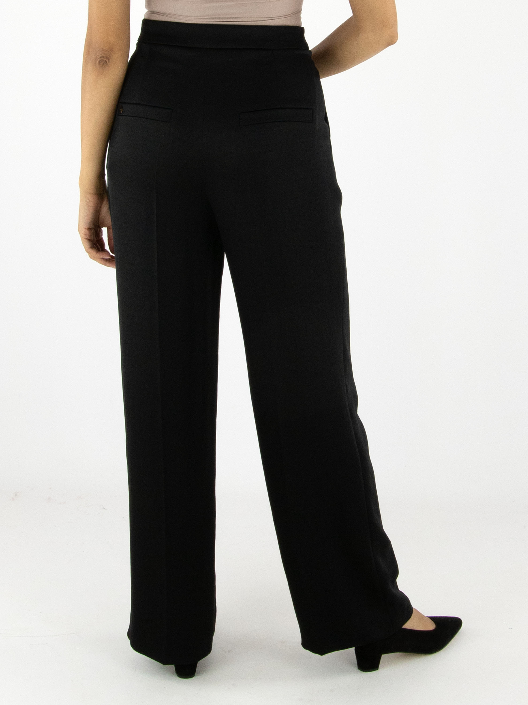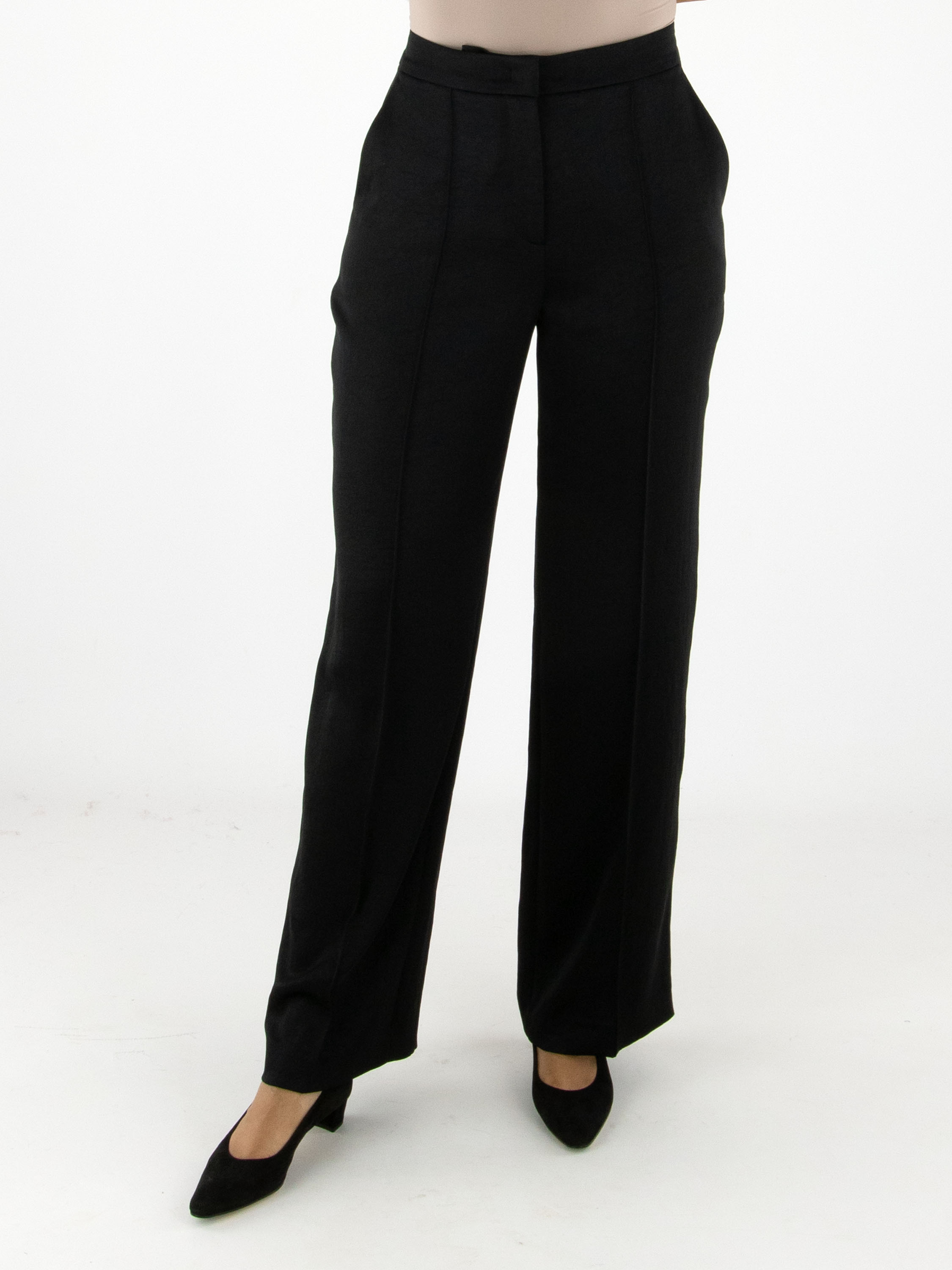 Mattsatin-Hose von Marc Cain in Schwarz. Auf der Vorderseite der Hosenbeine verläuft eine umgekehrte Naht, auf der Rückseite eine eingepresste Bügelfalte. Die Hose hat Eingrifftaschen und darf bei 30 Grad gewaschen werden.