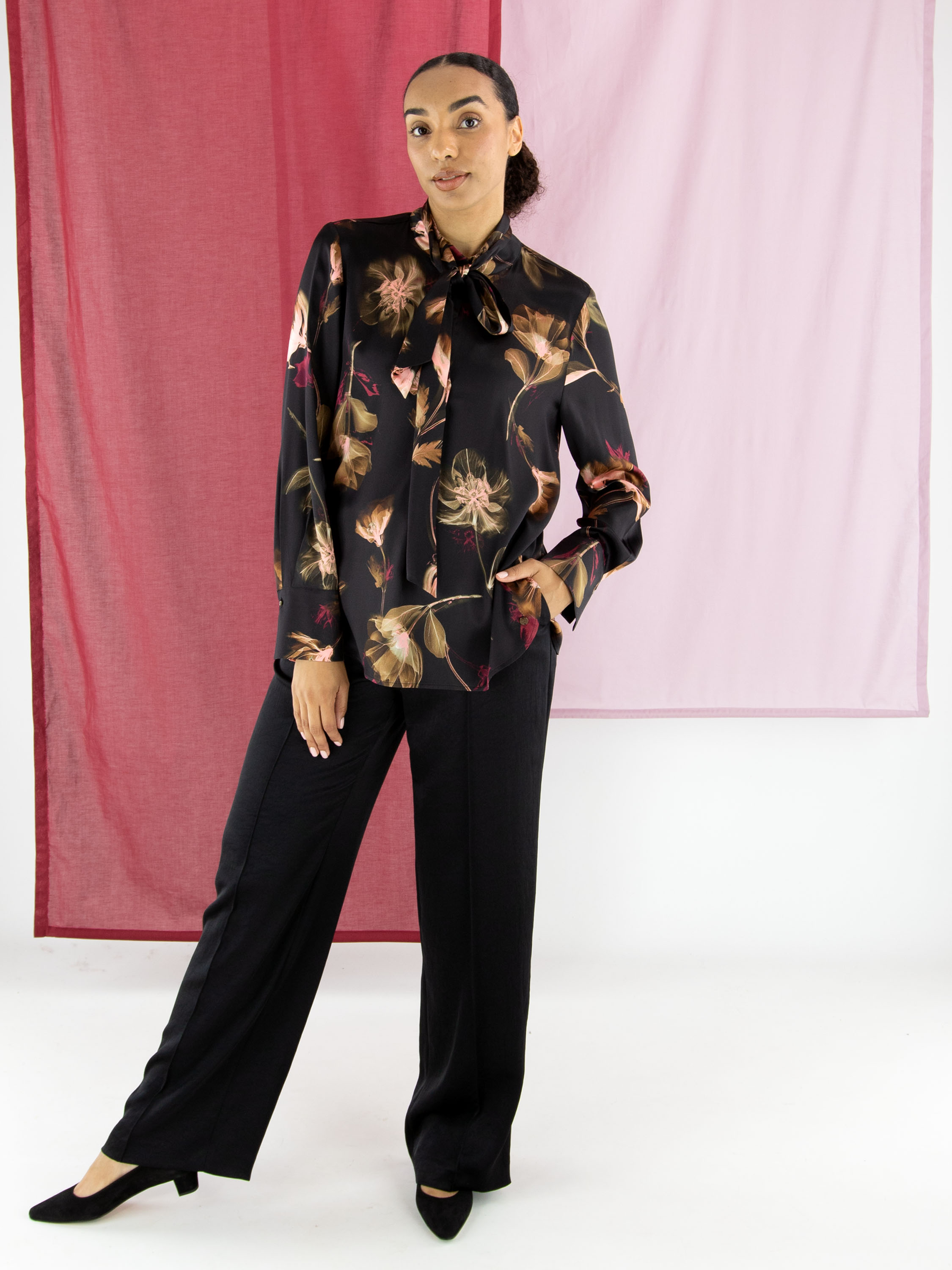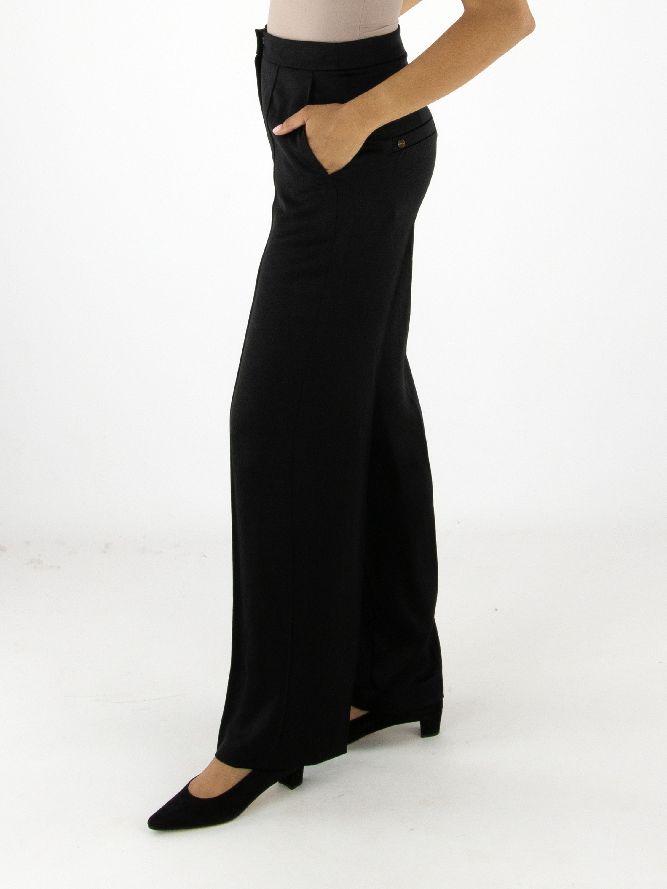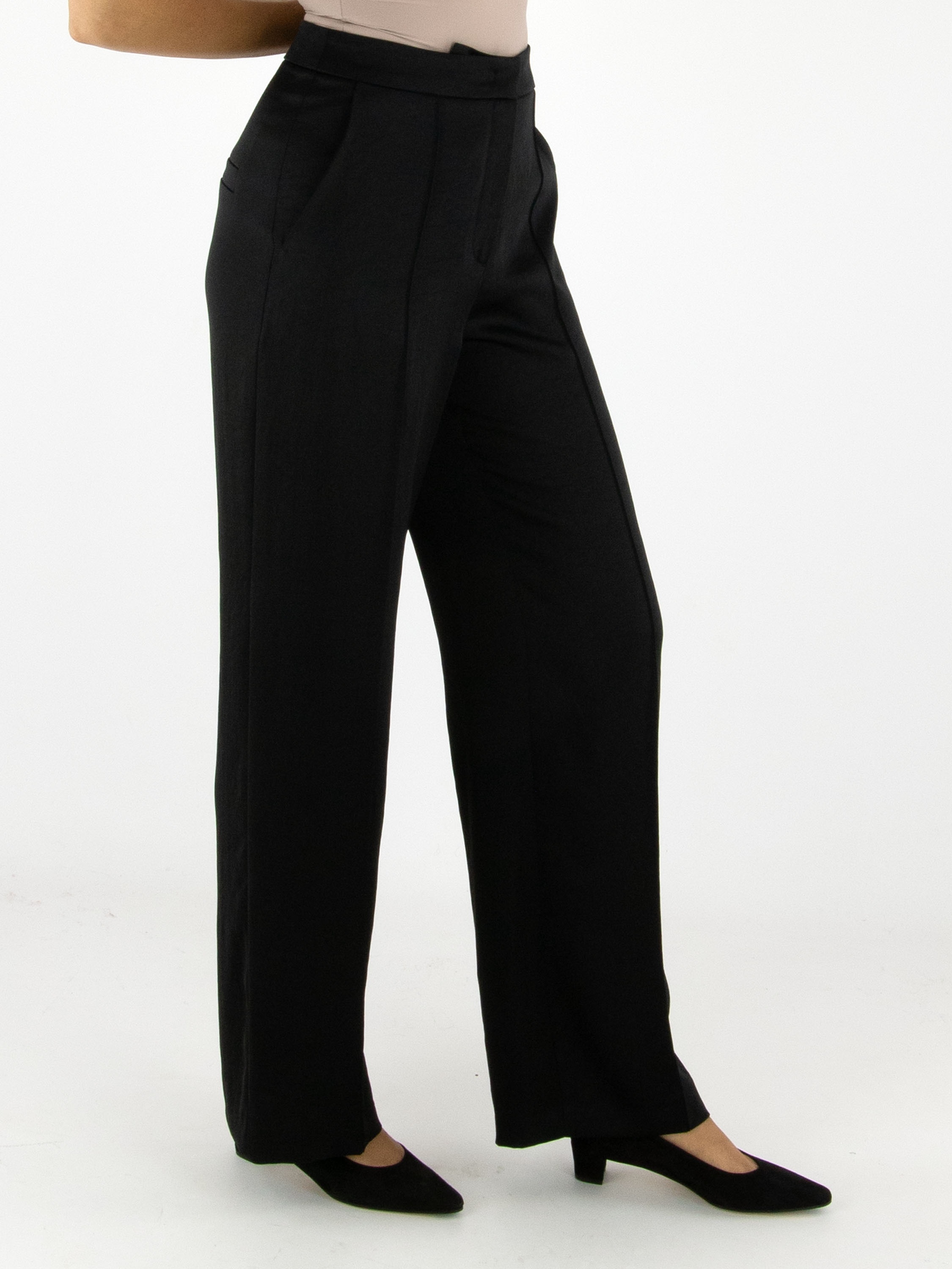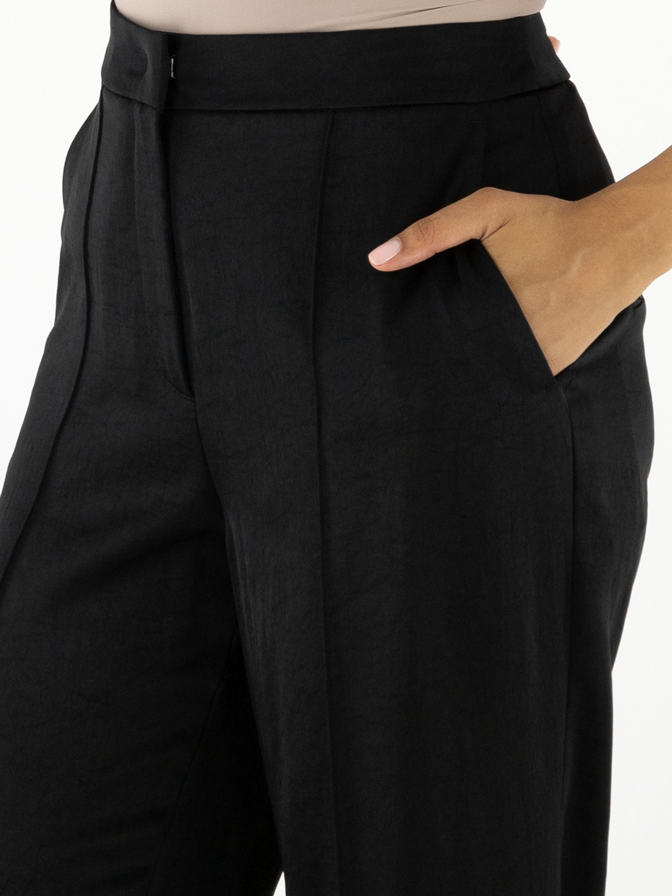Mattsatin-Hose von Marc Cain in Schwarz. Auf der Vorderseite der Hosenbeine verläuft eine umgekehrte Naht, auf der Rückseite eine eingepresste Bügelfalte. Die Hose hat Eingrifftaschen und darf bei 30 Grad gewaschen werden.