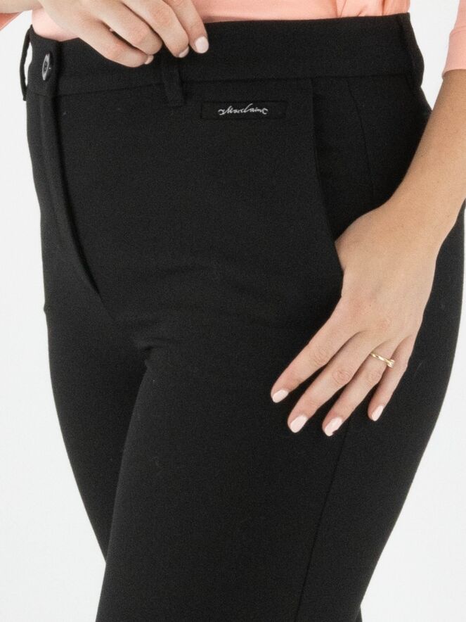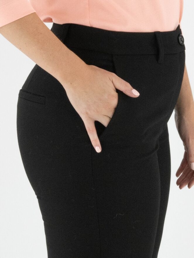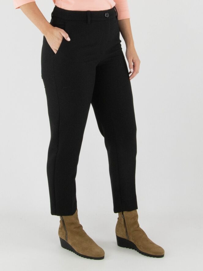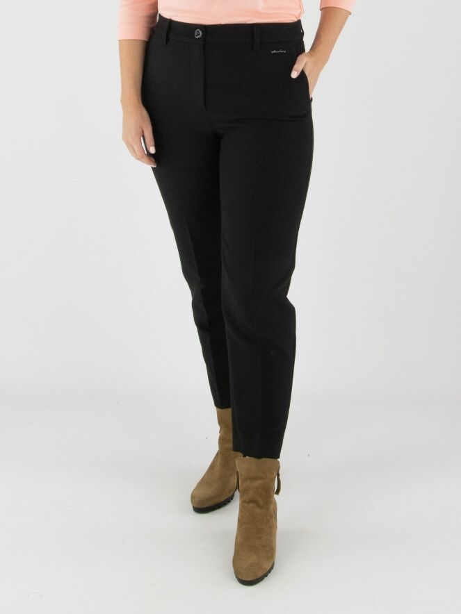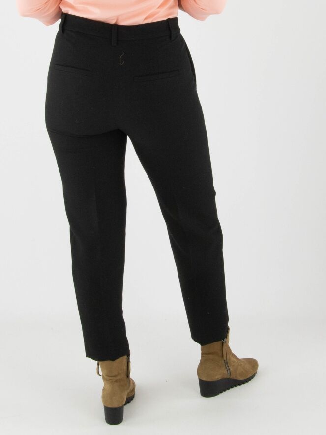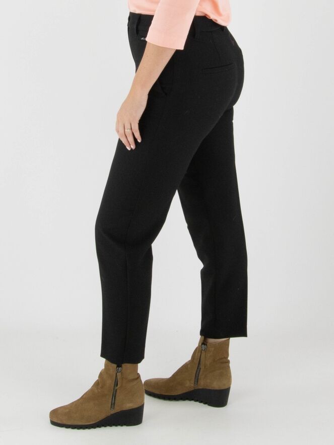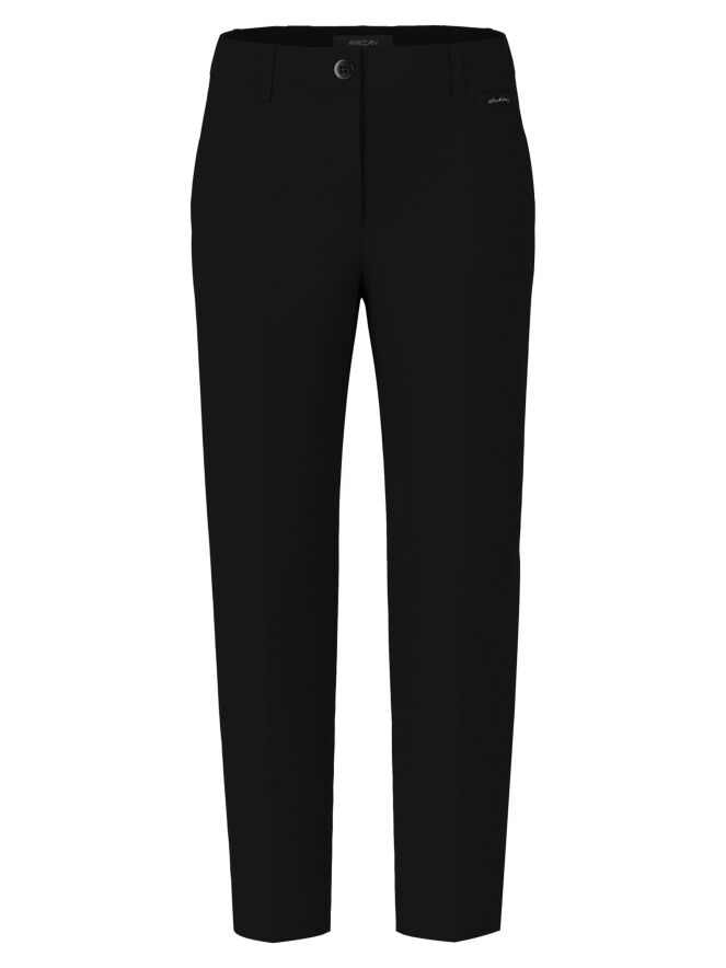 Hose von Marc Cain in Schwarz. Eine eingepresste Bügelfalte verläuft entlang der Vorderseite der Hosenbeine. Die Hose hat seitliche Eingrifftaschen und darf bei 30 Grad gewaschen werden.
