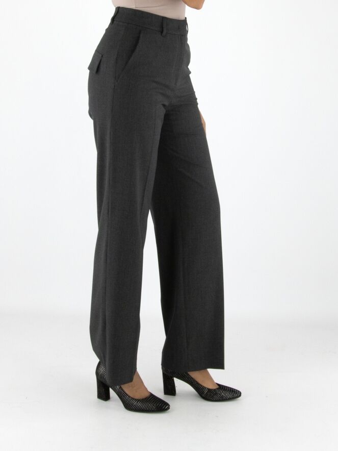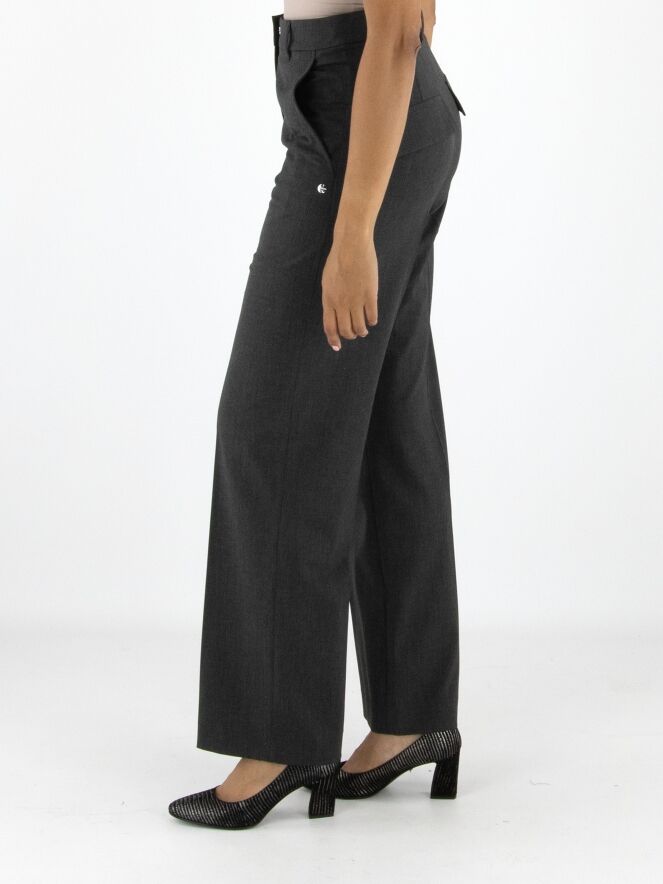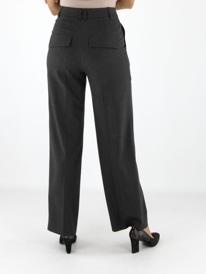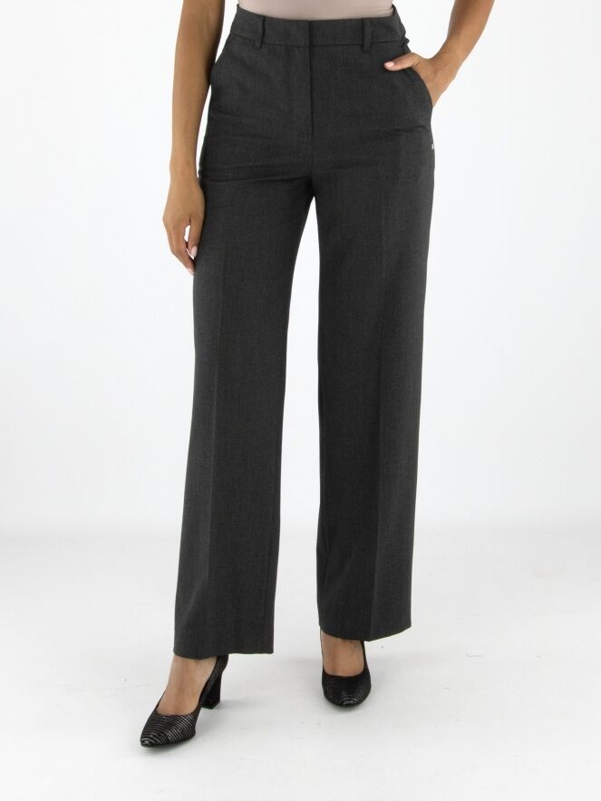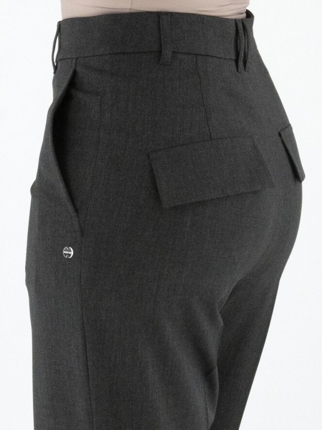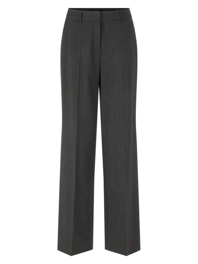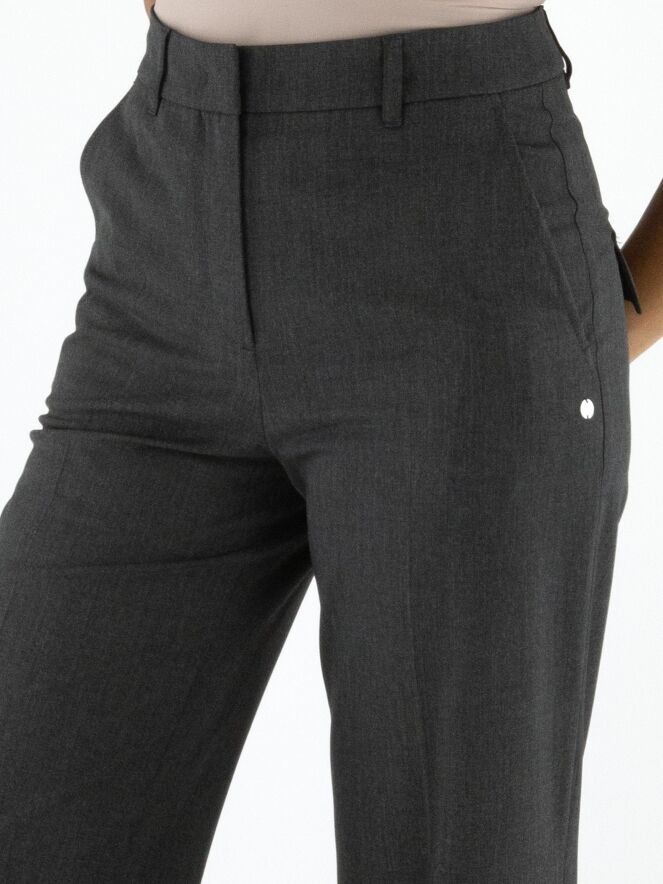 Gerade geschnittene Hose von Marc Cain in Grau. Eine gebügelte Bügelfalte verläuft mittig über die Hosenbeine und verleiht der Hose eine elegante, gepflegte Ausstrahlung. Die Hose ist mit Eingrifftaschen versehen und kann bei 30 Grad gewaschen werden.