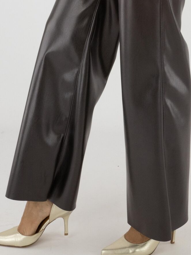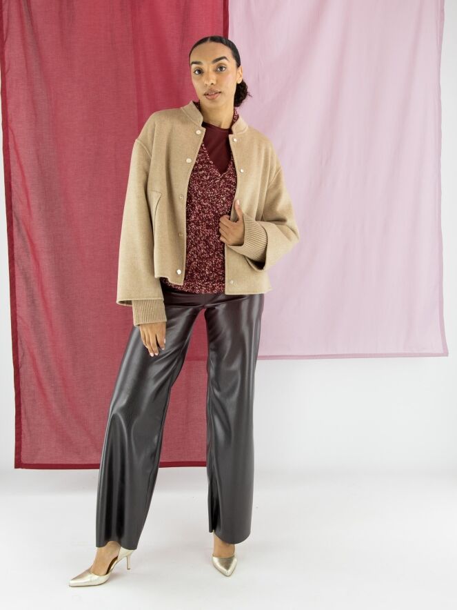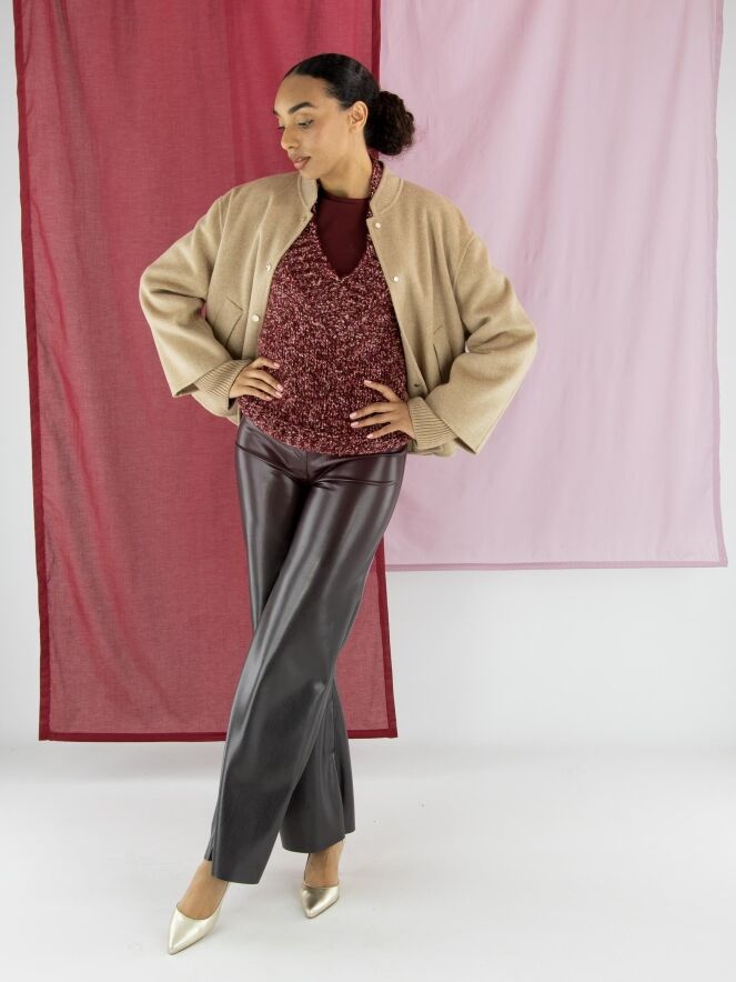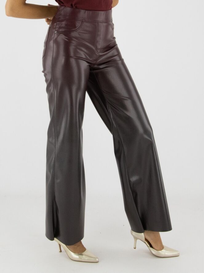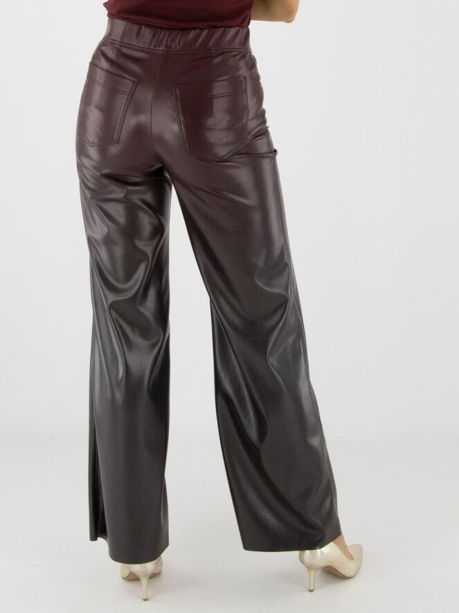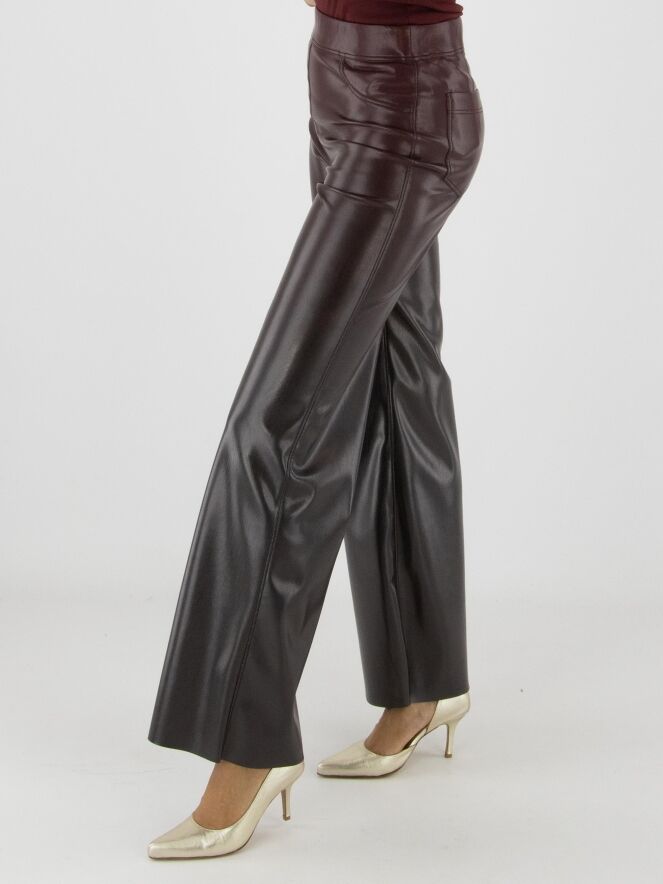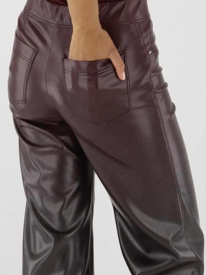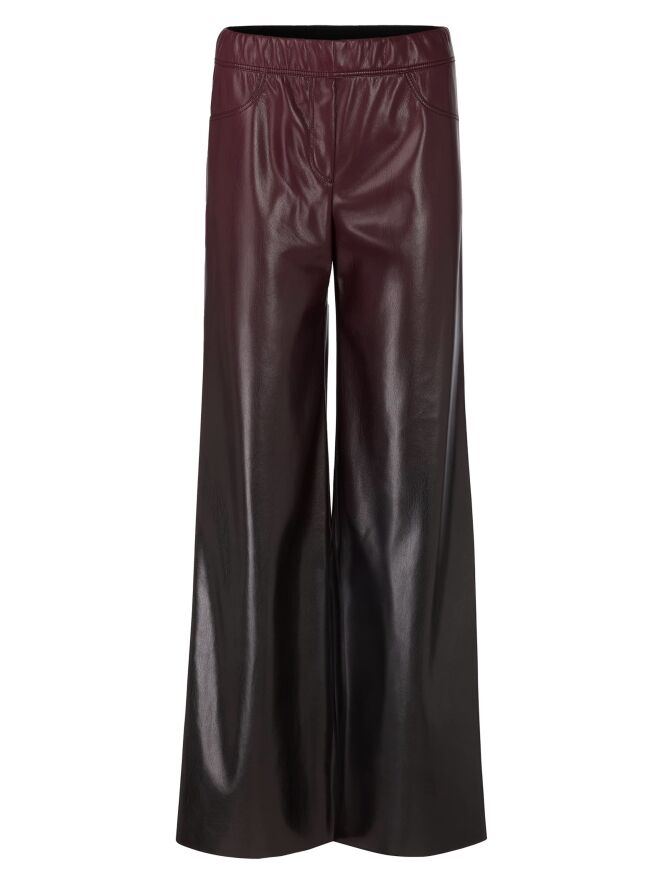 Kunstlederhose von Marc Cain in Auberginerot. Die Hose ist gerade geschnitten und hat einen elastischen Bund. Diese Hose kann bei 30 Grad gewaschen werden.