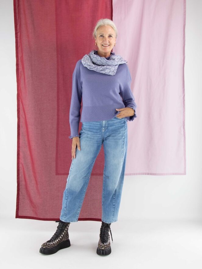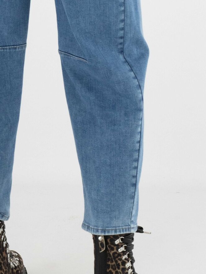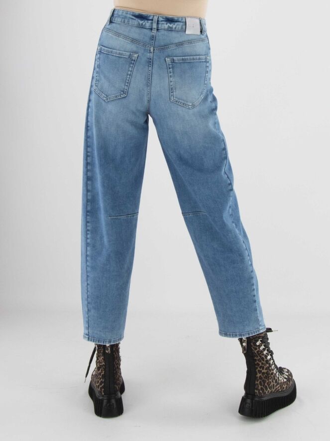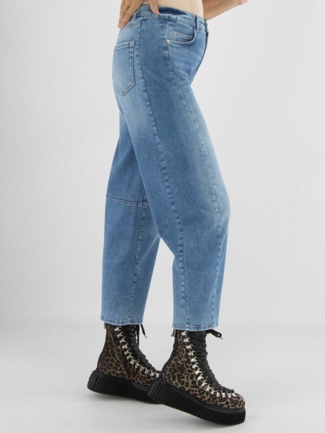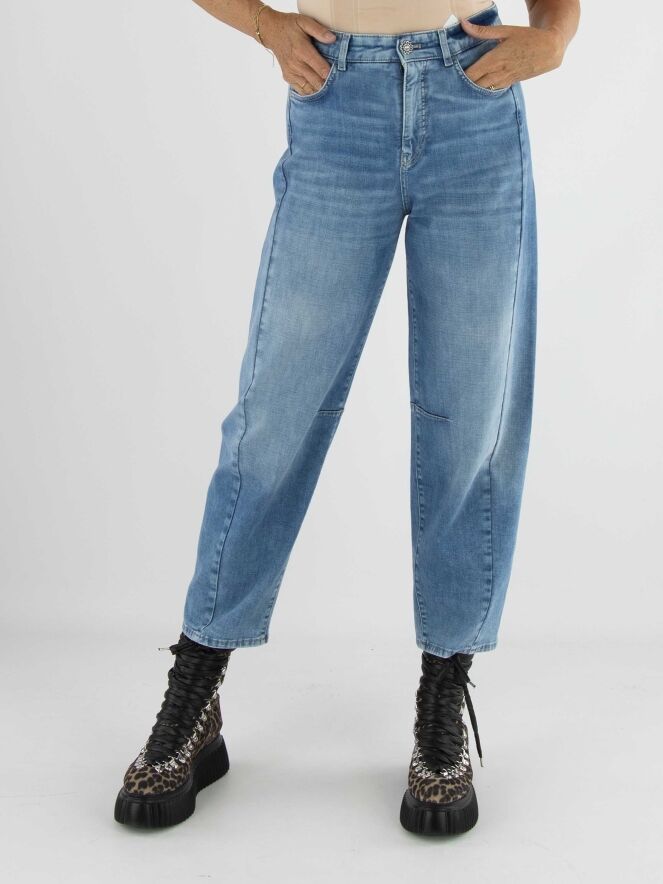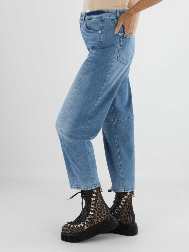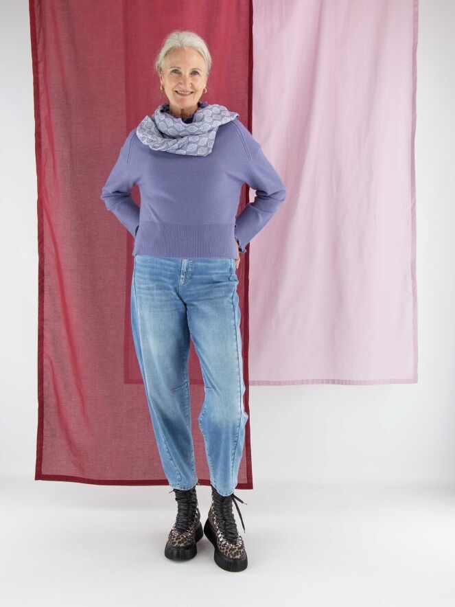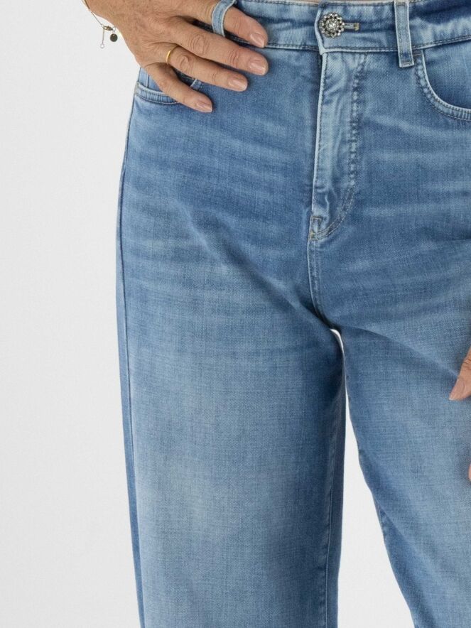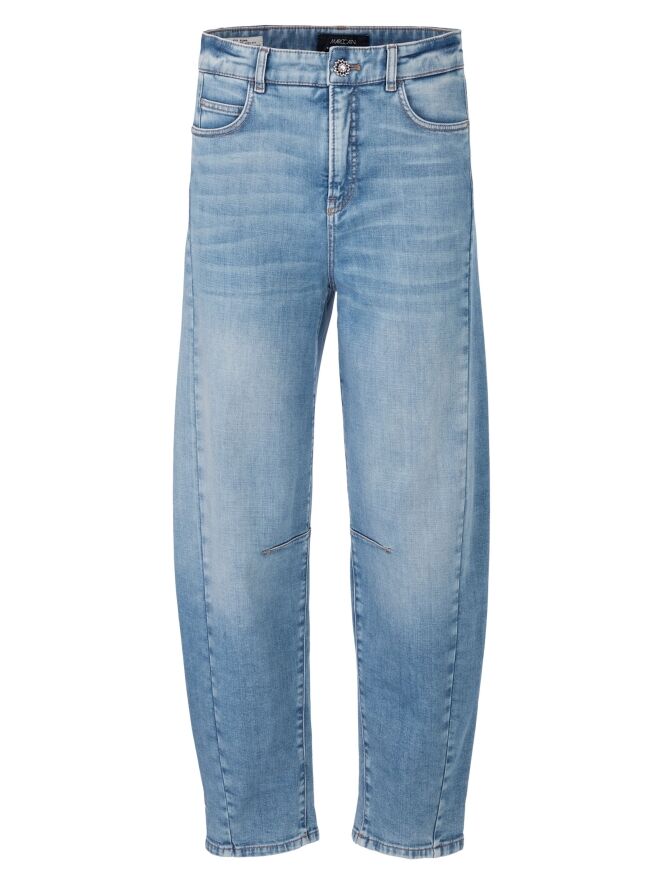 Gewaschene Jeans von Marc Cain in einem hellen Denimton. Das 5-Pocket-Modell hat eine formgebende Naht auf Kniehöhe. Diese Jeans kann bei 30 Grad gewaschen werden.