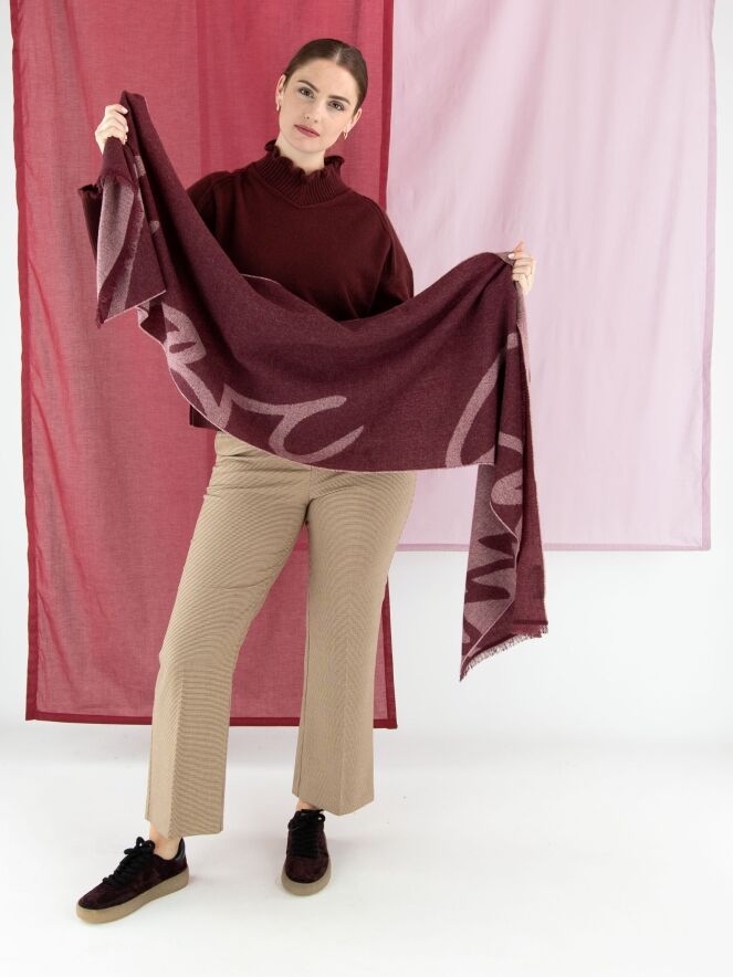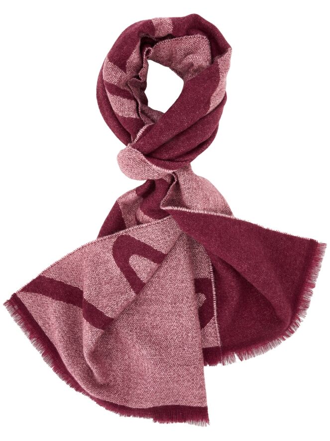 Ein Schal von Marc Cain in der Farbe Lila. Der Text „MARC CAIN“ ist in den Schal eingearbeitet. Die Enden des Schals sind fein ausgefranst. Dieser Schal darf von Hand gewaschen werden.