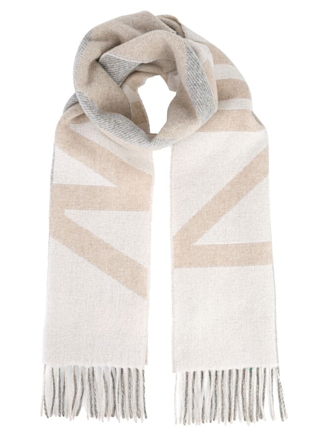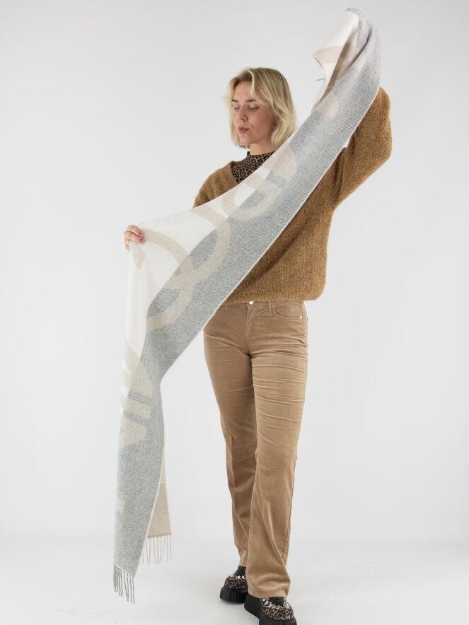 Luxuriöser Marc Cain Schal mit grafischem Muster und dem eingewebten Schriftzug „MARC CAIN“ in mehreren Beigetönen. Die Enden des Schals sind mit langen Fransen versehen. Dieser Schal sollte von Hand gewaschen werden.